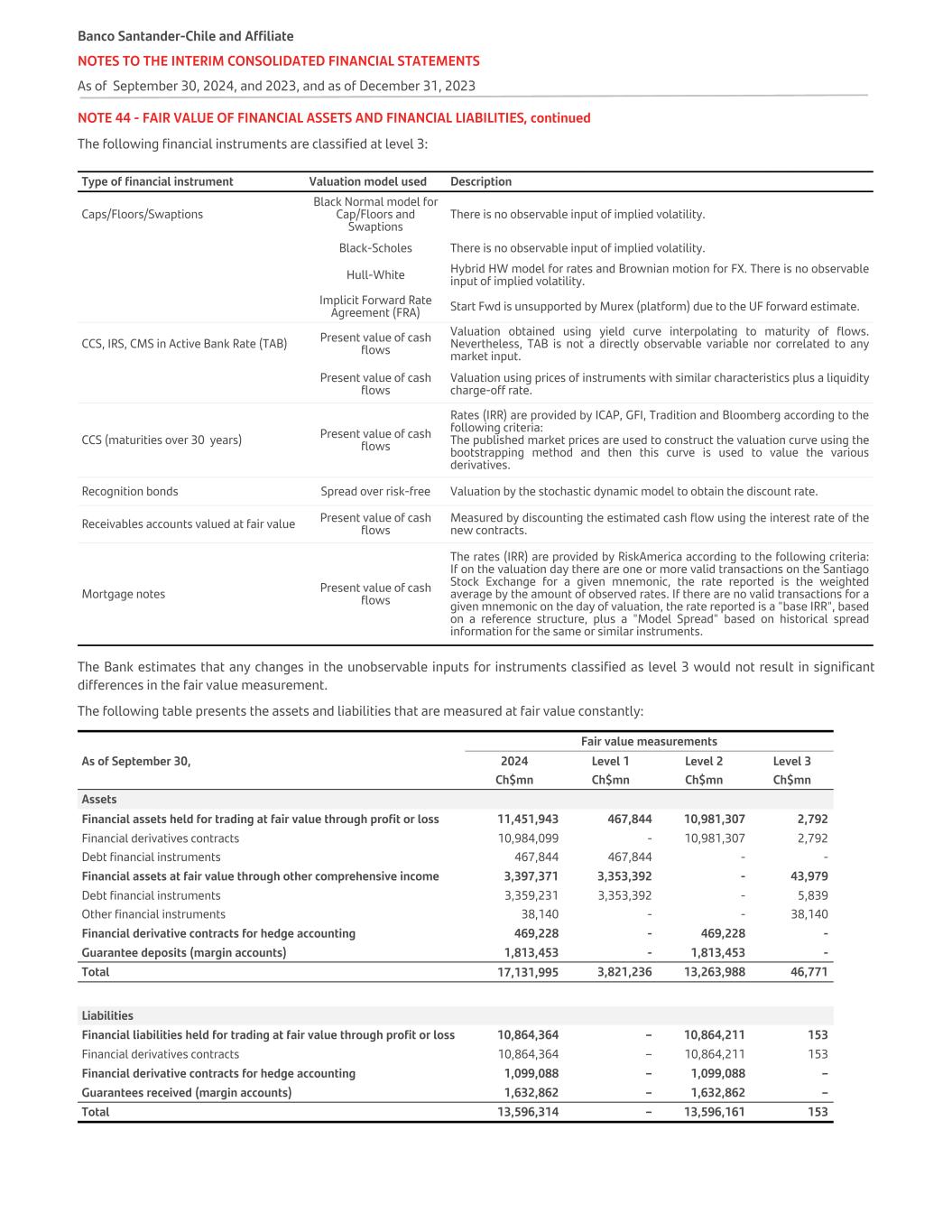 NOTE 44 - FAIR VALUE OF FINANCIAL ASSETS AND FINANCIAL LIABILITIES, continued The following financial instruments are classified at level 3: Type of financial instrument Valuation model used Description Caps/Floors/Swaptions Black Normal model for Cap/Floors and Swaptions There is no observable input of implied volatility. Black-Scholes There is no observable input of implied volatility. Hull-White Hybrid HW model for rates and Brownian motion for FX. There is no observable input of implied volatility. Implicit Forward Rate Agreement (FRA) Start Fwd is unsupported by Murex (platform) due to the UF forward estimate. CCS, IRS, CMS in Active Bank Rate (TAB) Present value of cash flows Valuation obtained using yield curve interpolating to maturity of flows. Nevertheless, TAB is not a directly observable variable nor correlated to any market input. Present value of cash flows Valuation using prices of instruments with similar characteristics plus a liquidity charge-off rate. CCS (maturities over 30 years) Present value of cash flows Rates (IRR) are provided by ICAP, GFI, Tradition and Bloomberg according to the following criteria: The published market prices are used to construct the valuation curve using the bootstrapping method and then this curve is used to value the various derivatives. Recognition bonds Spread over risk-free Valuation by the stochastic dynamic model to obtain the discount rate. Receivables accounts valued at fair value Present value of cash flows Measured by discounting the estimated cash flow using the interest rate of the new contracts. Mortgage notes Present value of cash flows The rates (IRR) are provided by RiskAmerica according to the following criteria: If on the valuation day there are one or more valid transactions on the Santiago Stock Exchange for a given mnemonic, the rate reported is the weighted average by the amount of observed rates. If there are no valid transactions for a given mnemonic on the day of valuation, the rate reported is a "base IRR", based on a reference structure, plus a "Model Spread" based on historical spread information for the same or similar instruments. The Bank estimates that any changes in the unobservable inputs for instruments classified as level 3 would not result in significant differences in the fair value measurement. The following table presents the assets and liabilities that are measured at fair value constantly: Fair value measurements As of September 30, 2024 Level 1 Level 2 Level 3 Ch$mn Ch$mn Ch$mn Ch$mn Assets Financial assets held for trading at fair value through profit or loss 11,451,943 467,844 10,981,307 2,792 Financial derivatives contracts 10,984,099 - 10,981,307 2,792 Debt financial instruments 467,844 467,844 - - Financial assets at fair value through other comprehensive income 3,397,371 3,353,392 - 43,979 Debt financial instruments 3,359,231 3,353,392 - 5,839 Other financial instruments 38,140 - - 38,140 Financial derivative contracts for hedge accounting 469,228 - 469,228 - Guarantee deposits (margin accounts) 1,813,453 - 1,813,453 - Total 17,131,995 3,821,236 13,263,988 46,771 Liabilities Financial liabilities held for trading at fair value through profit or loss 10,864,364 – 10,864,211 153 Financial derivatives contracts 10,864,364 – 10,864,211 153 Financial derivative contracts for hedge accounting 1,099,088 – 1,099,088 – Guarantees received (margin accounts) 1,632,862 – 1,632,862 – Total 13,596,314 – 13,596,161 153 Banco Santander-Chile and Affiliate NOTES TO THE INTERIM CONSOLIDATED FINANCIAL STATEMENTS As of September 30, 2024, and 2023, and as of December 31, 2023