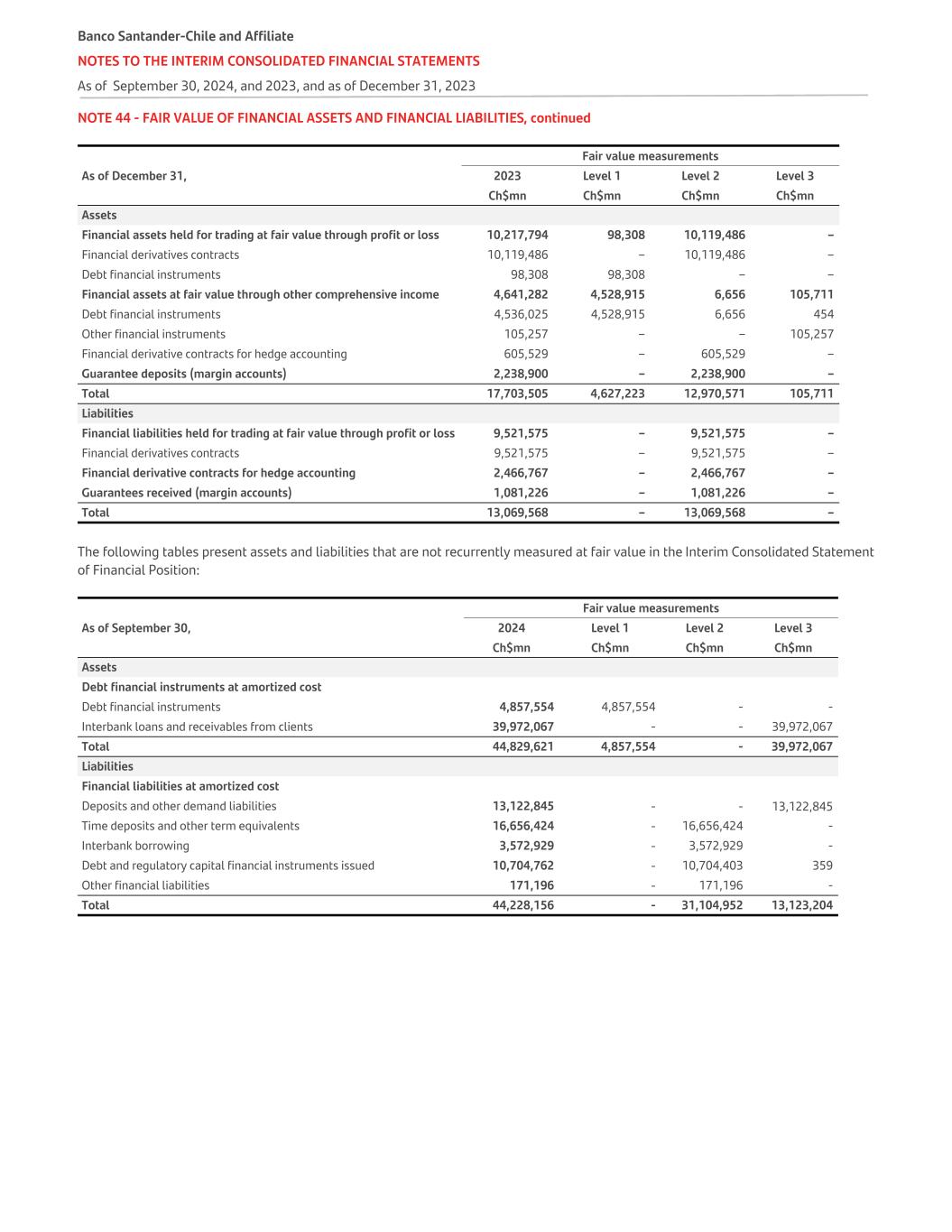 NOTE 44 - FAIR VALUE OF FINANCIAL ASSETS AND FINANCIAL LIABILITIES, continued Fair value measurements As of December 31, 2023 Level 1 Level 2 Level 3 Ch$mn Ch$mn Ch$mn Ch$mn Assets Financial assets held for trading at fair value through profit or loss 10,217,794 98,308 10,119,486 – Financial derivatives contracts 10,119,486 – 10,119,486 – Debt financial instruments 98,308 98,308 – – Financial assets at fair value through other comprehensive income 4,641,282 4,528,915 6,656 105,711 Debt financial instruments 4,536,025 4,528,915 6,656 454 Other financial instruments 105,257 – – 105,257 Financial derivative contracts for hedge accounting 605,529 – 605,529 – Guarantee deposits (margin accounts) 2,238,900 – 2,238,900 – Total 17,703,505 4,627,223 12,970,571 105,711 Liabilities Financial liabilities held for trading at fair value through profit or loss 9,521,575 – 9,521,575 – Financial derivatives contracts 9,521,575 – 9,521,575 – Financial derivative contracts for hedge accounting 2,466,767 – 2,466,767 – Guarantees received (margin accounts) 1,081,226 – 1,081,226 – Total 13,069,568 – 13,069,568 – The following tables present assets and liabilities that are not recurrently measured at fair value in the Interim Consolidated Statement of Financial Position: Fair value measurements As of September 30, 2024 Level 1 Level 2 Level 3 Ch$mn Ch$mn Ch$mn Ch$mn Assets Debt financial instruments at amortized cost Debt financial instruments 4,857,554 4,857,554 - - Interbank loans and receivables from clients 39,972,067 - - 39,972,067 Total 44,829,621 4,857,554 - 39,972,067 Liabilities Financial liabilities at amortized cost Deposits and other demand liabilities 13,122,845 - - 13,122,845 Time deposits and other term equivalents 16,656,424 - 16,656,424 - Interbank borrowing 3,572,929 - 3,572,929 - Debt and regulatory capital financial instruments issued 10,704,762 - 10,704,403 359 Other financial liabilities 171,196 - 171,196 - Total 44,228,156 - 31,104,952 13,123,204 Banco Santander-Chile and Affiliate NOTES TO THE INTERIM CONSOLIDATED FINANCIAL STATEMENTS As of September 30, 2024, and 2023, and as of December 31, 2023