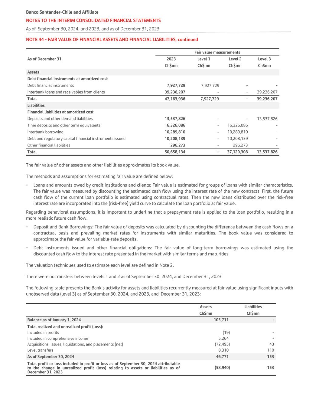 NOTE 44 - FAIR VALUE OF FINANCIAL ASSETS AND FINANCIAL LIABILITIES, continued Fair value measurements As of December 31, 2023 Level 1 Level 2 Level 3 Ch$mn Ch$mn Ch$mn Ch$mn Assets Debt financial instruments at amortized cost Debt financial instruments 7,927,729 7,927,729 - - Interbank loans and receivables from clients 39,236,207 - - 39,236,207 Total 47,163,936 7,927,729 - 39,236,207 Liabilities Financial liabilities at amortized cost Deposits and other demand liabilities 13,537,826 - - 13,537,826 Time deposits and other term equivalents 16,326,086 - 16,326,086 - Interbank borrowing 10,289,810 - 10,289,810 - Debt and regulatory capital financial instruments issued 10,208,139 - 10,208,139 - Other financial liabilities 296,273 - 296,273 - Total 50,658,134 - 37,120,308 13,537,826 The fair value of other assets and other liabilities approximates its book value. The methods and assumptions for estimating fair value are defined below: • Loans and amounts owed by credit institutions and clients: Fair value is estimated for groups of loans with similar characteristics. The fair value was measured by discounting the estimated cash flow using the interest rate of the new contracts. First, the future cash flow of the current loan portfolio is estimated using contractual rates. Then the new loans distributed over the risk-free interest rate are incorporated into the (risk-free) yield curve to calculate the loan portfolio at fair value. Regarding behavioral assumptions, it is important to underline that a prepayment rate is applied to the loan portfolio, resulting in a more realistic future cash flow. • Deposit and Bank Borrowings: The fair value of deposits was calculated by discounting the difference between the cash flows on a contractual basis and prevailing market rates for instruments with similar maturities. The book value was considered to approximate the fair value for variable-rate deposits. • Debt instruments issued and other financial obligations: The fair value of long-term borrowings was estimated using the discounted cash flow to the interest rate presented in the market with similar terms and maturities. The valuation techniques used to estimate each level are defined in Note 2. There were no transfers between levels 1 and 2 as of September 30, 2024, and December 31, 2023. The following table presents the Bank's activity for assets and liabilities recurrently measured at fair value using significant inputs with unobserved data (level 3) as of September 30, 2024, and 2023, and December 31, 2023: Assets Liabilities   Ch$mn Ch$mn Balance as of January 1, 2024 105,711 - Total realized and unrealized profit (loss): Included in profits (19) - Included in comprehensive income 5,264 - Acquisitions, issues, liquidations, and placements (net) (72,495) 43 Level transfers 8,310 110 As of September 30, 2024 46,771 153 Total profit or loss included in profit or loss as of September 30, 2024 attributable to the change in unrealized profit (loss) relating to assets or liabilities as of December 31, 2023 (58,940) 153 Banco Santander-Chile and Affiliate NOTES TO THE INTERIM CONSOLIDATED FINANCIAL STATEMENTS As of September 30, 2024, and 2023, and as of December 31, 2023