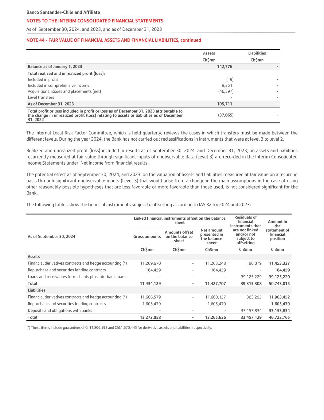 NOTE 44 - FAIR VALUE OF FINANCIAL ASSETS AND FINANCIAL LIABILITIES, continued Assets Liabilities   Ch$mn Ch$mn Balance as of January 1, 2023 142,776 - Total realized and unrealized profit (loss): Included in profit (19) - Included in comprehensive income 9,351 - Acquisitions, issues and placements (net) (46,397) - Level transfers - - As of December 31, 2023 105,711 - Total profit or loss included in profit or loss as of December 31, 2023 attributable to the change in unrealized profit (loss) relating to assets or liabilities as of December 31, 2022 (37,065) - The internal Local Risk Factor Committee, which is held quarterly, reviews the cases in which transfers must be made between the different levels. During the year 2024, the Bank has not carried out reclassifications in instruments that were at level 3 to level 2. Realized and unrealized profit (loss) included in results as of September 30, 2024, and December 31, 2023, on assets and liabilities recurrently measured at fair value through significant inputs of unobservable data (Level 3) are recorded in the Interim Consolidated Income Statements under 'Net income from financial results'. The potential effect as of September 30, 2024, and 2023, on the valuation of assets and liabilities measured at fair value on a recurring basis through significant unobservable inputs (Level 3) that would arise from a change in the main assumptions in the case of using other reasonably possible hypotheses that are less favorable or more favorable than those used, is not considered significant for the Bank. The following tables show the financial instruments subject to offsetting according to IAS 32 for 2024 and 2023: Linked financial instruments offset on the balance sheet Residuals of financial instruments that are not linked and/or not subject to offsetting Amount in the statement of financial positionAs of September 30, 2024 Gross amounts Amounts offset on the balance sheet Net amount presented in the balance sheet Ch$mn Ch$mn Ch$mn Ch$mn Ch$mn Assets Financial derivatives contracts and hedge accounting (*) 11,269,670 - 11,263,248 190,079 11,453,327 Repurchase and securities lending contracts 164,459 - 164,459 - 164,459 Loans and receivables form clients plus interbank loans - - - 39,125,229 39,125,229 Total 11,434,129 - 11,427,707 39,315,308 50,743,015 Liabilities Financial derivatives contracts and hedge accounting (*) 11,666,579 - 11,660,157 303,295 11,963,452 Repurchase and securities lending contracts 1,605,479 - 1,605,479 - 1,605,479 Deposits and obligations with banks - - - 33,153,834 33,153,834 Total 13,272,058 - 13,265,636 33,457,129 46,722,765 (*) These items include guarantees of Ch$1,806,592 and Ch$1,670,445 for derivative assets and liabilities, respectively. Banco Santander-Chile and Affiliate NOTES TO THE INTERIM CONSOLIDATED FINANCIAL STATEMENTS As of September 30, 2024, and 2023, and as of December 31, 2023