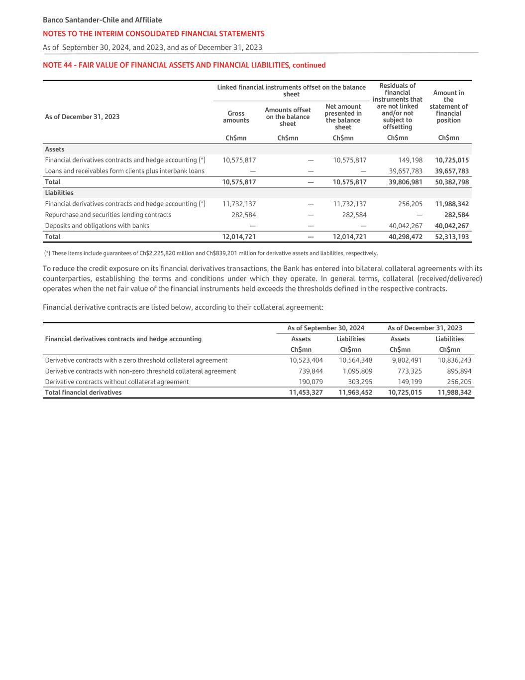 NOTE 44 - FAIR VALUE OF FINANCIAL ASSETS AND FINANCIAL LIABILITIES, continued Linked financial instruments offset on the balance sheet Residuals of financial instruments that are not linked and/or not subject to offsetting Amount in the statement of financial positionAs of December 31, 2023 Gross amounts Amounts offset on the balance sheet Net amount presented in the balance sheet Ch$mn Ch$mn Ch$mn Ch$mn Ch$mn Assets Financial derivatives contracts and hedge accounting (*) 10,575,817 — 10,575,817 149,198 10,725,015 Loans and receivables form clients plus interbank loans — — — 39,657,783 39,657,783 Total 10,575,817 — 10,575,817 39,806,981 50,382,798 Liabilities Financial derivatives contracts and hedge accounting (*) 11,732,137 — 11,732,137 256,205 11,988,342 Repurchase and securities lending contracts 282,584 — 282,584 — 282,584 Deposits and obligations with banks — — — 40,042,267 40,042,267 Total 12,014,721 — 12,014,721 40,298,472 52,313,193 (*) These items include guarantees of Ch$2,225,820 million and Ch$839,201 million for derivative assets and liabilities, respectively. To reduce the credit exposure on its financial derivatives transactions, the Bank has entered into bilateral collateral agreements with its counterparties, establishing the terms and conditions under which they operate. In general terms, collateral (received/delivered) operates when the net fair value of the financial instruments held exceeds the thresholds defined in the respective contracts. Financial derivative contracts are listed below, according to their collateral agreement: As of September 30, 2024 As of December 31, 2023 Financial derivatives contracts and hedge accounting Assets Liabilities Assets Liabilities Ch$mn Ch$mn Ch$mn Ch$mn Derivative contracts with a zero threshold collateral agreement 10,523,404 10,564,348 9,802,491 10,836,243 Derivative contracts with non-zero threshold collateral agreement 739,844 1,095,809 773,325 895,894 Derivative contracts without collateral agreement 190,079 303,295 149,199 256,205 Total financial derivatives 11,453,327 11,963,452 10,725,015 11,988,342 Banco Santander-Chile and Affiliate NOTES TO THE INTERIM CONSOLIDATED FINANCIAL STATEMENTS As of September 30, 2024, and 2023, and as of December 31, 2023