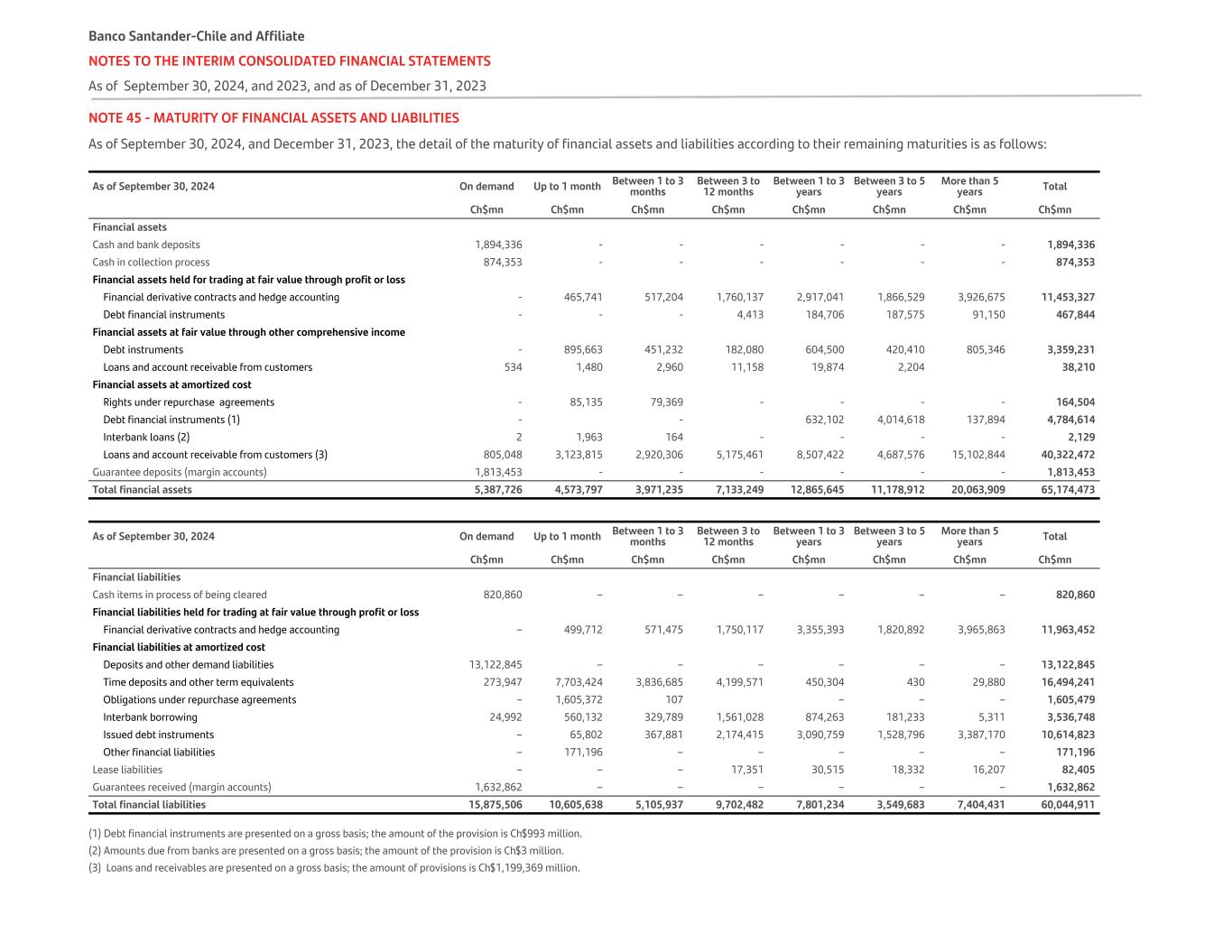 NOTE 45 - MATURITY OF FINANCIAL ASSETS AND LIABILITIES As of September 30, 2024, and December 31, 2023, the detail of the maturity of financial assets and liabilities according to their remaining maturities is as follows: As of September 30, 2024 On demand Up to 1 month Between 1 to 3 months Between 3 to 12 months Between 1 to 3 years Between 3 to 5 years More than 5 years Total Ch$mn Ch$mn Ch$mn Ch$mn Ch$mn Ch$mn Ch$mn Ch$mn Financial assets Cash and bank deposits 1,894,336 - - - - - - 1,894,336 Cash in collection process 874,353 - - - - - - 874,353 Financial assets held for trading at fair value through profit or loss Financial derivative contracts and hedge accounting - 465,741 517,204 1,760,137 2,917,041 1,866,529 3,926,675 11,453,327 Debt financial instruments - - - 4,413 184,706 187,575 91,150 467,844 Financial assets at fair value through other comprehensive income Debt instruments - 895,663 451,232 182,080 604,500 420,410 805,346 3,359,231 Loans and account receivable from customers 534 1,480 2,960 11,158 19,874 2,204 38,210 Financial assets at amortized cost Rights under repurchase agreements - 85,135 79,369 - - - - 164,504 Debt financial instruments (1) - - 632,102 4,014,618 137,894 4,784,614 Interbank loans (2) 2 1,963 164 - - - - 2,129 Loans and account receivable from customers (3) 805,048 3,123,815 2,920,306 5,175,461 8,507,422 4,687,576 15,102,844 40,322,472 Guarantee deposits (margin accounts) 1,813,453 - - - - - - 1,813,453 Total financial assets 5,387,726 4,573,797 3,971,235 7,133,249 12,865,645 11,178,912 20,063,909 65,174,473 As of September 30, 2024 On demand Up to 1 month Between 1 to 3 months Between 3 to 12 months Between 1 to 3 years Between 3 to 5 years More than 5 years Total Ch$mn Ch$mn Ch$mn Ch$mn Ch$mn Ch$mn Ch$mn Ch$mn Financial liabilities Cash items in process of being cleared 820,860 – – – – – – 820,860 Financial liabilities held for trading at fair value through profit or loss Financial derivative contracts and hedge accounting – 499,712 571,475 1,750,117 3,355,393 1,820,892 3,965,863 11,963,452 Financial liabilities at amortized cost Deposits and other demand liabilities 13,122,845 – – – – – – 13,122,845 Time deposits and other term equivalents 273,947 7,703,424 3,836,685 4,199,571 450,304 430 29,880 16,494,241 Obligations under repurchase agreements – 1,605,372 107 – – – 1,605,479 Interbank borrowing 24,992 560,132 329,789 1,561,028 874,263 181,233 5,311 3,536,748 Issued debt instruments – 65,802 367,881 2,174,415 3,090,759 1,528,796 3,387,170 10,614,823 Other financial liabilities – 171,196 – – – – – 171,196 Lease liabilities – – – 17,351 30,515 18,332 16,207 82,405 Guarantees received (margin accounts) 1,632,862 – – – – – – 1,632,862 Total financial liabilities 15,875,506 10,605,638 5,105,937 9,702,482 7,801,234 3,549,683 7,404,431 60,044,911 (1) Debt financial instruments are presented on a gross basis; the amount of the provision is Ch$993 million. (2) Amounts due from banks are presented on a gross basis; the amount of the provision is Ch$3 million. (3) Loans and receivables are presented on a gross basis; the amount of provisions is Ch$1,199,369 million. Banco Santander-Chile and Affiliate NOTES TO THE INTERIM CONSOLIDATED FINANCIAL STATEMENTS As of September 30, 2024, and 2023, and as of December 31, 2023