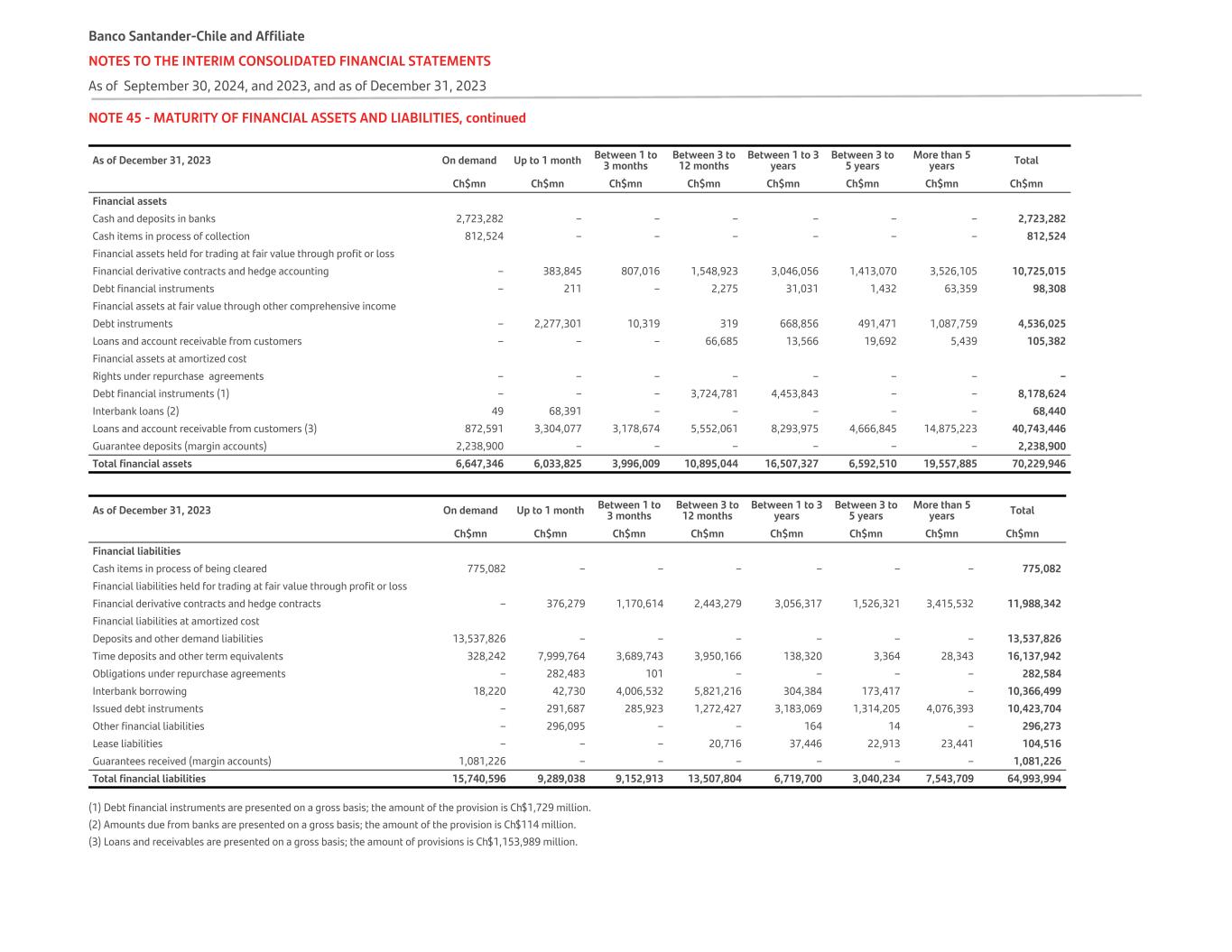 NOTE 45 - MATURITY OF FINANCIAL ASSETS AND LIABILITIES, continued As of December 31, 2023 On demand Up to 1 month Between 1 to 3 months Between 3 to 12 months Between 1 to 3 years Between 3 to 5 years More than 5 years Total Ch$mn Ch$mn Ch$mn Ch$mn Ch$mn Ch$mn Ch$mn Ch$mn Financial assets Cash and deposits in banks 2,723,282 – – – – – – 2,723,282 Cash items in process of collection 812,524 – – – – – – 812,524 Financial assets held for trading at fair value through profit or loss Financial derivative contracts and hedge accounting – 383,845 807,016 1,548,923 3,046,056 1,413,070 3,526,105 10,725,015 Debt financial instruments – 211 – 2,275 31,031 1,432 63,359 98,308 Financial assets at fair value through other comprehensive income Debt instruments – 2,277,301 10,319 319 668,856 491,471 1,087,759 4,536,025 Loans and account receivable from customers – – – 66,685 13,566 19,692 5,439 105,382 Financial assets at amortized cost Rights under repurchase agreements – – – – – – – – Debt financial instruments (1) – – – 3,724,781 4,453,843 – – 8,178,624 Interbank loans (2) 49 68,391 – – – – – 68,440 Loans and account receivable from customers (3) 872,591 3,304,077 3,178,674 5,552,061 8,293,975 4,666,845 14,875,223 40,743,446 Guarantee deposits (margin accounts) 2,238,900 – – – – – – 2,238,900 Total financial assets 6,647,346 6,033,825 3,996,009 10,895,044 16,507,327 6,592,510 19,557,885 70,229,946 As of December 31, 2023 On demand Up to 1 month Between 1 to 3 months Between 3 to 12 months Between 1 to 3 years Between 3 to 5 years More than 5 years Total Ch$mn Ch$mn Ch$mn Ch$mn Ch$mn Ch$mn Ch$mn Ch$mn Financial liabilities                 Cash items in process of being cleared 775,082 – – – – – – 775,082 Financial liabilities held for trading at fair value through profit or loss Financial derivative contracts and hedge contracts – 376,279 1,170,614 2,443,279 3,056,317 1,526,321 3,415,532 11,988,342 Financial liabilities at amortized cost Deposits and other demand liabilities 13,537,826 – – – – – – 13,537,826 Time deposits and other term equivalents 328,242 7,999,764 3,689,743 3,950,166 138,320 3,364 28,343 16,137,942 Obligations under repurchase agreements – 282,483 101 – – – – 282,584 Interbank borrowing 18,220 42,730 4,006,532 5,821,216 304,384 173,417 – 10,366,499 Issued debt instruments – 291,687 285,923 1,272,427 3,183,069 1,314,205 4,076,393 10,423,704 Other financial liabilities – 296,095 – – 164 14 – 296,273 Lease liabilities – – – 20,716 37,446 22,913 23,441 104,516 Guarantees received (margin accounts) 1,081,226 – – – – – – 1,081,226 Total financial liabilities 15,740,596 9,289,038 9,152,913 13,507,804 6,719,700 3,040,234 7,543,709 64,993,994 (1) Debt financial instruments are presented on a gross basis; the amount of the provision is Ch$1,729 million. (2) Amounts due from banks are presented on a gross basis; the amount of the provision is Ch$114 million. (3) Loans and receivables are presented on a gross basis; the amount of provisions is Ch$1,153,989 million. Banco Santander-Chile and Affiliate NOTES TO THE INTERIM CONSOLIDATED FINANCIAL STATEMENTS As of September 30, 2024, and 2023, and as of December 31, 2023