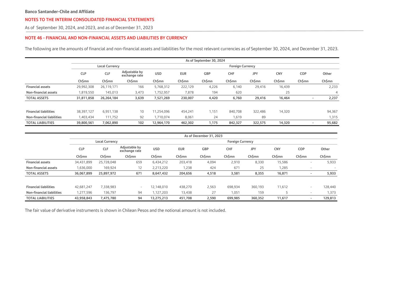NOTE 46 - FINANCIAL AND NON-FINANCIAL ASSETS AND LIABILITIES BY CURRENCY The following are the amounts of financial and non-financial assets and liabilities for the most relevant currencies as of September 30, 2024, and December 31, 2023. As of September 30, 2024 Local Currency Foreign Currency   CLP CLF Adjustable by exchange rate USD EUR GBP CHF JPY CNY COP Other Ch$mn Ch$mn Ch$mn Ch$mn Ch$mn Ch$mn Ch$mn Ch$mn Ch$mn Ch$mn Ch$mn Financial assets 29,992,308 26,119,171 166 5,768,312 222,129 4,226 6,140 29,416 16,439 2,233 Non-financial assets 1,819,550 145,013 3,473 1,752,957 7,878 194 620 25 4 TOTAL ASSETS 31,811,858 26,264,184 3,639 7,521,269 230,007 4,420 6,760 29,416 16,464 - 2,237 Financial liabilities 38,397,127 6,951,138 10 11,254,096 454,241 1,151 840,708 322,486 14,320 94,367 Non-financial liabilities 1,403,434 111,752 92 1,710,074 8,061 24 1,619 89 1,315 TOTAL LIABILITIES 39,800,561 7,062,890 102 12,964,170 462,302 1,175 842,327 322,575 14,320 - 95,682 As of December 31, 2023 Local Currency Foreign Currency   CLP CLF Adjustable by exchange rate USD EUR GBP CHF JPY CNY COP Other Ch$mn Ch$mn Ch$mn Ch$mn Ch$mn Ch$mn Ch$mn Ch$mn Ch$mn Ch$mn Ch$mn Financial assets 34,431,899 25,728,048 659 6,434,212 203,418 4,094 2,910 8,330 15,586 - 5,933 Non-financial assets 1,636,000 169,924 12 2,213,220 1,238 424 671 25 1,285 - - TOTAL ASSETS 36,067,899 25,897,972 671 8,647,432 204,656 4,518 3,581 8,355 16,871 - 5,933 Financial liabilities 42,681,247 7,338,983 - 12,148,010 438,270 2,563 698,934 360,193 11,612 - 128,440 Non-financial liabilities 1,277,596 136,797 94 1,127,203 13,438 27 1,051 159 5 - 1,373 TOTAL LIABILITIES 43,958,843 7,475,780 94 13,275,213 451,708 2,590 699,985 360,352 11,617 - 129,813 The fair value of derivative instruments is shown in Chilean Pesos and the notional amount is not included. Banco Santander-Chile and Affiliate NOTES TO THE INTERIM CONSOLIDATED FINANCIAL STATEMENTS As of September 30, 2024, and 2023, and as of December 31, 2023