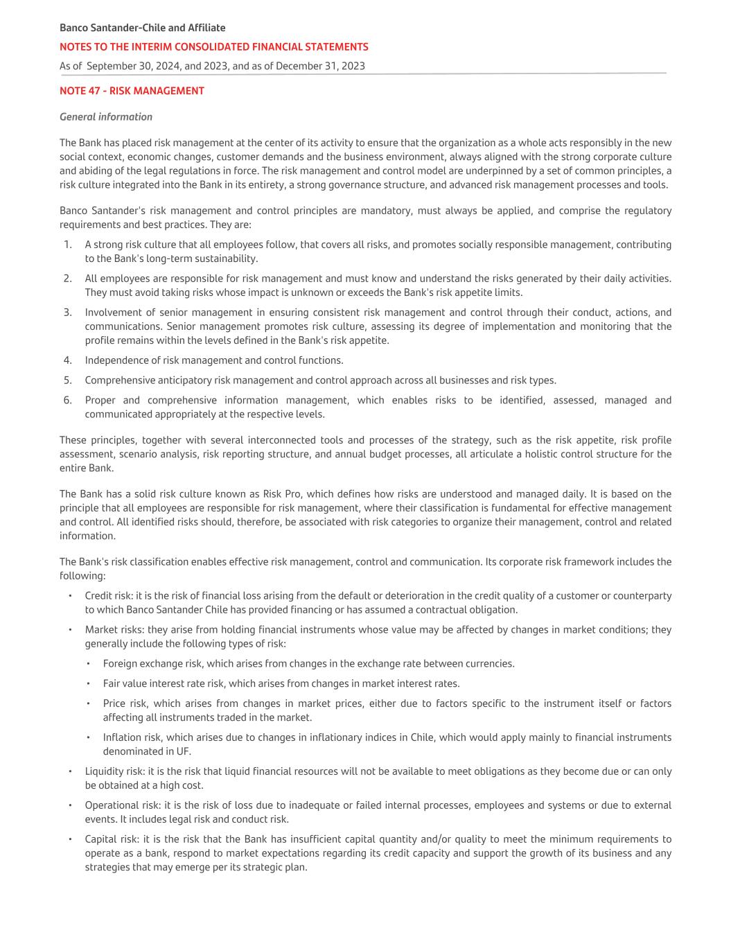 NOTE 47 - RISK MANAGEMENT General information The Bank has placed risk management at the center of its activity to ensure that the organization as a whole acts responsibly in the new social context, economic changes, customer demands and the business environment, always aligned with the strong corporate culture and abiding of the legal regulations in force. The risk management and control model are underpinned by a set of common principles, a risk culture integrated into the Bank in its entirety, a strong governance structure, and advanced risk management processes and tools. Banco Santander's risk management and control principles are mandatory, must always be applied, and comprise the regulatory requirements and best practices. They are: 1. A strong risk culture that all employees follow, that covers all risks, and promotes socially responsible management, contributing to the Bank's long-term sustainability. 2. All employees are responsible for risk management and must know and understand the risks generated by their daily activities. They must avoid taking risks whose impact is unknown or exceeds the Bank's risk appetite limits. 3. Involvement of senior management in ensuring consistent risk management and control through their conduct, actions, and communications. Senior management promotes risk culture, assessing its degree of implementation and monitoring that the profile remains within the levels defined in the Bank's risk appetite. 4. Independence of risk management and control functions. 5. Comprehensive anticipatory risk management and control approach across all businesses and risk types. 6. Proper and comprehensive information management, which enables risks to be identified, assessed, managed and communicated appropriately at the respective levels. These principles, together with several interconnected tools and processes of the strategy, such as the risk appetite, risk profile assessment, scenario analysis, risk reporting structure, and annual budget processes, all articulate a holistic control structure for the entire Bank. The Bank has a solid risk culture known as Risk Pro, which defines how risks are understood and managed daily. It is based on the principle that all employees are responsible for risk management, where their classification is fundamental for effective management and control. All identified risks should, therefore, be associated with risk categories to organize their management, control and related information. The Bank's risk classification enables effective risk management, control and communication. Its corporate risk framework includes the following: • Credit risk: it is the risk of financial loss arising from the default or deterioration in the credit quality of a customer or counterparty to which Banco Santander Chile has provided financing or has assumed a contractual obligation. • Market risks: they arise from holding financial instruments whose value may be affected by changes in market conditions; they generally include the following types of risk: • Foreign exchange risk, which arises from changes in the exchange rate between currencies. • Fair value interest rate risk, which arises from changes in market interest rates. • Price risk, which arises from changes in market prices, either due to factors specific to the instrument itself or factors affecting all instruments traded in the market. • Inflation risk, which arises due to changes in inflationary indices in Chile, which would apply mainly to financial instruments denominated in UF. • Liquidity risk: it is the risk that liquid financial resources will not be available to meet obligations as they become due or can only be obtained at a high cost. • Operational risk: it is the risk of loss due to inadequate or failed internal processes, employees and systems or due to external events. It includes legal risk and conduct risk. • Capital risk: it is the risk that the Bank has insufficient capital quantity and/or quality to meet the minimum requirements to operate as a bank, respond to market expectations regarding its credit capacity and support the growth of its business and any strategies that may emerge per its strategic plan. Banco Santander-Chile and Affiliate NOTES TO THE INTERIM CONSOLIDATED FINANCIAL STATEMENTS As of September 30, 2024, and 2023, and as of December 31, 2023