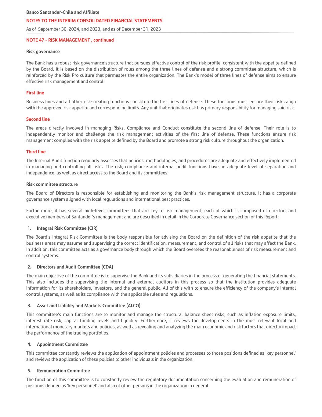 NOTE 47 - RISK MANAGEMENT , continued Risk governance The Bank has a robust risk governance structure that pursues effective control of the risk profile, consistent with the appetite defined by the Board. It is based on the distribution of roles among the three lines of defense and a strong committee structure, which is reinforced by the Risk Pro culture that permeates the entire organization. The Bank's model of three lines of defense aims to ensure effective risk management and control: First line Business lines and all other risk-creating functions constitute the first lines of defense. These functions must ensure their risks align with the approved risk appetite and corresponding limits. Any unit that originates risk has primary responsibility for managing said risk. Second line The areas directly involved in managing Risks, Compliance and Conduct constitute the second line of defense. Their role is to independently monitor and challenge the risk management activities of the first line of defense. These functions ensure risk management complies with the risk appetite defined by the Board and promote a strong risk culture throughout the organization. Third line The Internal Audit function regularly assesses that policies, methodologies, and procedures are adequate and effectively implemented in managing and controlling all risks. The risk, compliance and internal audit functions have an adequate level of separation and independence, as well as direct access to the Board and its committees. Risk committee structure The Board of Directors is responsible for establishing and monitoring the Bank's risk management structure. It has a corporate governance system aligned with local regulations and international best practices. Furthermore, it has several high-level committees that are key to risk management, each of which is composed of directors and executive members of Santander's management and are described in detail in the Corporate Governance section of this Report: 1. Integral Risk Committee (CIR) The Board's Integral Risk Committee is the body responsible for advising the Board on the definition of the risk appetite that the business areas may assume and supervising the correct identification, measurement, and control of all risks that may affect the Bank. In addition, this committee acts as a governance body through which the Board oversees the reasonableness of risk measurement and control systems. 2. Directors and Audit Committee (CDA) The main objective of the committee is to supervise the Bank and its subsidiaries in the process of generating the financial statements. This also includes the supervising the internal and external auditors in this process so that the institution provides adequate information for its shareholders, investors, and the general public. All of this with to ensure the efficiency of the company's internal control systems, as well as its compliance with the applicable rules and regulations. 3. Asset and Liability and Markets Committee (ALCO) This committee’s main functions are to monitor and manage the structural balance sheet risks, such as inflation exposure limits, interest rate risk, capital funding levels and liquidity. Furthermore, it reviews the developments in the most relevant local and international monetary markets and policies, as well as revealing and analyzing the main economic and risk factors that directly impact the performance of the trading portfolios. 4. Appointment Committee This committee constantly reviews the application of appointment policies and processes to those positions defined as 'key personnel' and reviews the application of these policies to other individuals in the organization. 5. Remuneration Committee The function of this committee is to constantly review the regulatory documentation concerning the evaluation and remuneration of positions defined as 'key personnel' and also of other persons in the organization in general. Banco Santander-Chile and Affiliate NOTES TO THE INTERIM CONSOLIDATED FINANCIAL STATEMENTS As of September 30, 2024, and 2023, and as of December 31, 2023