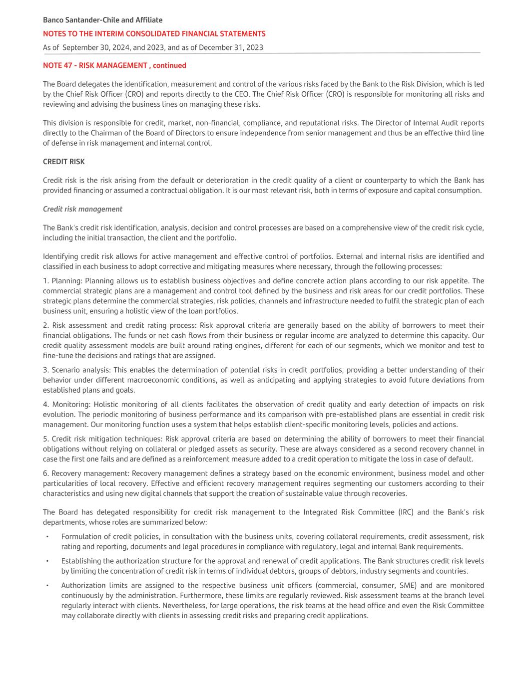 NOTE 47 - RISK MANAGEMENT , continued The Board delegates the identification, measurement and control of the various risks faced by the Bank to the Risk Division, which is led by the Chief Risk Officer (CRO) and reports directly to the CEO. The Chief Risk Officer (CRO) is responsible for monitoring all risks and reviewing and advising the business lines on managing these risks. This division is responsible for credit, market, non-financial, compliance, and reputational risks. The Director of Internal Audit reports directly to the Chairman of the Board of Directors to ensure independence from senior management and thus be an effective third line of defense in risk management and internal control. CREDIT RISK Credit risk is the risk arising from the default or deterioration in the credit quality of a client or counterparty to which the Bank has provided financing or assumed a contractual obligation. It is our most relevant risk, both in terms of exposure and capital consumption. Credit risk management The Bank's credit risk identification, analysis, decision and control processes are based on a comprehensive view of the credit risk cycle, including the initial transaction, the client and the portfolio. Identifying credit risk allows for active management and effective control of portfolios. External and internal risks are identified and classified in each business to adopt corrective and mitigating measures where necessary, through the following processes: 1. Planning: Planning allows us to establish business objectives and define concrete action plans according to our risk appetite. The commercial strategic plans are a management and control tool defined by the business and risk areas for our credit portfolios. These strategic plans determine the commercial strategies, risk policies, channels and infrastructure needed to fulfil the strategic plan of each business unit, ensuring a holistic view of the loan portfolios. 2. Risk assessment and credit rating process: Risk approval criteria are generally based on the ability of borrowers to meet their financial obligations. The funds or net cash flows from their business or regular income are analyzed to determine this capacity. Our credit quality assessment models are built around rating engines, different for each of our segments, which we monitor and test to fine-tune the decisions and ratings that are assigned. 3. Scenario analysis: This enables the determination of potential risks in credit portfolios, providing a better understanding of their behavior under different macroeconomic conditions, as well as anticipating and applying strategies to avoid future deviations from established plans and goals. 4. Monitoring: Holistic monitoring of all clients facilitates the observation of credit quality and early detection of impacts on risk evolution. The periodic monitoring of business performance and its comparison with pre-established plans are essential in credit risk management. Our monitoring function uses a system that helps establish client-specific monitoring levels, policies and actions. 5. Credit risk mitigation techniques: Risk approval criteria are based on determining the ability of borrowers to meet their financial obligations without relying on collateral or pledged assets as security. These are always considered as a second recovery channel in case the first one fails and are defined as a reinforcement measure added to a credit operation to mitigate the loss in case of default. 6. Recovery management: Recovery management defines a strategy based on the economic environment, business model and other particularities of local recovery. Effective and efficient recovery management requires segmenting our customers according to their characteristics and using new digital channels that support the creation of sustainable value through recoveries. The Board has delegated responsibility for credit risk management to the Integrated Risk Committee (IRC) and the Bank's risk departments, whose roles are summarized below: • Formulation of credit policies, in consultation with the business units, covering collateral requirements, credit assessment, risk rating and reporting, documents and legal procedures in compliance with regulatory, legal and internal Bank requirements. • Establishing the authorization structure for the approval and renewal of credit applications. The Bank structures credit risk levels by limiting the concentration of credit risk in terms of individual debtors, groups of debtors, industry segments and countries. • Authorization limits are assigned to the respective business unit officers (commercial, consumer, SME) and are monitored continuously by the administration. Furthermore, these limits are regularly reviewed. Risk assessment teams at the branch level regularly interact with clients. Nevertheless, for large operations, the risk teams at the head office and even the Risk Committee may collaborate directly with clients in assessing credit risks and preparing credit applications. Banco Santander-Chile and Affiliate NOTES TO THE INTERIM CONSOLIDATED FINANCIAL STATEMENTS As of September 30, 2024, and 2023, and as of December 31, 2023