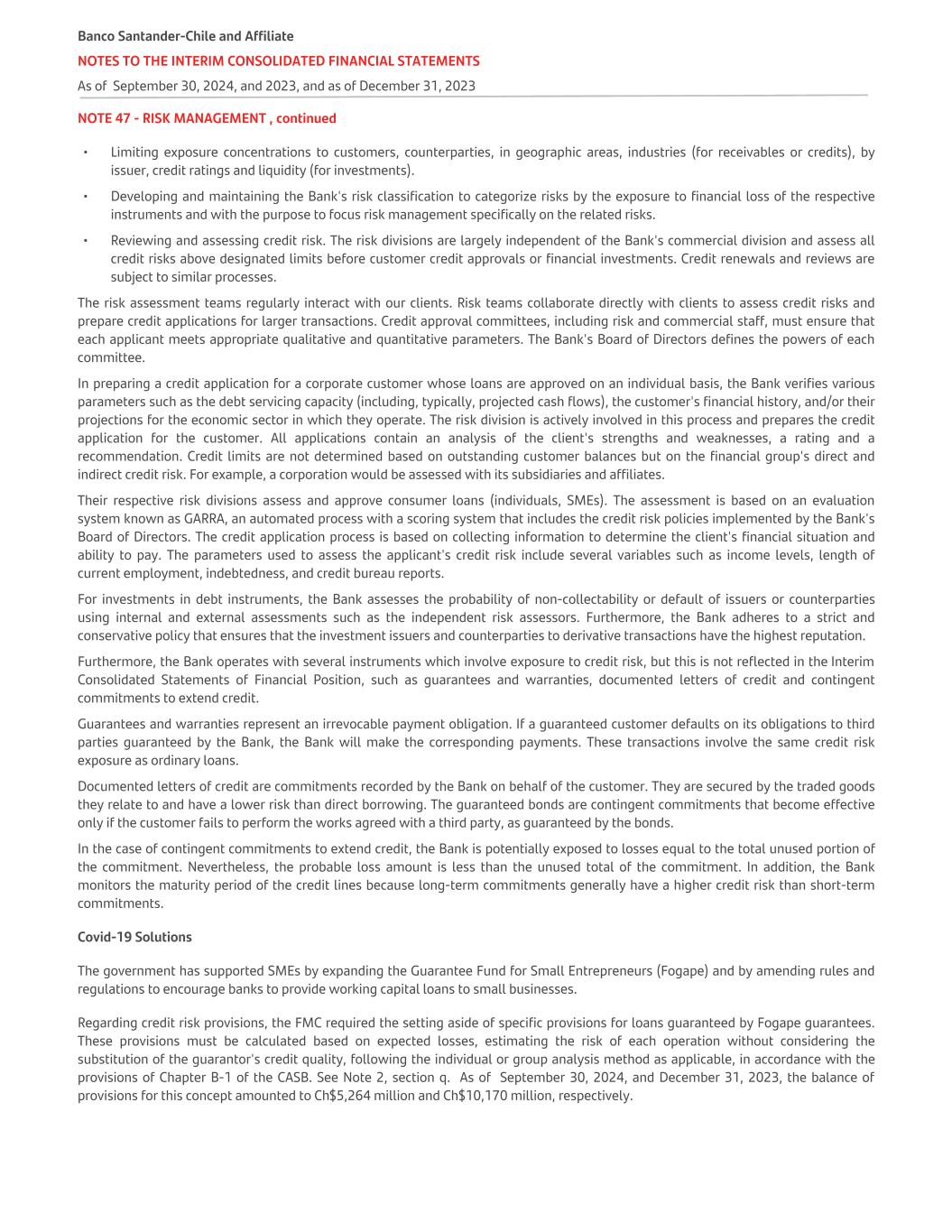 NOTE 47 - RISK MANAGEMENT , continued • Limiting exposure concentrations to customers, counterparties, in geographic areas, industries (for receivables or credits), by issuer, credit ratings and liquidity (for investments). • Developing and maintaining the Bank's risk classification to categorize risks by the exposure to financial loss of the respective instruments and with the purpose to focus risk management specifically on the related risks. • Reviewing and assessing credit risk. The risk divisions are largely independent of the Bank's commercial division and assess all credit risks above designated limits before customer credit approvals or financial investments. Credit renewals and reviews are subject to similar processes. The risk assessment teams regularly interact with our clients. Risk teams collaborate directly with clients to assess credit risks and prepare credit applications for larger transactions. Credit approval committees, including risk and commercial staff, must ensure that each applicant meets appropriate qualitative and quantitative parameters. The Bank's Board of Directors defines the powers of each committee. In preparing a credit application for a corporate customer whose loans are approved on an individual basis, the Bank verifies various parameters such as the debt servicing capacity (including, typically, projected cash flows), the customer's financial history, and/or their projections for the economic sector in which they operate. The risk division is actively involved in this process and prepares the credit application for the customer. All applications contain an analysis of the client's strengths and weaknesses, a rating and a recommendation. Credit limits are not determined based on outstanding customer balances but on the financial group's direct and indirect credit risk. For example, a corporation would be assessed with its subsidiaries and affiliates. Their respective risk divisions assess and approve consumer loans (individuals, SMEs). The assessment is based on an evaluation system known as GARRA, an automated process with a scoring system that includes the credit risk policies implemented by the Bank's Board of Directors. The credit application process is based on collecting information to determine the client's financial situation and ability to pay. The parameters used to assess the applicant's credit risk include several variables such as income levels, length of current employment, indebtedness, and credit bureau reports. For investments in debt instruments, the Bank assesses the probability of non-collectability or default of issuers or counterparties using internal and external assessments such as the independent risk assessors. Furthermore, the Bank adheres to a strict and conservative policy that ensures that the investment issuers and counterparties to derivative transactions have the highest reputation. Furthermore, the Bank operates with several instruments which involve exposure to credit risk, but this is not reflected in the Interim Consolidated Statements of Financial Position, such as guarantees and warranties, documented letters of credit and contingent commitments to extend credit. Guarantees and warranties represent an irrevocable payment obligation. If a guaranteed customer defaults on its obligations to third parties guaranteed by the Bank, the Bank will make the corresponding payments. These transactions involve the same credit risk exposure as ordinary loans. Documented letters of credit are commitments recorded by the Bank on behalf of the customer. They are secured by the traded goods they relate to and have a lower risk than direct borrowing. The guaranteed bonds are contingent commitments that become effective only if the customer fails to perform the works agreed with a third party, as guaranteed by the bonds. In the case of contingent commitments to extend credit, the Bank is potentially exposed to losses equal to the total unused portion of the commitment. Nevertheless, the probable loss amount is less than the unused total of the commitment. In addition, the Bank monitors the maturity period of the credit lines because long-term commitments generally have a higher credit risk than short-term commitments. Covid-19 Solutions The government has supported SMEs by expanding the Guarantee Fund for Small Entrepreneurs (Fogape) and by amending rules and regulations to encourage banks to provide working capital loans to small businesses. Regarding credit risk provisions, the FMC required the setting aside of specific provisions for loans guaranteed by Fogape guarantees. These provisions must be calculated based on expected losses, estimating the risk of each operation without considering the substitution of the guarantor's credit quality, following the individual or group analysis method as applicable, in accordance with the provisions of Chapter B-1 of the CASB. See Note 2, section q. As of September 30, 2024, and December 31, 2023, the balance of provisions for this concept amounted to Ch$5,264 million and Ch$10,170 million, respectively. Banco Santander-Chile and Affiliate NOTES TO THE INTERIM CONSOLIDATED FINANCIAL STATEMENTS As of September 30, 2024, and 2023, and as of December 31, 2023