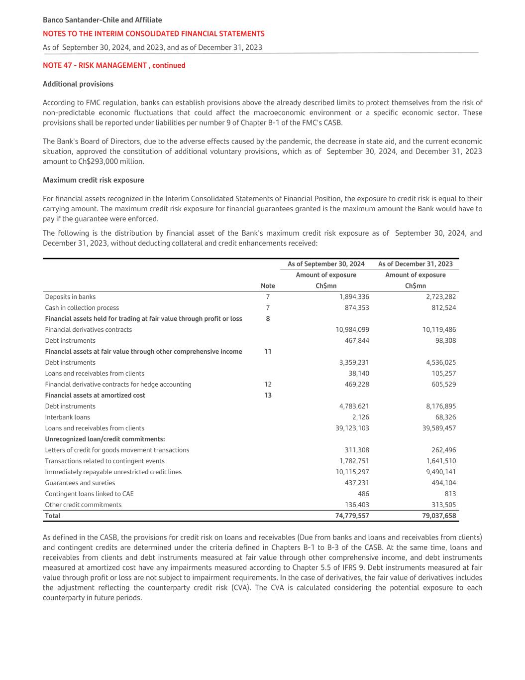 NOTE 47 - RISK MANAGEMENT , continued Additional provisions According to FMC regulation, banks can establish provisions above the already described limits to protect themselves from the risk of non-predictable economic fluctuations that could affect the macroeconomic environment or a specific economic sector. These provisions shall be reported under liabilities per number 9 of Chapter B-1 of the FMC's CASB. The Bank's Board of Directors, due to the adverse effects caused by the pandemic, the decrease in state aid, and the current economic situation, approved the constitution of additional voluntary provisions, which as of September 30, 2024, and December 31, 2023 amount to Ch$293,000 million. Maximum credit risk exposure For financial assets recognized in the Interim Consolidated Statements of Financial Position, the exposure to credit risk is equal to their carrying amount. The maximum credit risk exposure for financial guarantees granted is the maximum amount the Bank would have to pay if the guarantee were enforced. The following is the distribution by financial asset of the Bank's maximum credit risk exposure as of September 30, 2024, and December 31, 2023, without deducting collateral and credit enhancements received:     As of September 30, 2024 As of December 31, 2023 Amount of exposure Amount of exposure Note Ch$mn Ch$mn Deposits in banks 7 1,894,336 2,723,282 Cash in collection process 7 874,353 812,524 Financial assets held for trading at fair value through profit or loss 8 Financial derivatives contracts 10,984,099 10,119,486 Debt instruments 467,844 98,308 Financial assets at fair value through other comprehensive income 11 Debt instruments 3,359,231 4,536,025 Loans and receivables from clients 38,140 105,257 Financial derivative contracts for hedge accounting 12 469,228 605,529 Financial assets at amortized cost 13 Debt instruments 4,783,621 8,176,895 Interbank loans 2,126 68,326 Loans and receivables from clients 39,123,103 39,589,457 Unrecognized loan/credit commitments: Letters of credit for goods movement transactions 311,308 262,496 Transactions related to contingent events 1,782,751 1,641,510 Immediately repayable unrestricted credit lines 10,115,297 9,490,141 Guarantees and sureties 437,231 494,104 Contingent loans linked to CAE 486 813 Other credit commitments 136,403 313,505 Total 74,779,557 79,037,658 As defined in the CASB, the provisions for credit risk on loans and receivables (Due from banks and loans and receivables from clients) and contingent credits are determined under the criteria defined in Chapters B-1 to B-3 of the CASB. At the same time, loans and receivables from clients and debt instruments measured at fair value through other comprehensive income, and debt instruments measured at amortized cost have any impairments measured according to Chapter 5.5 of IFRS 9. Debt instruments measured at fair value through profit or loss are not subject to impairment requirements. In the case of derivatives, the fair value of derivatives includes the adjustment reflecting the counterparty credit risk (CVA). The CVA is calculated considering the potential exposure to each counterparty in future periods. Banco Santander-Chile and Affiliate NOTES TO THE INTERIM CONSOLIDATED FINANCIAL STATEMENTS As of September 30, 2024, and 2023, and as of December 31, 2023