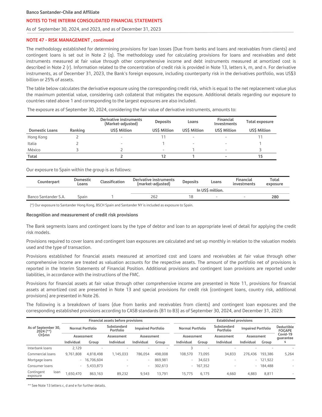 NOTE 47 - RISK MANAGEMENT , continued The methodology established for determining provisions for loan losses (Due from banks and loans and receivables from clients) and contingent loans is set out in Note 2 (q). The methodology used for calculating provisions for loans and receivables and debt instruments measured at fair value through other comprehensive income and debt instruments measured at amortized cost is described in Note 2 (r). Information related to the concentration of credit risk is provided in Note 13, letters k, m, and n. For derivative instruments, as of December 31, 2023, the Bank's foreign exposure, including counterparty risk in the derivatives portfolio, was US$3 billion or 25% of assets. The table below calculates the derivative exposure using the corresponding credit risk, which is equal to the net replacement value plus the maximum potential value, considering cash collateral that mitigates the exposure. Additional details regarding our exposure to countries rated above 1 and corresponding to the largest exposures are also included. The exposure as of September 30, 2024, considering the fair value of derivative instruments, amounts to: Derivative instruments (Market-adjusted) Deposits Loans Financial Investments Total exposure Domestic Loans Ranking US$ Million US$ Million US$ Million US$ Million US$ Million Hong Kong 2 - 11 - - 11 Italia 2 - 1 - - 1 México 3 2 - 1 - 3 Total 2 12 1 - 15 Our exposure to Spain within the group is as follows: Counterpart Domestic Loans Classification Derivative instruments (market-adjusted) Deposits Loans Financial investments Total exposure In US$ million. Banco Santander S.A. Spain 1 262 18 - - 280 (*) Our exposure to Santander Hong Kong, BSCH Spain and Santander NY is included as exposure to Spain. Recognition and measurement of credit risk provisions The Bank segments loans and contingent loans by the type of debtor and loan to an appropriate level of detail for applying the credit risk models. Provisions required to cover loans and contingent loan exposures are calculated and set up monthly in relation to the valuation models used and the type of transaction. Provisions established for financial assets measured at amortized cost and Loans and receivables at fair value through other comprehensive income are treated as valuation accounts for the respective assets. The amount of the portfolio net of provisions is reported in the Interim Statements of Financial Position. Additional provisions and contingent loan provisions are reported under liabilities, in accordance with the instructions of the FMC. Provisions for financial assets at fair value through other comprehensive income are presented in Note 11, provisions for financial assets at amortized cost are presented in Note 13 and special provisions for credit risk (contingent loans, country risk, additional provisions) are presented in Note 26. The following is a breakdown of loans (due from banks and receivables from clients) and contingent loan exposures and the corresponding established provisions according to CASB standards (B1 to B3) as of September 30, 2024, and December 31, 2023: As of September 30, 2024 (**) Ch$mn Financial assets before provisions Established provisions Normal Portfolio Substandard Portfolio Impaired Portfolio Normal Portfolio Substandard Portfolio Impaired Portfolio Deductible FOGAPE Covid-19 guarantee s Assessment Assessment Assessment Assessment Assessment Assessment Individual Group Individual Individual Group Individual Group Individual Individual Group Interbank loans 2,129 - - - - 3 - - - - - Commercial loans 9,761,808 4,818,498 1,145,033 786,054 498,008 108,570 73,095 34,833 276,436 193,386 5,264 Mortgage loans - 16,706,604 - - 869,981 - 34,023 - - 121,922 - Consumer loans - 5,433,873 - - 302,613 - 167,352 - - 184,488 - Contingent loan exposure 1,650,470 863,163 89,232 9,543 13,791 15,775 6,175 4,660 4,883 8,811 - ** See Note 13 letters c, d and e for further details. Banco Santander-Chile and Affiliate NOTES TO THE INTERIM CONSOLIDATED FINANCIAL STATEMENTS As of September 30, 2024, and 2023, and as of December 31, 2023