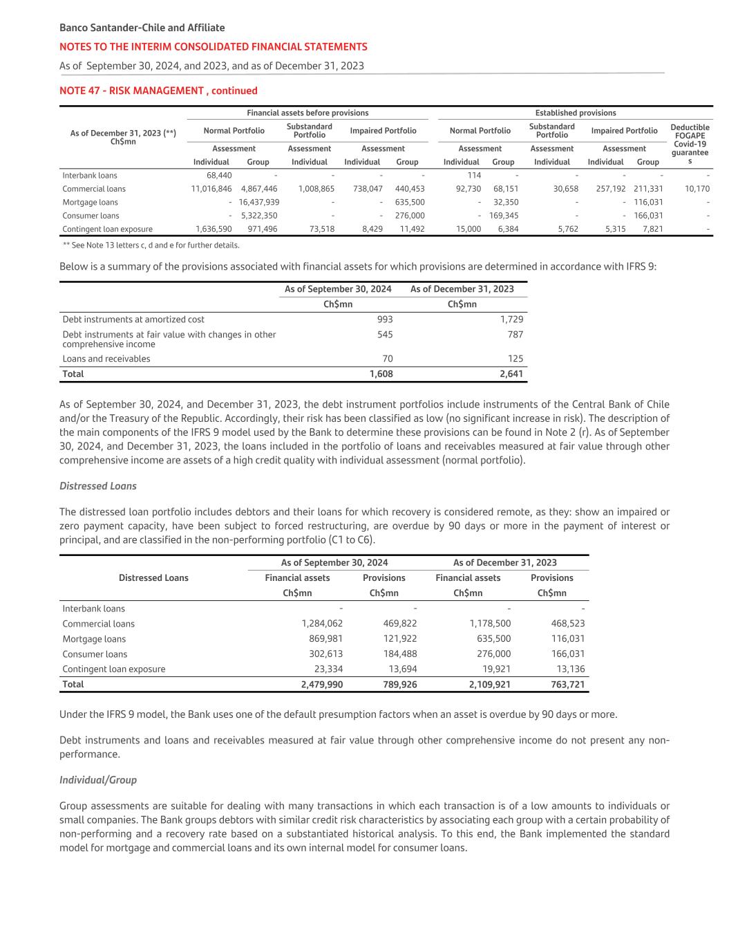 NOTE 47 - RISK MANAGEMENT , continued As of December 31, 2023 (**) Ch$mn Financial assets before provisions Established provisions Normal Portfolio Substandard Portfolio Impaired Portfolio Normal Portfolio Substandard Portfolio Impaired Portfolio Deductible FOGAPE Covid-19 guarantee s Assessment Assessment Assessment Assessment Assessment Assessment Individual Group Individual Individual Group Individual Group Individual Individual Group Interbank loans 68,440 - - - - 114 - - - - - Commercial loans 11,016,846 4,867,446 1,008,865 738,047 440,453 92,730 68,151 30,658 257,192 211,331 10,170 Mortgage loans - 16,437,939 - - 635,500 - 32,350 - - 116,031 - Consumer loans - 5,322,350 - - 276,000 - 169,345 - - 166,031 - Contingent loan exposure 1,636,590 971,496 73,518 8,429 11,492 15,000 6,384 5,762 5,315 7,821 - ** See Note 13 letters c, d and e for further details. Below is a summary of the provisions associated with financial assets for which provisions are determined in accordance with IFRS 9: As of September 30, 2024 As of December 31, 2023 Ch$mn Ch$mn Debt instruments at amortized cost 993 1,729 Debt instruments at fair value with changes in other comprehensive income 545 787 Loans and receivables 70 125 Total 1,608 2,641 As of September 30, 2024, and December 31, 2023, the debt instrument portfolios include instruments of the Central Bank of Chile and/or the Treasury of the Republic. Accordingly, their risk has been classified as low (no significant increase in risk). The description of the main components of the IFRS 9 model used by the Bank to determine these provisions can be found in Note 2 (r). As of September 30, 2024, and December 31, 2023, the loans included in the portfolio of loans and receivables measured at fair value through other comprehensive income are assets of a high credit quality with individual assessment (normal portfolio). Distressed Loans The distressed loan portfolio includes debtors and their loans for which recovery is considered remote, as they: show an impaired or zero payment capacity, have been subject to forced restructuring, are overdue by 90 days or more in the payment of interest or principal, and are classified in the non-performing portfolio (C1 to C6). As of September 30, 2024 As of December 31, 2023 Distressed Loans Financial assets Provisions Financial assets Provisions Ch$mn Ch$mn Ch$mn Ch$mn Interbank loans - - - - Commercial loans 1,284,062 469,822 1,178,500 468,523 Mortgage loans 869,981 121,922 635,500 116,031 Consumer loans 302,613 184,488 276,000 166,031 Contingent loan exposure 23,334 13,694 19,921 13,136 Total 2,479,990 789,926 2,109,921 763,721 Under the IFRS 9 model, the Bank uses one of the default presumption factors when an asset is overdue by 90 days or more. Debt instruments and loans and receivables measured at fair value through other comprehensive income do not present any non- performance. Individual/Group Group assessments are suitable for dealing with many transactions in which each transaction is of a low amounts to individuals or small companies. The Bank groups debtors with similar credit risk characteristics by associating each group with a certain probability of non-performing and a recovery rate based on a substantiated historical analysis. To this end, the Bank implemented the standard model for mortgage and commercial loans and its own internal model for consumer loans. Banco Santander-Chile and Affiliate NOTES TO THE INTERIM CONSOLIDATED FINANCIAL STATEMENTS As of September 30, 2024, and 2023, and as of December 31, 2023