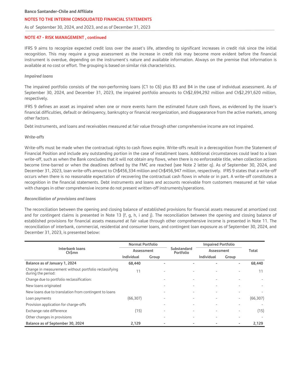 NOTE 47 - RISK MANAGEMENT , continued IFRS 9 aims to recognize expected credit loss over the asset's life, attending to significant increases in credit risk since the initial recognition. This may require a group assessment as the increase in credit risk may become more evident before the financial instrument is overdue, depending on the instrument's nature and available information. Always on the premise that information is available at no cost or effort. The grouping is based on similar risk characteristics. Impaired loans The impaired portfolio consists of the non-performing loans (C1 to C6) plus B3 and B4 in the case of individual assessment. As of September 30, 2024, and December 31, 2023, the impaired portfolio amounts to Ch$2,694,292 million and Ch$2,291,620 million, respectively. IFRS 9 defines an asset as impaired when one or more events harm the estimated future cash flows, as evidenced by the issuer's financial difficulties, default or delinquency, bankruptcy or financial reorganization, and disappearance from the active markets, among other factors. Debt instruments, and loans and receivables measured at fair value through other comprehensive income are not impaired. Write-offs Write-offs must be made when the contractual rights to cash flows expire. Write-offs result in a derecognition from the Statement of Financial Position and include any outstanding portion in the case of installment loans. Additional circumstances could lead to a loan write-off, such as when the Bank concludes that it will not obtain any flows, when there is no enforceable title, when collection actions become time-barred or when the deadlines defined by the FMC are reached (see Note 2 letter q). As of September 30, 2024, and December 31, 2023, loan write-offs amount to Ch$456,334 million and Ch$456,947 million, respectively. IFRS 9 states that a write-off occurs when there is no reasonable expectation of recovering the contractual cash flows in whole or in part. A write-off constitutes a recognition in the financial statements. Debt instruments and loans and accounts receivable from customers measured at fair value with changes in other comprehensive income do not present written-off instruments/operations. Reconciliation of provisions and loans The reconciliation between the opening and closing balance of established provisions for financial assets measured at amortized cost and for contingent claims is presented in Note 13 (f, g, h, i and j). The reconciliation between the opening and closing balance of established provisions for financial assets measured at fair value through other comprehensive income is presented in Note 11. The reconciliation of interbank, commercial, residential and consumer loans, and contingent loan exposure as of September 30, 2024, and December 31, 2023, is presented below: Interbank loans Ch$mn Normal Portfolio Substandard Portfolio Impaired Portfolio TotalAssessment Assessment Individual Group Individual Group Balance as of January 1, 2024 68,440 - - - - 68,440 Change in measurement without portfolio reclassifying during the period: 11 - - - - 11 Change due to portfolio reclassification: - - - - - New loans originated - - - - - New loans due to translation from contingent to loans - - - - - Loan payments (66,307) - - - - (66,307) Provision application for charge-offs - - - - - Exchange rate difference (15) - - - - (15) Other changes in provisions - - - - - Balance as of September 30, 2024 2,129 - - - - 2,129 Banco Santander-Chile and Affiliate NOTES TO THE INTERIM CONSOLIDATED FINANCIAL STATEMENTS As of September 30, 2024, and 2023, and as of December 31, 2023