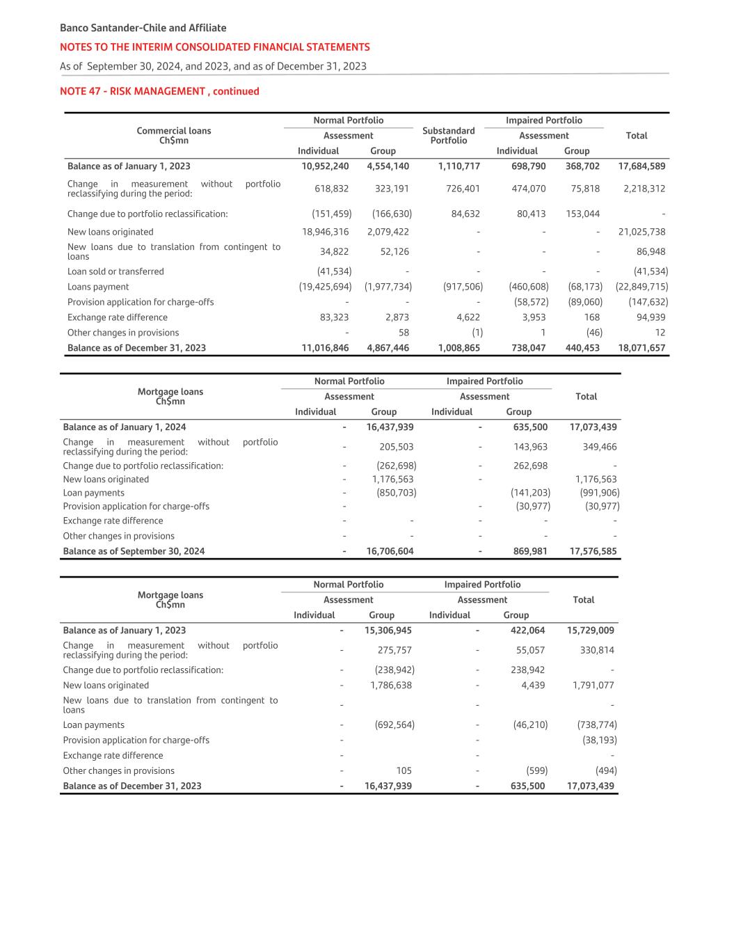 NOTE 47 - RISK MANAGEMENT , continued Commercial loans Ch$mn Normal Portfolio Substandard Portfolio Impaired Portfolio TotalAssessment Assessment Individual Group Individual Group Balance as of January 1, 2023 10,952,240 4,554,140 1,110,717 698,790 368,702 17,684,589 Change in measurement without portfolio reclassifying during the period: 618,832 323,191 726,401 474,070 75,818 2,218,312 Change due to portfolio reclassification: (151,459) (166,630) 84,632 80,413 153,044 - New loans originated 18,946,316 2,079,422 - - - 21,025,738 New loans due to translation from contingent to loans 34,822 52,126 - - - 86,948 Loan sold or transferred (41,534) - - - - (41,534) Loans payment (19,425,694) (1,977,734) (917,506) (460,608) (68,173) (22,849,715) Provision application for charge-offs - - - (58,572) (89,060) (147,632) Exchange rate difference 83,323 2,873 4,622 3,953 168 94,939 Other changes in provisions - 58 (1) 1 (46) 12 Balance as of December 31, 2023 11,016,846 4,867,446 1,008,865 738,047 440,453 18,071,657 Mortgage loans Ch$mn Normal Portfolio Impaired Portfolio TotalAssessment Assessment Individual Group Individual Group Balance as of January 1, 2024 - 16,437,939 - 635,500 17,073,439 Change in measurement without portfolio reclassifying during the period: - 205,503 - 143,963 349,466 Change due to portfolio reclassification: - (262,698) - 262,698 - New loans originated - 1,176,563 - 1,176,563 Loan payments - (850,703) (141,203) (991,906) Provision application for charge-offs - - (30,977) (30,977) Exchange rate difference - - - - - Other changes in provisions - - - - - Balance as of September 30, 2024 - 16,706,604 - 869,981 17,576,585 Mortgage loans Ch$mn Normal Portfolio Impaired Portfolio TotalAssessment Assessment Individual Group Individual Group Balance as of January 1, 2023 - 15,306,945 - 422,064 15,729,009 Change in measurement without portfolio reclassifying during the period: - 275,757 - 55,057 330,814 Change due to portfolio reclassification: - (238,942) - 238,942 - New loans originated - 1,786,638 - 4,439 1,791,077 New loans due to translation from contingent to loans - - - Loan payments - (692,564) - (46,210) (738,774) Provision application for charge-offs - - (38,193) Exchange rate difference - - - Other changes in provisions - 105 - (599) (494) Balance as of December 31, 2023 - 16,437,939 - 635,500 17,073,439 Banco Santander-Chile and Affiliate NOTES TO THE INTERIM CONSOLIDATED FINANCIAL STATEMENTS As of September 30, 2024, and 2023, and as of December 31, 2023