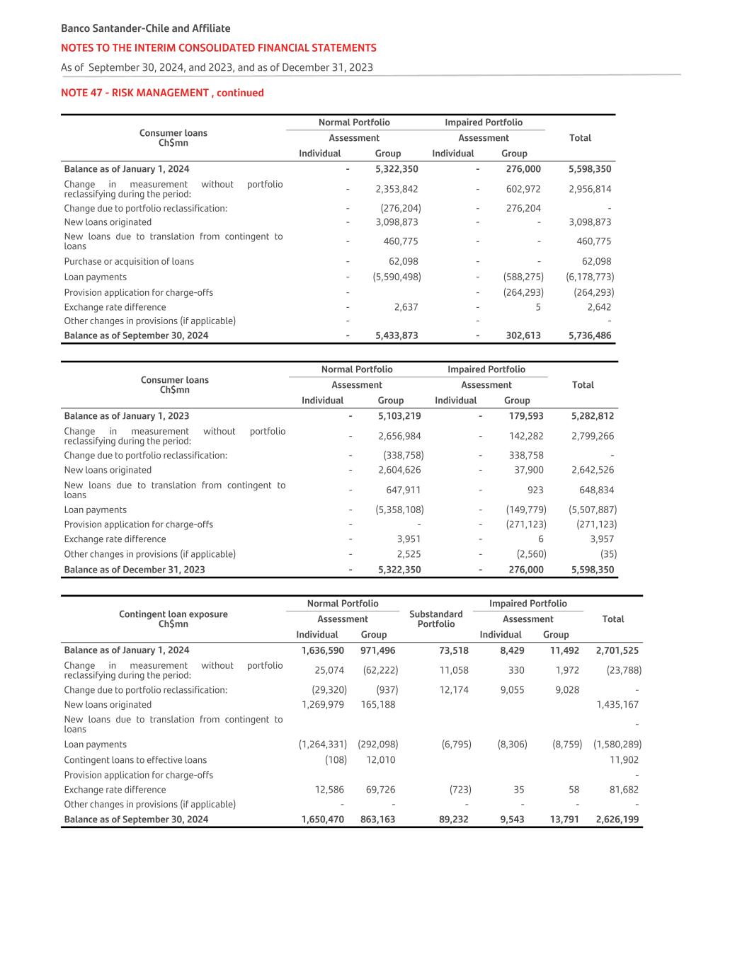 NOTE 47 - RISK MANAGEMENT , continued Consumer loans Ch$mn Normal Portfolio Impaired Portfolio TotalAssessment Assessment Individual Group Individual Group Balance as of January 1, 2024 - 5,322,350 - 276,000 5,598,350 Change in measurement without portfolio reclassifying during the period: - 2,353,842 - 602,972 2,956,814 Change due to portfolio reclassification: - (276,204) - 276,204 - New loans originated - 3,098,873 - - 3,098,873 New loans due to translation from contingent to loans - 460,775 - - 460,775 Purchase or acquisition of loans - 62,098 - - 62,098 Loan payments - (5,590,498) - (588,275) (6,178,773) Provision application for charge-offs - - (264,293) (264,293) Exchange rate difference - 2,637 - 5 2,642 Other changes in provisions (if applicable) - - - Balance as of September 30, 2024 - 5,433,873 - 302,613 5,736,486 Consumer loans Ch$mn Normal Portfolio Impaired Portfolio TotalAssessment Assessment Individual Group Individual Group Balance as of January 1, 2023 - 5,103,219 - 179,593 5,282,812 Change in measurement without portfolio reclassifying during the period: - 2,656,984 - 142,282 2,799,266 Change due to portfolio reclassification: - (338,758) - 338,758 - New loans originated - 2,604,626 - 37,900 2,642,526 New loans due to translation from contingent to loans - 647,911 - 923 648,834 Loan payments - (5,358,108) - (149,779) (5,507,887) Provision application for charge-offs - - - (271,123) (271,123) Exchange rate difference - 3,951 - 6 3,957 Other changes in provisions (if applicable) - 2,525 - (2,560) (35) Balance as of December 31, 2023 - 5,322,350 - 276,000 5,598,350 Contingent loan exposure Ch$mn Normal Portfolio Substandard Portfolio Impaired Portfolio TotalAssessment Assessment Individual Group Individual Group Balance as of January 1, 2024 1,636,590 971,496 73,518 8,429 11,492 2,701,525 Change in measurement without portfolio reclassifying during the period: 25,074 (62,222) 11,058 330 1,972 (23,788) Change due to portfolio reclassification: (29,320) (937) 12,174 9,055 9,028 - New loans originated 1,269,979 165,188 1,435,167 New loans due to translation from contingent to loans - Loan payments (1,264,331) (292,098) (6,795) (8,306) (8,759) (1,580,289) Contingent loans to effective loans (108) 12,010 11,902 Provision application for charge-offs - Exchange rate difference 12,586 69,726 (723) 35 58 81,682 Other changes in provisions (if applicable) - - - - - - Balance as of September 30, 2024 1,650,470 863,163 89,232 9,543 13,791 2,626,199 Banco Santander-Chile and Affiliate NOTES TO THE INTERIM CONSOLIDATED FINANCIAL STATEMENTS As of September 30, 2024, and 2023, and as of December 31, 2023