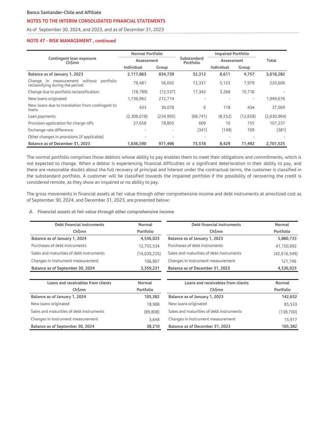 NOTE 47 - RISK MANAGEMENT , continued Contingent loan exposure Ch$mn Normal Portfolio Substandard Portfolio Impaired Portfolio TotalAssessment Assessment Individual Group Individual Group Balance as of January 1, 2023 2,117,863 834,739 52,312 8,611 4,757 3,018,282 Change in measurement without portfolio reclassifying during the period: 78,481 56,692 72,331 5,123 7,979 220,606 Change due to portfolio reclassification: (18,789) (12,537) 17,342 3,268 10,716 - New loans originated 1,736,962 212,714 - - - 1,949,676 New loans due to translation from contingent to loans 433 36,078 6 118 434 37,069 Loan payments (2,306,018) (234,995) (68,741) (8,552) (12,658) (2,630,964) Provision application for charge-offs 27,658 78,805 609 10 155 107,237 Exchange rate difference - - (341) (149) 109 (381) Other changes in provisions (if applicable) - - - - - - Balance as of December 31, 2023 1,636,590 971,496 73,518 8,429 11,492 2,701,525 The normal portfolio comprises those debtors whose ability to pay enables them to meet their obligations and commitments, which is not expected to change. When a debtor is experiencing financial difficulties or a significant deterioration in their ability to pay, and there are reasonable doubts about the full recovery of principal and interest under the contractual terms, the customer is classified in the substandard portfolio. A customer will be classified towards the impaired portfolio if the possibility of recovering the credit is considered remote, as they show an impaired or no ability to pay. The gross movements in financial assets at fair value through other comprehensive income and debt instruments at amortized cost as of September 30, 2024, and December 31, 2023, are presented below: A. Financial assets at fair value through other comprehensive income Debt financial instruments Normal Debt financial instruments Normal Ch$mn Portfolio Ch$mn Portfolio Balance as of January 1, 2024 4,536,025 Balance as of January 1, 2023 5,880,733 Purchases of debt instruments 12,755,534 Purchases of debt instruments 41,150,092 Sales and maturities of debt instruments (14,039,235) Sales and maturities of debt instruments (42,616,549) Changes in instrument measurement 106,907 Changes in instrument measurement 121,749 Balance as of September 30, 2024 3,359,231 Balance as of December 31, 2023 4,536,025 Loans and receivables from clients Normal Loans and receivables from clients Normal Ch$mn Portfolio Ch$mn Portfolio Balance as of January 1, 2024 105,382 Balance as of January 1, 2023 142,632 New loans originated 18,988 New loans originated 85,533 Sales and maturities of debt instruments (89,808) Sales and maturities of debt instruments (138,700) Changes in instrument measurement 3,648 Changes in instrument measurement 15,917 Balance as of September 30, 2024 38,210 Balance as of December 31, 2023 105,382 Banco Santander-Chile and Affiliate NOTES TO THE INTERIM CONSOLIDATED FINANCIAL STATEMENTS As of September 30, 2024, and 2023, and as of December 31, 2023