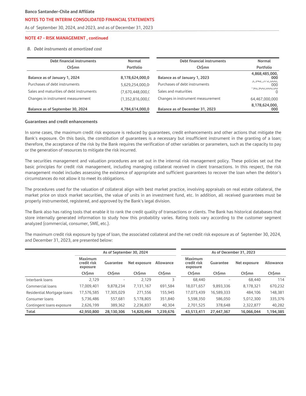 NOTE 47 - RISK MANAGEMENT , continued B. Debt instruments at amortized cost Debt financial instruments Normal Debt financial instruments Normal Ch$mn Portfolio Ch$mn Portfolio Balance as of January 1, 2024 8,178,624,000,000 Balance as of January 1, 2023 4,868,485,000, 000 Purchases of debt instruments 5,629,254,000,000 Purchases of debt instruments 3,342,572,000, 000 Sales and maturities of debt instruments (7,670,448,000,000) Sales and maturities -96,900,000,00 0 Changes in instrument measurement (1,352,816,000,000) Changes in instrument measurement 64,467,000,000 Balance as of September 30, 2024 4,784,614,000,000 Balance as of December 31, 2023 8,178,624,000, 000 Guarantees and credit enhancements In some cases, the maximum credit risk exposure is reduced by guarantees, credit enhancements and other actions that mitigate the Bank's exposure. On this basis, the constitution of guarantees is a necessary but insufficient instrument in the granting of a loan; therefore, the acceptance of the risk by the Bank requires the verification of other variables or parameters, such as the capacity to pay or the generation of resources to mitigate the risk incurred. The securities management and valuation procedures are set out in the internal risk management policy. These policies set out the basic principles for credit risk management, including managing collateral received in client transactions. In this respect, the risk management model includes assessing the existence of appropriate and sufficient guarantees to recover the loan when the debtor's circumstances do not allow it to meet its obligations. The procedures used for the valuation of collateral align with best market practice, involving appraisals on real estate collateral, the market price on stock market securities, the value of units in an investment fund, etc. In addition, all received guarantees must be properly instrumented, registered, and approved by the Bank's legal division. The Bank also has rating tools that enable it to rank the credit quality of transactions or clients. The Bank has historical databases that store internally generated information to study how this probability varies. Rating tools vary according to the customer segment analyzed (commercial, consumer, SME, etc.). The maximum credit risk exposure by type of loan, the associated collateral and the net credit risk exposure as of September 30, 2024, and December 31, 2023, are presented below: As of September 30, 2024 As of December 31, 2023 Maximum credit risk exposure Guarantee Net exposure Allowance Maximum credit risk exposure Guarantee Net exposure Allowance   Ch$mn Ch$mn Ch$mn Ch$mn Ch$mn Ch$mn Ch$mn Ch$mn Interbank loans 2,129 - 2,129 3 68,440 - 68,440 114 Commercial loans 17,009,401 9,878,234 7,131,167 691,584 18,071,657 9,893,336 8,178,321 670,232 Residential Mortgage loans 17,576,585 17,305,029 271,556 155,945 17,073,439 16,589,333 484,106 148,381 Consumer loans 5,736,486 557,681 5,178,805 351,840 5,598,350 586,050 5,012,300 335,376 Contingent loans exposure 2,626,199 389,362 2,236,837 40,304 2,701,525 378,648 2,322,877 40,282 Total 42,950,800 28,130,306 14,820,494 1,239,676 43,513,411 27,447,367 16,066,044 1,194,385 Banco Santander-Chile and Affiliate NOTES TO THE INTERIM CONSOLIDATED FINANCIAL STATEMENTS As of September 30, 2024, and 2023, and as of December 31, 2023