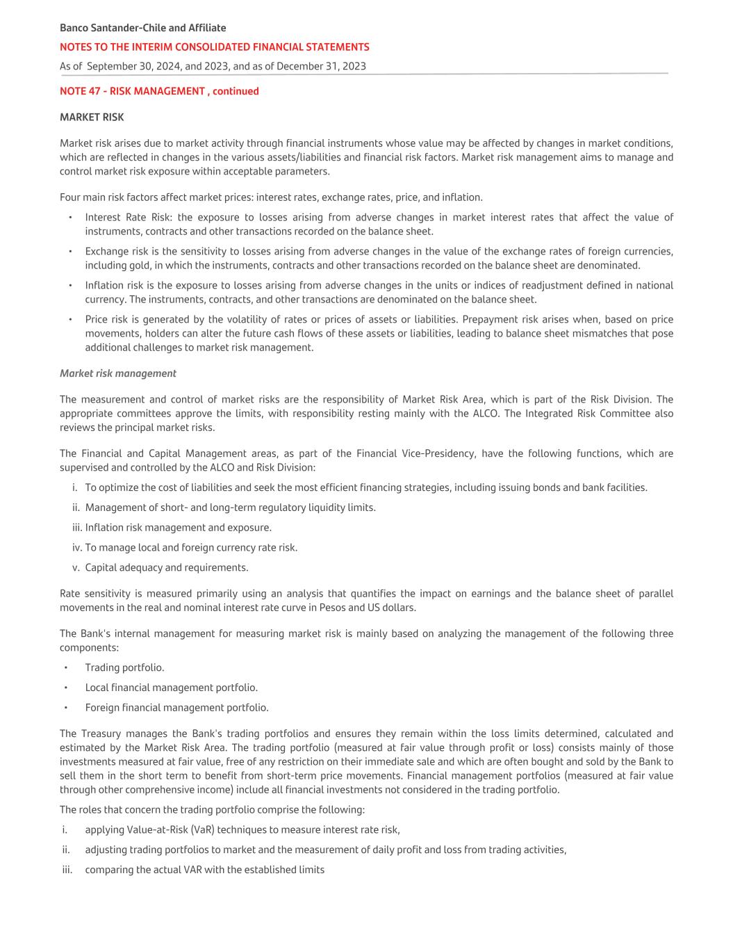 NOTE 47 - RISK MANAGEMENT , continued MARKET RISK Market risk arises due to market activity through financial instruments whose value may be affected by changes in market conditions, which are reflected in changes in the various assets/liabilities and financial risk factors. Market risk management aims to manage and control market risk exposure within acceptable parameters. Four main risk factors affect market prices: interest rates, exchange rates, price, and inflation. • Interest Rate Risk: the exposure to losses arising from adverse changes in market interest rates that affect the value of instruments, contracts and other transactions recorded on the balance sheet. • Exchange risk is the sensitivity to losses arising from adverse changes in the value of the exchange rates of foreign currencies, including gold, in which the instruments, contracts and other transactions recorded on the balance sheet are denominated. • Inflation risk is the exposure to losses arising from adverse changes in the units or indices of readjustment defined in national currency. The instruments, contracts, and other transactions are denominated on the balance sheet. • Price risk is generated by the volatility of rates or prices of assets or liabilities. Prepayment risk arises when, based on price movements, holders can alter the future cash flows of these assets or liabilities, leading to balance sheet mismatches that pose additional challenges to market risk management. Market risk management The measurement and control of market risks are the responsibility of Market Risk Area, which is part of the Risk Division. The appropriate committees approve the limits, with responsibility resting mainly with the ALCO. The Integrated Risk Committee also reviews the principal market risks. The Financial and Capital Management areas, as part of the Financial Vice-Presidency, have the following functions, which are supervised and controlled by the ALCO and Risk Division: i. To optimize the cost of liabilities and seek the most efficient financing strategies, including issuing bonds and bank facilities. ii. Management of short- and long-term regulatory liquidity limits. iii. Inflation risk management and exposure. iv. To manage local and foreign currency rate risk. v. Capital adequacy and requirements. Rate sensitivity is measured primarily using an analysis that quantifies the impact on earnings and the balance sheet of parallel movements in the real and nominal interest rate curve in Pesos and US dollars. The Bank's internal management for measuring market risk is mainly based on analyzing the management of the following three components: • Trading portfolio. • Local financial management portfolio. • Foreign financial management portfolio. The Treasury manages the Bank's trading portfolios and ensures they remain within the loss limits determined, calculated and estimated by the Market Risk Area. The trading portfolio (measured at fair value through profit or loss) consists mainly of those investments measured at fair value, free of any restriction on their immediate sale and which are often bought and sold by the Bank to sell them in the short term to benefit from short-term price movements. Financial management portfolios (measured at fair value through other comprehensive income) include all financial investments not considered in the trading portfolio. The roles that concern the trading portfolio comprise the following: i. applying Value-at-Risk (VaR) techniques to measure interest rate risk, ii. adjusting trading portfolios to market and the measurement of daily profit and loss from trading activities, iii. comparing the actual VAR with the established limits Banco Santander-Chile and Affiliate NOTES TO THE INTERIM CONSOLIDATED FINANCIAL STATEMENTS As of September 30, 2024, and 2023, and as of December 31, 2023