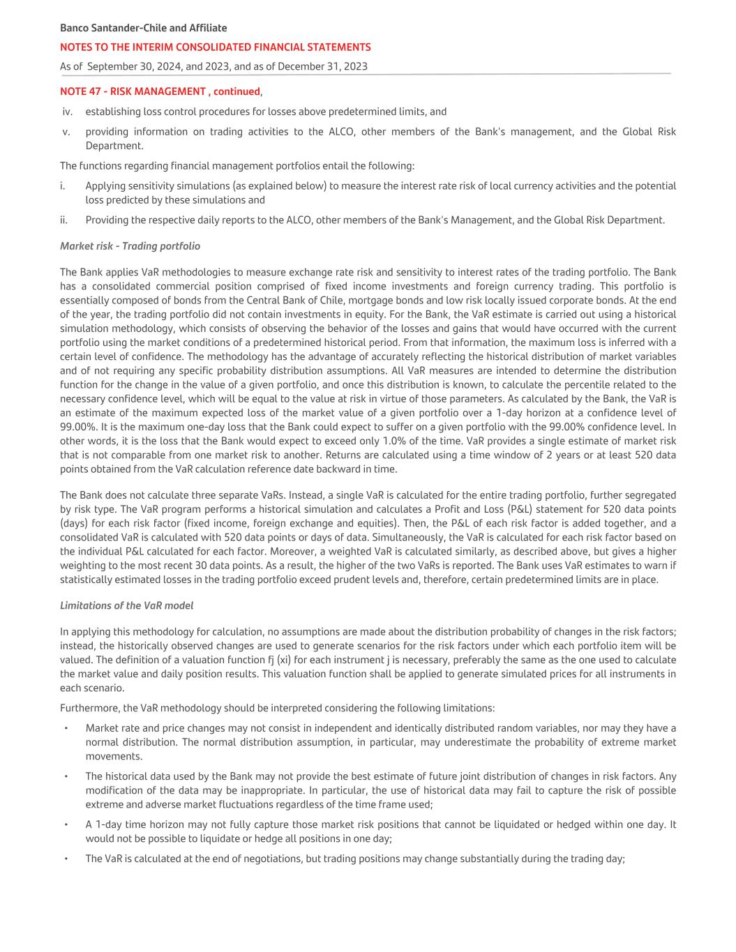 NOTE 47 - RISK MANAGEMENT , continued, iv. establishing loss control procedures for losses above predetermined limits, and v. providing information on trading activities to the ALCO, other members of the Bank's management, and the Global Risk Department. The functions regarding financial management portfolios entail the following: i. Applying sensitivity simulations (as explained below) to measure the interest rate risk of local currency activities and the potential loss predicted by these simulations and ii. Providing the respective daily reports to the ALCO, other members of the Bank's Management, and the Global Risk Department. Market risk - Trading portfolio The Bank applies VaR methodologies to measure exchange rate risk and sensitivity to interest rates of the trading portfolio. The Bank has a consolidated commercial position comprised of fixed income investments and foreign currency trading. This portfolio is essentially composed of bonds from the Central Bank of Chile, mortgage bonds and low risk locally issued corporate bonds. At the end of the year, the trading portfolio did not contain investments in equity. For the Bank, the VaR estimate is carried out using a historical simulation methodology, which consists of observing the behavior of the losses and gains that would have occurred with the current portfolio using the market conditions of a predetermined historical period. From that information, the maximum loss is inferred with a certain level of confidence. The methodology has the advantage of accurately reflecting the historical distribution of market variables and of not requiring any specific probability distribution assumptions. All VaR measures are intended to determine the distribution function for the change in the value of a given portfolio, and once this distribution is known, to calculate the percentile related to the necessary confidence level, which will be equal to the value at risk in virtue of those parameters. As calculated by the Bank, the VaR is an estimate of the maximum expected loss of the market value of a given portfolio over a 1-day horizon at a confidence level of 99.00%. It is the maximum one-day loss that the Bank could expect to suffer on a given portfolio with the 99.00% confidence level. In other words, it is the loss that the Bank would expect to exceed only 1.0% of the time. VaR provides a single estimate of market risk that is not comparable from one market risk to another. Returns are calculated using a time window of 2 years or at least 520 data points obtained from the VaR calculation reference date backward in time. The Bank does not calculate three separate VaRs. Instead, a single VaR is calculated for the entire trading portfolio, further segregated by risk type. The VaR program performs a historical simulation and calculates a Profit and Loss (P&L) statement for 520 data points (days) for each risk factor (fixed income, foreign exchange and equities). Then, the P&L of each risk factor is added together, and a consolidated VaR is calculated with 520 data points or days of data. Simultaneously, the VaR is calculated for each risk factor based on the individual P&L calculated for each factor. Moreover, a weighted VaR is calculated similarly, as described above, but gives a higher weighting to the most recent 30 data points. As a result, the higher of the two VaRs is reported. The Bank uses VaR estimates to warn if statistically estimated losses in the trading portfolio exceed prudent levels and, therefore, certain predetermined limits are in place. Limitations of the VaR model In applying this methodology for calculation, no assumptions are made about the distribution probability of changes in the risk factors; instead, the historically observed changes are used to generate scenarios for the risk factors under which each portfolio item will be valued. The definition of a valuation function fj (xi) for each instrument j is necessary, preferably the same as the one used to calculate the market value and daily position results. This valuation function shall be applied to generate simulated prices for all instruments in each scenario. Furthermore, the VaR methodology should be interpreted considering the following limitations: • Market rate and price changes may not consist in independent and identically distributed random variables, nor may they have a normal distribution. The normal distribution assumption, in particular, may underestimate the probability of extreme market movements. • The historical data used by the Bank may not provide the best estimate of future joint distribution of changes in risk factors. Any modification of the data may be inappropriate. In particular, the use of historical data may fail to capture the risk of possible extreme and adverse market fluctuations regardless of the time frame used; • A 1-day time horizon may not fully capture those market risk positions that cannot be liquidated or hedged within one day. It would not be possible to liquidate or hedge all positions in one day; • The VaR is calculated at the end of negotiations, but trading positions may change substantially during the trading day; Banco Santander-Chile and Affiliate NOTES TO THE INTERIM CONSOLIDATED FINANCIAL STATEMENTS As of September 30, 2024, and 2023, and as of December 31, 2023