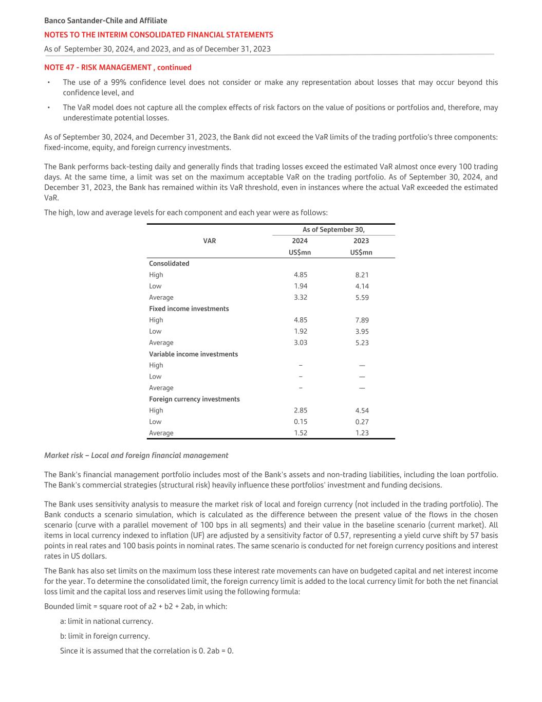 NOTE 47 - RISK MANAGEMENT , continued • The use of a 99% confidence level does not consider or make any representation about losses that may occur beyond this confidence level, and • The VaR model does not capture all the complex effects of risk factors on the value of positions or portfolios and, therefore, may underestimate potential losses. As of September 30, 2024, and December 31, 2023, the Bank did not exceed the VaR limits of the trading portfolio’s three components: fixed-income, equity, and foreign currency investments. The Bank performs back-testing daily and generally finds that trading losses exceed the estimated VaR almost once every 100 trading days. At the same time, a limit was set on the maximum acceptable VaR on the trading portfolio. As of September 30, 2024, and December 31, 2023, the Bank has remained within its VaR threshold, even in instances where the actual VaR exceeded the estimated VaR. The high, low and average levels for each component and each year were as follows: VAR As of September 30, 2024 2023 US$mn US$mn Consolidated   High 4.85 8.21 Low 1.94 4.14 Average 3.32 5.59 Fixed income investments High 4.85 7.89 Low 1.92 3.95 Average 3.03 5.23 Variable income investments High – — Low – — Average – — Foreign currency investments High 2.85 4.54 Low 0.15 0.27 Average 1.52 1.23 Market risk – Local and foreign financial management The Bank's financial management portfolio includes most of the Bank's assets and non-trading liabilities, including the loan portfolio. The Bank's commercial strategies (structural risk) heavily influence these portfolios' investment and funding decisions. The Bank uses sensitivity analysis to measure the market risk of local and foreign currency (not included in the trading portfolio). The Bank conducts a scenario simulation, which is calculated as the difference between the present value of the flows in the chosen scenario (curve with a parallel movement of 100 bps in all segments) and their value in the baseline scenario (current market). All items in local currency indexed to inflation (UF) are adjusted by a sensitivity factor of 0.57, representing a yield curve shift by 57 basis points in real rates and 100 basis points in nominal rates. The same scenario is conducted for net foreign currency positions and interest rates in US dollars. The Bank has also set limits on the maximum loss these interest rate movements can have on budgeted capital and net interest income for the year. To determine the consolidated limit, the foreign currency limit is added to the local currency limit for both the net financial loss limit and the capital loss and reserves limit using the following formula: Bounded limit = square root of a2 + b2 + 2ab, in which: a: limit in national currency. b: limit in foreign currency. Since it is assumed that the correlation is 0. 2ab = 0. Banco Santander-Chile and Affiliate NOTES TO THE INTERIM CONSOLIDATED FINANCIAL STATEMENTS As of September 30, 2024, and 2023, and as of December 31, 2023