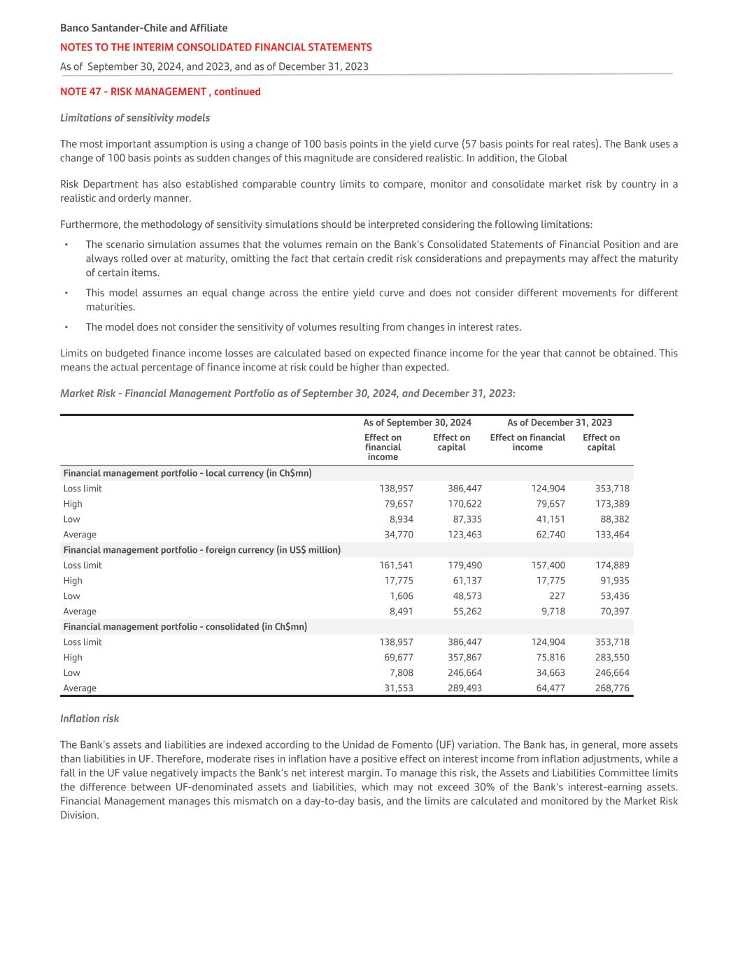 NOTE 47 - RISK MANAGEMENT , continued Limitations of sensitivity models The most important assumption is using a change of 100 basis points in the yield curve (57 basis points for real rates). The Bank uses a change of 100 basis points as sudden changes of this magnitude are considered realistic. In addition, the Global Risk Department has also established comparable country limits to compare, monitor and consolidate market risk by country in a realistic and orderly manner. Furthermore, the methodology of sensitivity simulations should be interpreted considering the following limitations: • The scenario simulation assumes that the volumes remain on the Bank's Consolidated Statements of Financial Position and are always rolled over at maturity, omitting the fact that certain credit risk considerations and prepayments may affect the maturity of certain items. • This model assumes an equal change across the entire yield curve and does not consider different movements for different maturities. • The model does not consider the sensitivity of volumes resulting from changes in interest rates. Limits on budgeted finance income losses are calculated based on expected finance income for the year that cannot be obtained. This means the actual percentage of finance income at risk could be higher than expected. Market Risk - Financial Management Portfolio as of September 30, 2024, and December 31, 2023: As of September 30, 2024 As of December 31, 2023   Effect on financial income Effect on capital Effect on financial income Effect on capital Financial management portfolio - local currency (in Ch$mn) Loss limit 138,957 386,447 124,904 353,718 High 79,657 170,622 79,657 173,389 Low 8,934 87,335 41,151 88,382 Average 34,770 123,463 62,740 133,464 Financial management portfolio - foreign currency (in US$ million) Loss limit 161,541 179,490 157,400 174,889 High 17,775 61,137 17,775 91,935 Low 1,606 48,573 227 53,436 Average 8,491 55,262 9,718 70,397 Financial management portfolio - consolidated (in Ch$mn) Loss limit 138,957 386,447 124,904 353,718 High 69,677 357,867 75,816 283,550 Low 7,808 246,664 34,663 246,664 Average 31,553 289,493 64,477 268,776 Inflation risk The Bank's assets and liabilities are indexed according to the Unidad de Fomento (UF) variation. The Bank has, in general, more assets than liabilities in UF. Therefore, moderate rises in inflation have a positive effect on interest income from inflation adjustments, while a fall in the UF value negatively impacts the Bank's net interest margin. To manage this risk, the Assets and Liabilities Committee limits the difference between UF-denominated assets and liabilities, which may not exceed 30% of the Bank's interest-earning assets. Financial Management manages this mismatch on a day-to-day basis, and the limits are calculated and monitored by the Market Risk Division. Banco Santander-Chile and Affiliate NOTES TO THE INTERIM CONSOLIDATED FINANCIAL STATEMENTS As of September 30, 2024, and 2023, and as of December 31, 2023