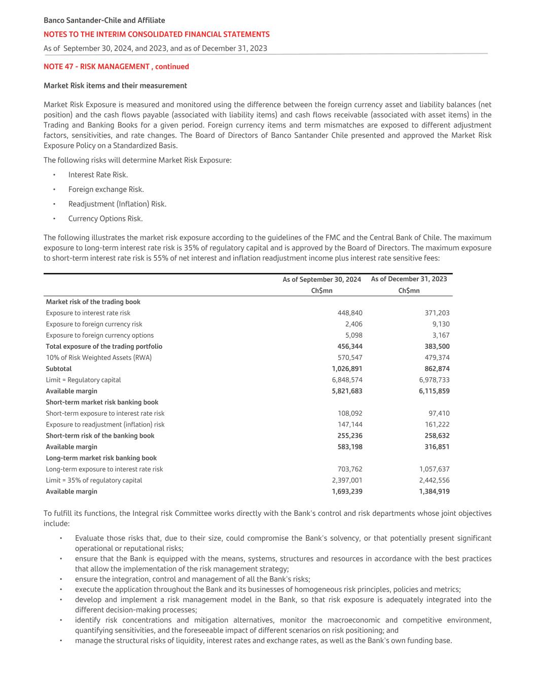 NOTE 47 - RISK MANAGEMENT , continued Market Risk items and their measurement Market Risk Exposure is measured and monitored using the difference between the foreign currency asset and liability balances (net position) and the cash flows payable (associated with liability items) and cash flows receivable (associated with asset items) in the Trading and Banking Books for a given period. Foreign currency items and term mismatches are exposed to different adjustment factors, sensitivities, and rate changes. The Board of Directors of Banco Santander Chile presented and approved the Market Risk Exposure Policy on a Standardized Basis. The following risks will determine Market Risk Exposure: • Interest Rate Risk. • Foreign exchange Risk. • Readjustment (Inflation) Risk. • Currency Options Risk. The following illustrates the market risk exposure according to the guidelines of the FMC and the Central Bank of Chile. The maximum exposure to long-term interest rate risk is 35% of regulatory capital and is approved by the Board of Directors. The maximum exposure to short-term interest rate risk is 55% of net interest and inflation readjustment income plus interest rate sensitive fees: As of September 30, 2024 As of December 31, 2023 Ch$mn Ch$mn Market risk of the trading book Exposure to interest rate risk 448,840 371,203 Exposure to foreign currency risk 2,406 9,130 Exposure to foreign currency options 5,098 3,167 Total exposure of the trading portfolio 456,344 383,500 10% of Risk Weighted Assets (RWA) 570,547 479,374 Subtotal 1,026,891 862,874 Limit = Regulatory capital 6,848,574 6,978,733 Available margin 5,821,683 6,115,859 Short-term market risk banking book Short-term exposure to interest rate risk 108,092 97,410 Exposure to readjustment (inflation) risk 147,144 161,222 Short-term risk of the banking book 255,236 258,632 Available margin 583,198 316,851 Long-term market risk banking book Long-term exposure to interest rate risk 703,762 1,057,637 Limit = 35% of regulatory capital 2,397,001 2,442,556 Available margin 1,693,239 1,384,919 To fulfill its functions, the Integral risk Committee works directly with the Bank's control and risk departments whose joint objectives include: • Evaluate those risks that, due to their size, could compromise the Bank's solvency, or that potentially present significant operational or reputational risks; • ensure that the Bank is equipped with the means, systems, structures and resources in accordance with the best practices that allow the implementation of the risk management strategy; • ensure the integration, control and management of all the Bank's risks; • execute the application throughout the Bank and its businesses of homogeneous risk principles, policies and metrics; • develop and implement a risk management model in the Bank, so that risk exposure is adequately integrated into the different decision-making processes; • identify risk concentrations and mitigation alternatives, monitor the macroeconomic and competitive environment, quantifying sensitivities, and the foreseeable impact of different scenarios on risk positioning; and • manage the structural risks of liquidity, interest rates and exchange rates, as well as the Bank's own funding base. Banco Santander-Chile and Affiliate NOTES TO THE INTERIM CONSOLIDATED FINANCIAL STATEMENTS As of September 30, 2024, and 2023, and as of December 31, 2023