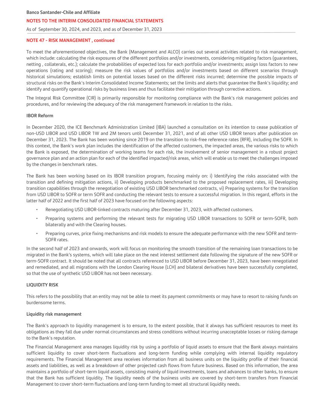 NOTE 47 - RISK MANAGEMENT , continued To meet the aforementioned objectives, the Bank (Management and ALCO) carries out several activities related to risk management, which include: calculating the risk exposures of the different portfolios and/or investments, considering mitigating factors (guarantees, netting , collaterals, etc.); calculate the probabilities of expected loss for each portfolio and/or investments; assign loss factors to new operations (rating and scoring); measure the risk values of portfolios and/or investments based on different scenarios through historical simulations; establish limits on potential losses based on the different risks incurred; determine the possible impacts of structural risks on the Bank's Interim Consolidated Income Statements; set the limits and alerts that guarantee the Bank's liquidity; and identify and quantify operational risks by business lines and thus facilitate their mitigation through corrective actions. The Integral Risk Committee (CIR) is primarily responsible for monitoring compliance with the Bank's risk management policies and procedures, and for reviewing the adequacy of the risk management framework in relation to the risks. IBOR Reform In December 2020, the ICE Benchmark Administration Limited (IBA) launched a consultation on its intention to cease publication of non-USD LIBOR and USD LIBOR 1W and 2M tenors until December 31, 2021, and of all other USD LIBOR tenors after publication on December 31, 2023. The Bank has been working since 2019 on the transition to risk-free reference rates (RFR), including the SOFR. In this context, the Bank's work plan includes the identification of the affected customers, the impacted areas, the various risks to which the Bank is exposed, the determination of working teams for each risk, the involvement of senior management in a robust project governance plan and an action plan for each of the identified impacted/risk areas, which will enable us to meet the challenges imposed by the changes in benchmark rates. The Bank has been working based on its IBOR transition program, focusing mainly on: i) Identifying the risks associated with the transition and defining mitigation actions, ii) Developing products benchmarked to the proposed replacement rates, iii) Developing transition capabilities through the renegotiation of existing USD LIBOR benchmarked contracts, vi) Preparing systems for the transition from USD LIBOR to SOFR or term SOFR and conducting the relevant tests to ensure a successful migration. In this regard, efforts in the latter half of 2022 and the first half of 2023 have focused on the following aspects: • Renegotiating USD LIBOR-linked contracts maturing after December 31, 2023, with affected customers. • Preparing systems and performing the relevant tests for migrating USD LIBOR transactions to SOFR or term-SOFR, both bilaterally and with the Clearing houses. • Preparing curves, price fixing mechanisms and risk models to ensure the adequate performance with the new SOFR and term- SOFR rates. In the second half of 2023 and onwards, work will focus on monitoring the smooth transition of the remaining loan transactions to be migrated in the Bank’s systems, which will take place on the next interest settlement date following the signature of the new SOFR or term-SOFR contract. It should be noted that all contracts referenced to USD LIBOR before December 31, 2023, have been renegotiated and remediated, and all migrations with the London Clearing House (LCH) and bilateral derivatives have been successfully completed, so that the use of synthetic USD LIBOR has not been necessary. LIQUIDITY RISK This refers to the possibility that an entity may not be able to meet its payment commitments or may have to resort to raising funds on burdensome terms. Liquidity risk management The Bank's approach to liquidity management is to ensure, to the extent possible, that it always has sufficient resources to meet its obligations as they fall due under normal circumstances and stress conditions without incurring unacceptable losses or risking damage to the Bank's reputation. The Financial Management area manages liquidity risk by using a portfolio of liquid assets to ensure that the Bank always maintains sufficient liquidity to cover short-term fluctuations and long-term funding while complying with internal liquidity regulatory requirements. The Financial Management area receives information from all business units on the liquidity profile of their financial assets and liabilities, as well as a breakdown of other projected cash flows from future business. Based on this information, the area maintains a portfolio of short-term liquid assets, consisting mainly of liquid investments, loans and advances to other banks, to ensure that the Bank has sufficient liquidity. The liquidity needs of the business units are covered by short-term transfers from Financial Management to cover short-term fluctuations and long-term funding to meet all structural liquidity needs. Banco Santander-Chile and Affiliate NOTES TO THE INTERIM CONSOLIDATED FINANCIAL STATEMENTS As of September 30, 2024, and 2023, and as of December 31, 2023