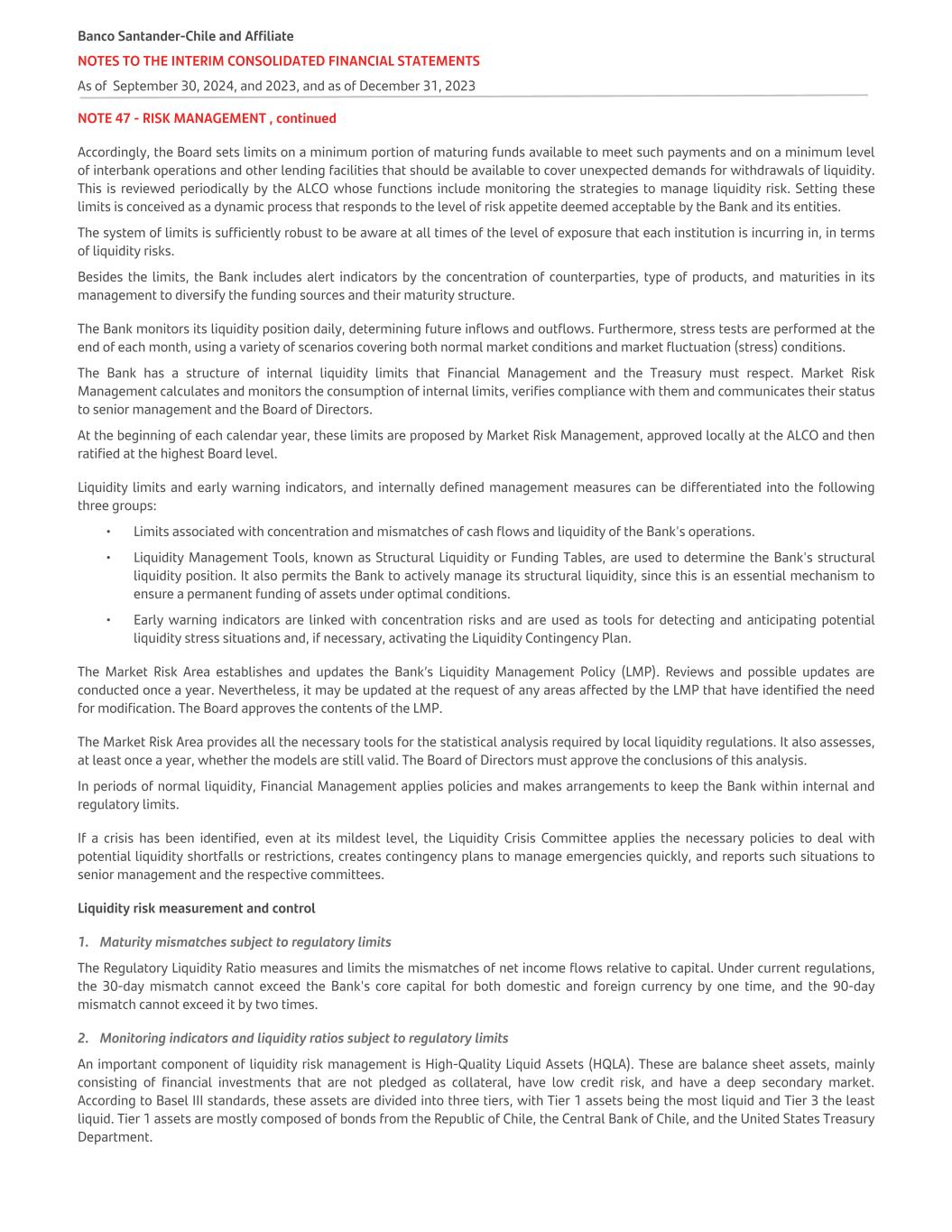 NOTE 47 - RISK MANAGEMENT , continued Accordingly, the Board sets limits on a minimum portion of maturing funds available to meet such payments and on a minimum level of interbank operations and other lending facilities that should be available to cover unexpected demands for withdrawals of liquidity. This is reviewed periodically by the ALCO whose functions include monitoring the strategies to manage liquidity risk. Setting these limits is conceived as a dynamic process that responds to the level of risk appetite deemed acceptable by the Bank and its entities. The system of limits is sufficiently robust to be aware at all times of the level of exposure that each institution is incurring in, in terms of liquidity risks. Besides the limits, the Bank includes alert indicators by the concentration of counterparties, type of products, and maturities in its management to diversify the funding sources and their maturity structure. The Bank monitors its liquidity position daily, determining future inflows and outflows. Furthermore, stress tests are performed at the end of each month, using a variety of scenarios covering both normal market conditions and market fluctuation (stress) conditions. The Bank has a structure of internal liquidity limits that Financial Management and the Treasury must respect. Market Risk Management calculates and monitors the consumption of internal limits, verifies compliance with them and communicates their status to senior management and the Board of Directors. At the beginning of each calendar year, these limits are proposed by Market Risk Management, approved locally at the ALCO and then ratified at the highest Board level. Liquidity limits and early warning indicators, and internally defined management measures can be differentiated into the following three groups: • Limits associated with concentration and mismatches of cash flows and liquidity of the Bank's operations. • Liquidity Management Tools, known as Structural Liquidity or Funding Tables, are used to determine the Bank's structural liquidity position. It also permits the Bank to actively manage its structural liquidity, since this is an essential mechanism to ensure a permanent funding of assets under optimal conditions. • Early warning indicators are linked with concentration risks and are used as tools for detecting and anticipating potential liquidity stress situations and, if necessary, activating the Liquidity Contingency Plan. The Market Risk Area establishes and updates the Bank’s Liquidity Management Policy (LMP). Reviews and possible updates are conducted once a year. Nevertheless, it may be updated at the request of any areas affected by the LMP that have identified the need for modification. The Board approves the contents of the LMP. The Market Risk Area provides all the necessary tools for the statistical analysis required by local liquidity regulations. It also assesses, at least once a year, whether the models are still valid. The Board of Directors must approve the conclusions of this analysis. In periods of normal liquidity, Financial Management applies policies and makes arrangements to keep the Bank within internal and regulatory limits. If a crisis has been identified, even at its mildest level, the Liquidity Crisis Committee applies the necessary policies to deal with potential liquidity shortfalls or restrictions, creates contingency plans to manage emergencies quickly, and reports such situations to senior management and the respective committees. Liquidity risk measurement and control 1. Maturity mismatches subject to regulatory limits The Regulatory Liquidity Ratio measures and limits the mismatches of net income flows relative to capital. Under current regulations, the 30-day mismatch cannot exceed the Bank's core capital for both domestic and foreign currency by one time, and the 90-day mismatch cannot exceed it by two times. 2. Monitoring indicators and liquidity ratios subject to regulatory limits An important component of liquidity risk management is High-Quality Liquid Assets (HQLA). These are balance sheet assets, mainly consisting of financial investments that are not pledged as collateral, have low credit risk, and have a deep secondary market. According to Basel III standards, these assets are divided into three tiers, with Tier 1 assets being the most liquid and Tier 3 the least liquid. Tier 1 assets are mostly composed of bonds from the Republic of Chile, the Central Bank of Chile, and the United States Treasury Department. Banco Santander-Chile and Affiliate NOTES TO THE INTERIM CONSOLIDATED FINANCIAL STATEMENTS As of September 30, 2024, and 2023, and as of December 31, 2023