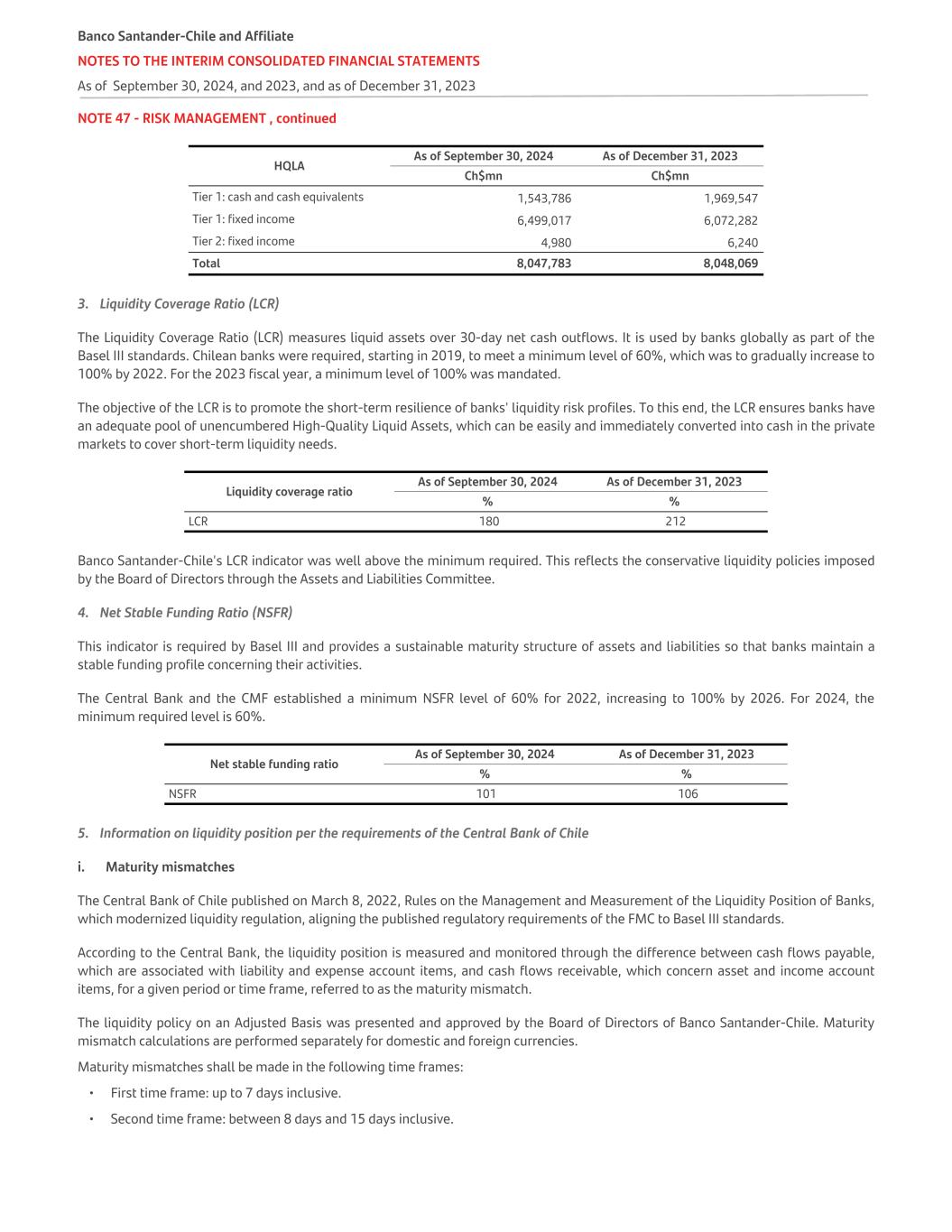 NOTE 47 - RISK MANAGEMENT , continued HQLA As of September 30, 2024 As of December 31, 2023 Ch$mn Ch$mn Tier 1: cash and cash equivalents 1,543,786 1,969,547 Tier 1: fixed income 6,499,017 6,072,282 Tier 2: fixed income 4,980 6,240 Total 8,047,783 8,048,069 3. Liquidity Coverage Ratio (LCR) The Liquidity Coverage Ratio (LCR) measures liquid assets over 30-day net cash outflows. It is used by banks globally as part of the Basel III standards. Chilean banks were required, starting in 2019, to meet a minimum level of 60%, which was to gradually increase to 100% by 2022. For the 2023 fiscal year, a minimum level of 100% was mandated. The objective of the LCR is to promote the short-term resilience of banks' liquidity risk profiles. To this end, the LCR ensures banks have an adequate pool of unencumbered High-Quality Liquid Assets, which can be easily and immediately converted into cash in the private markets to cover short-term liquidity needs. Liquidity coverage ratio As of September 30, 2024 As of December 31, 2023 % % LCR 180 212 Banco Santander-Chile's LCR indicator was well above the minimum required. This reflects the conservative liquidity policies imposed by the Board of Directors through the Assets and Liabilities Committee. 4. Net Stable Funding Ratio (NSFR) This indicator is required by Basel III and provides a sustainable maturity structure of assets and liabilities so that banks maintain a stable funding profile concerning their activities. The Central Bank and the CMF established a minimum NSFR level of 60% for 2022, increasing to 100% by 2026. For 2024, the minimum required level is 60%. Net stable funding ratio As of September 30, 2024 As of December 31, 2023 % % NSFR 101 106 5. Information on liquidity position per the requirements of the Central Bank of Chile i. Maturity mismatches The Central Bank of Chile published on March 8, 2022, Rules on the Management and Measurement of the Liquidity Position of Banks, which modernized liquidity regulation, aligning the published regulatory requirements of the FMC to Basel III standards. According to the Central Bank, the liquidity position is measured and monitored through the difference between cash flows payable, which are associated with liability and expense account items, and cash flows receivable, which concern asset and income account items, for a given period or time frame, referred to as the maturity mismatch. The liquidity policy on an Adjusted Basis was presented and approved by the Board of Directors of Banco Santander-Chile. Maturity mismatch calculations are performed separately for domestic and foreign currencies. Maturity mismatches shall be made in the following time frames: • First time frame: up to 7 days inclusive. • Second time frame: between 8 days and 15 days inclusive. Banco Santander-Chile and Affiliate NOTES TO THE INTERIM CONSOLIDATED FINANCIAL STATEMENTS As of September 30, 2024, and 2023, and as of December 31, 2023
