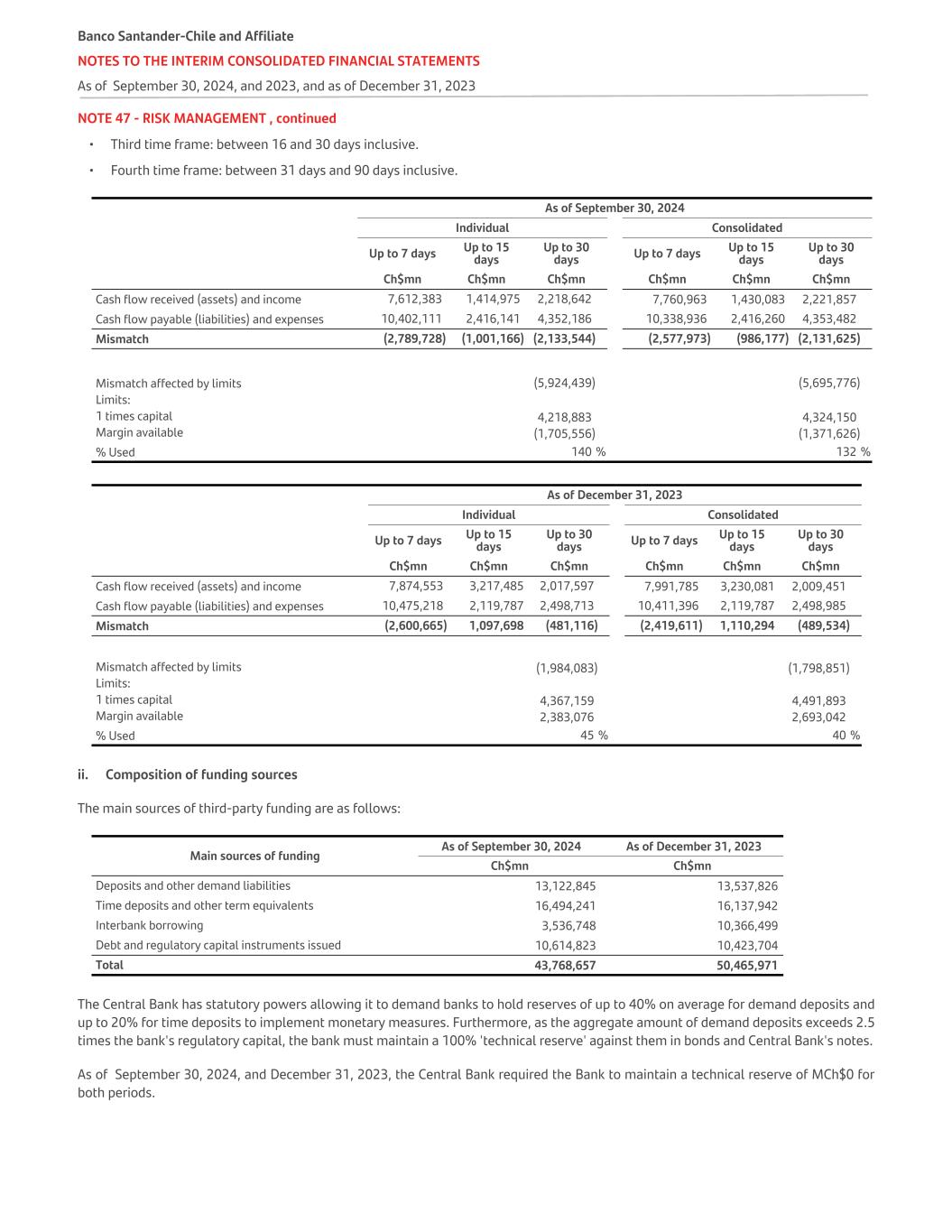 NOTE 47 - RISK MANAGEMENT , continued • Third time frame: between 16 and 30 days inclusive. • Fourth time frame: between 31 days and 90 days inclusive. As of September 30, 2024 Individual Consolidated Up to 7 days Up to 15 days Up to 30 days Up to 7 days Up to 15 days Up to 30 days Ch$mn Ch$mn Ch$mn Ch$mn Ch$mn Ch$mn Cash flow received (assets) and income 7,612,383 1,414,975 2,218,642 7,760,963 1,430,083 2,221,857 Cash flow payable (liabilities) and expenses 10,402,111 2,416,141 4,352,186 10,338,936 2,416,260 4,353,482 Mismatch (2,789,728) (1,001,166) (2,133,544) (2,577,973) (986,177) (2,131,625) Mismatch affected by limits (5,924,439) (5,695,776) Limits: 1 times capital 4,218,883 4,324,150 Margin available (1,705,556) (1,371,626) % Used 140 % 132 % As of December 31, 2023 Individual Consolidated Up to 7 days Up to 15 days Up to 30 days Up to 7 days Up to 15 days Up to 30 days Ch$mn Ch$mn Ch$mn Ch$mn Ch$mn Ch$mn Cash flow received (assets) and income 7,874,553 3,217,485 2,017,597 7,991,785 3,230,081 2,009,451 Cash flow payable (liabilities) and expenses 10,475,218 2,119,787 2,498,713 10,411,396 2,119,787 2,498,985 Mismatch (2,600,665) 1,097,698 (481,116) (2,419,611) 1,110,294 (489,534) Mismatch affected by limits (1,984,083) (1,798,851) Limits: 1 times capital 4,367,159 4,491,893 Margin available 2,383,076 2,693,042 % Used 45 % 40 % ii. Composition of funding sources The main sources of third-party funding are as follows: Main sources of funding As of September 30, 2024 As of December 31, 2023 Ch$mn Ch$mn Deposits and other demand liabilities 13,122,845 13,537,826 Time deposits and other term equivalents 16,494,241 16,137,942 Interbank borrowing 3,536,748 10,366,499 Debt and regulatory capital instruments issued 10,614,823 10,423,704 Total 43,768,657 50,465,971 The Central Bank has statutory powers allowing it to demand banks to hold reserves of up to 40% on average for demand deposits and up to 20% for time deposits to implement monetary measures. Furthermore, as the aggregate amount of demand deposits exceeds 2.5 times the bank's regulatory capital, the bank must maintain a 100% 'technical reserve' against them in bonds and Central Bank's notes. As of September 30, 2024, and December 31, 2023, the Central Bank required the Bank to maintain a technical reserve of MCh$0 for both periods. Banco Santander-Chile and Affiliate NOTES TO THE INTERIM CONSOLIDATED FINANCIAL STATEMENTS As of September 30, 2024, and 2023, and as of December 31, 2023