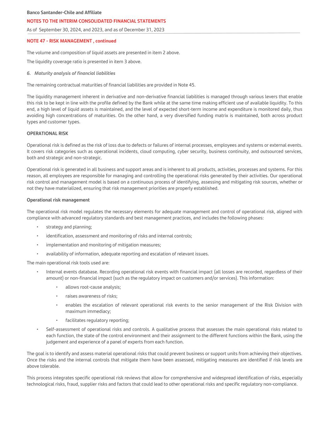 NOTE 47 - RISK MANAGEMENT , continued The volume and composition of liquid assets are presented in item 2 above. The liquidity coverage ratio is presented in item 3 above. 6. Maturity analysis of financial liabilities The remaining contractual maturities of financial liabilities are provided in Note 45. The liquidity management inherent in derivative and non-derivative financial liabilities is managed through various levers that enable this risk to be kept in line with the profile defined by the Bank while at the same time making efficient use of available liquidity. To this end, a high level of liquid assets is maintained, and the level of expected short-term income and expenditure is monitored daily, thus avoiding high concentrations of maturities. On the other hand, a very diversified funding matrix is maintained, both across product types and customer types. OPERATIONAL RISK Operational risk is defined as the risk of loss due to defects or failures of internal processes, employees and systems or external events. It covers risk categories such as operational incidents, cloud computing, cyber security, business continuity, and outsourced services, both and strategic and non-strategic. Operational risk is generated in all business and support areas and is inherent to all products, activities, processes and systems. For this reason, all employees are responsible for managing and controlling the operational risks generated by their activities. Our operational risk control and management model is based on a continuous process of identifying, assessing and mitigating risk sources, whether or not they have materialized, ensuring that risk management priorities are properly established. Operational risk management The operational risk model regulates the necessary elements for adequate management and control of operational risk, aligned with compliance with advanced regulatory standards and best management practices, and includes the following phases: • strategy and planning; • identification, assessment and monitoring of risks and internal controls; • implementation and monitoring of mitigation measures; • availability of information, adequate reporting and escalation of relevant issues. The main operational risk tools used are: • Internal events database. Recording operational risk events with financial impact (all losses are recorded, regardless of their amount) or non-financial impact (such as the regulatory impact on customers and/or services). This information: • allows root-cause analysis; • raises awareness of risks; • enables the escalation of relevant operational risk events to the senior management of the Risk Division with maximum immediacy; • facilitates regulatory reporting; • Self-assessment of operational risks and controls. A qualitative process that assesses the main operational risks related to each function, the state of the control environment and their assignment to the different functions within the Bank, using the judgement and experience of a panel of experts from each function. The goal is to identify and assess material operational risks that could prevent business or support units from achieving their objectives. Once the risks and the internal controls that mitigate them have been assessed, mitigating measures are identified if risk levels are above tolerable. This process integrates specific operational risk reviews that allow for comprehensive and widespread identification of risks, especially technological risks, fraud, supplier risks and factors that could lead to other operational risks and specific regulatory non-compliance. Banco Santander-Chile and Affiliate NOTES TO THE INTERIM CONSOLIDATED FINANCIAL STATEMENTS As of September 30, 2024, and 2023, and as of December 31, 2023