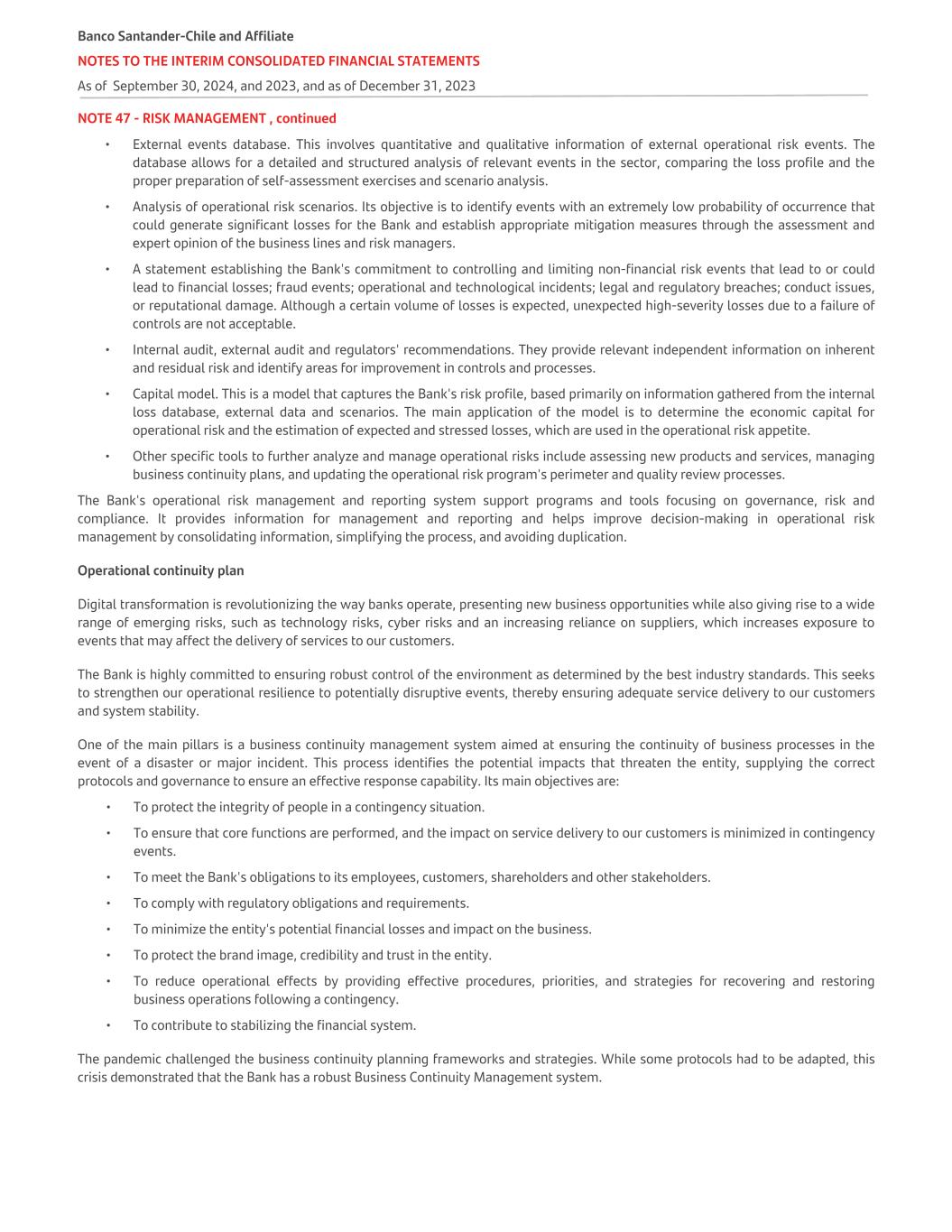 NOTE 47 - RISK MANAGEMENT , continued • External events database. This involves quantitative and qualitative information of external operational risk events. The database allows for a detailed and structured analysis of relevant events in the sector, comparing the loss profile and the proper preparation of self-assessment exercises and scenario analysis. • Analysis of operational risk scenarios. Its objective is to identify events with an extremely low probability of occurrence that could generate significant losses for the Bank and establish appropriate mitigation measures through the assessment and expert opinion of the business lines and risk managers. • A statement establishing the Bank's commitment to controlling and limiting non-financial risk events that lead to or could lead to financial losses; fraud events; operational and technological incidents; legal and regulatory breaches; conduct issues, or reputational damage. Although a certain volume of losses is expected, unexpected high-severity losses due to a failure of controls are not acceptable. • Internal audit, external audit and regulators' recommendations. They provide relevant independent information on inherent and residual risk and identify areas for improvement in controls and processes. • Capital model. This is a model that captures the Bank's risk profile, based primarily on information gathered from the internal loss database, external data and scenarios. The main application of the model is to determine the economic capital for operational risk and the estimation of expected and stressed losses, which are used in the operational risk appetite. • Other specific tools to further analyze and manage operational risks include assessing new products and services, managing business continuity plans, and updating the operational risk program's perimeter and quality review processes. The Bank's operational risk management and reporting system support programs and tools focusing on governance, risk and compliance. It provides information for management and reporting and helps improve decision-making in operational risk management by consolidating information, simplifying the process, and avoiding duplication. Operational continuity plan Digital transformation is revolutionizing the way banks operate, presenting new business opportunities while also giving rise to a wide range of emerging risks, such as technology risks, cyber risks and an increasing reliance on suppliers, which increases exposure to events that may affect the delivery of services to our customers. The Bank is highly committed to ensuring robust control of the environment as determined by the best industry standards. This seeks to strengthen our operational resilience to potentially disruptive events, thereby ensuring adequate service delivery to our customers and system stability. One of the main pillars is a business continuity management system aimed at ensuring the continuity of business processes in the event of a disaster or major incident. This process identifies the potential impacts that threaten the entity, supplying the correct protocols and governance to ensure an effective response capability. Its main objectives are: • To protect the integrity of people in a contingency situation. • To ensure that core functions are performed, and the impact on service delivery to our customers is minimized in contingency events. • To meet the Bank's obligations to its employees, customers, shareholders and other stakeholders. • To comply with regulatory obligations and requirements. • To minimize the entity's potential financial losses and impact on the business. • To protect the brand image, credibility and trust in the entity. • To reduce operational effects by providing effective procedures, priorities, and strategies for recovering and restoring business operations following a contingency. • To contribute to stabilizing the financial system. The pandemic challenged the business continuity planning frameworks and strategies. While some protocols had to be adapted, this crisis demonstrated that the Bank has a robust Business Continuity Management system. Banco Santander-Chile and Affiliate NOTES TO THE INTERIM CONSOLIDATED FINANCIAL STATEMENTS As of September 30, 2024, and 2023, and as of December 31, 2023