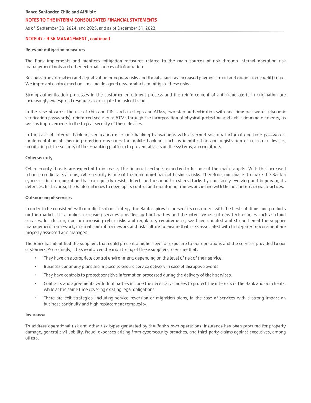 NOTE 47 - RISK MANAGEMENT , continued Relevant mitigation measures The Bank implements and monitors mitigation measures related to the main sources of risk through internal operation risk management tools and other external sources of information. Business transformation and digitalization bring new risks and threats, such as increased payment fraud and origination (credit) fraud. We improved control mechanisms and designed new products to mitigate these risks. Strong authentication processes in the customer enrollment process and the reinforcement of anti-fraud alerts in origination are increasingly widespread resources to mitigate the risk of fraud. In the case of cards, the use of chip and PIN cards in shops and ATMs, two-step authentication with one-time passwords (dynamic verification passwords), reinforced security at ATMs through the incorporation of physical protection and anti-skimming elements, as well as improvements in the logical security of these devices. In the case of Internet banking, verification of online banking transactions with a second security factor of one-time passwords, implementation of specific protection measures for mobile banking, such as identification and registration of customer devices, monitoring of the security of the e-banking platform to prevent attacks on the systems, among others. Cybersecurity Cybersecurity threats are expected to increase. The financial sector is expected to be one of the main targets. With the increased reliance on digital systems, cybersecurity is one of the main non-financial business risks. Therefore, our goal is to make the Bank a cyber-resilient organization that can quickly resist, detect, and respond to cyber-attacks by constantly evolving and improving its defenses. In this area, the Bank continues to develop its control and monitoring framework in line with the best international practices. Outsourcing of services In order to be consistent with our digitization strategy, the Bank aspires to present its customers with the best solutions and products on the market. This implies increasing services provided by third parties and the intensive use of new technologies such as cloud services. In addition, due to increasing cyber risks and regulatory requirements, we have updated and strengthened the supplier management framework, internal control framework and risk culture to ensure that risks associated with third-party procurement are properly assessed and managed. The Bank has identified the suppliers that could present a higher level of exposure to our operations and the services provided to our customers. Accordingly, it has reinforced the monitoring of these suppliers to ensure that: • They have an appropriate control environment, depending on the level of risk of their service. • Business continuity plans are in place to ensure service delivery in case of disruptive events. • They have controls to protect sensitive information processed during the delivery of their services. • Contracts and agreements with third parties include the necessary clauses to protect the interests of the Bank and our clients, while at the same time covering existing legal obligations. • There are exit strategies, including service reversion or migration plans, in the case of services with a strong impact on business continuity and high replacement complexity. Insurance To address operational risk and other risk types generated by the Bank's own operations, insurance has been procured for property damage, general civil liability, fraud, expenses arising from cybersecurity breaches, and third-party claims against executives, among others. Banco Santander-Chile and Affiliate NOTES TO THE INTERIM CONSOLIDATED FINANCIAL STATEMENTS As of September 30, 2024, and 2023, and as of December 31, 2023