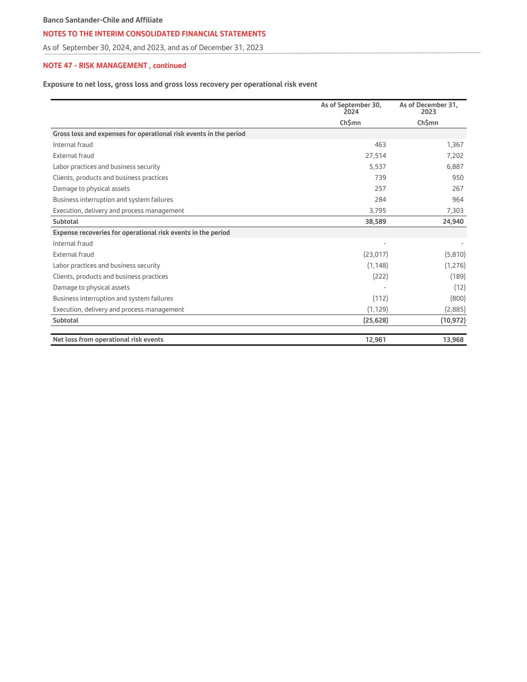 NOTE 47 - RISK MANAGEMENT , continued Exposure to net loss, gross loss and gross loss recovery per operational risk event As of September 30, 2024 As of December 31, 2023 Ch$mn Ch$mn Gross loss and expenses for operational risk events in the period Internal fraud 463 1,367 External fraud 27,514 7,202 Labor practices and business security 5,537 6,887 Clients, products and business practices 739 950 Damage to physical assets 257 267 Business interruption and system failures 284 964 Execution, delivery and process management 3,795 7,303 Subtotal 38,589 24,940 Expense recoveries for operational risk events in the period Internal fraud - - External fraud (23,017) (5,810) Labor practices and business security (1,148) (1,276) Clients, products and business practices (222) (189) Damage to physical assets - (12) Business interruption and system failures (112) (800) Execution, delivery and process management (1,129) (2,885) Subtotal (25,628) (10,972) Net loss from operational risk events 12,961 13,968 Banco Santander-Chile and Affiliate NOTES TO THE INTERIM CONSOLIDATED FINANCIAL STATEMENTS As of September 30, 2024, and 2023, and as of December 31, 2023