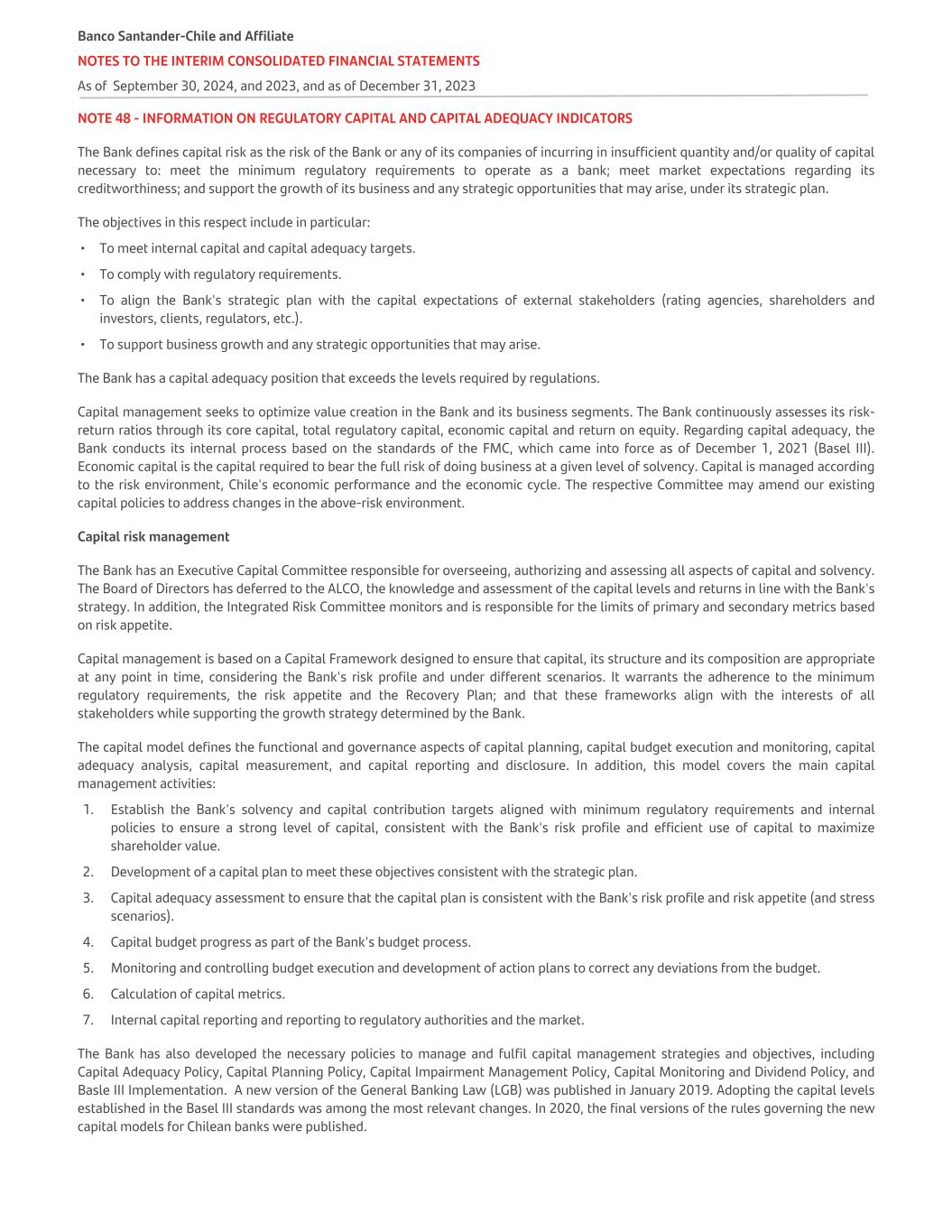 NOTE 48 - INFORMATION ON REGULATORY CAPITAL AND CAPITAL ADEQUACY INDICATORS The Bank defines capital risk as the risk of the Bank or any of its companies of incurring in insufficient quantity and/or quality of capital necessary to: meet the minimum regulatory requirements to operate as a bank; meet market expectations regarding its creditworthiness; and support the growth of its business and any strategic opportunities that may arise, under its strategic plan. The objectives in this respect include in particular: • To meet internal capital and capital adequacy targets. • To comply with regulatory requirements. • To align the Bank's strategic plan with the capital expectations of external stakeholders (rating agencies, shareholders and investors, clients, regulators, etc.). • To support business growth and any strategic opportunities that may arise. The Bank has a capital adequacy position that exceeds the levels required by regulations. Capital management seeks to optimize value creation in the Bank and its business segments. The Bank continuously assesses its risk- return ratios through its core capital, total regulatory capital, economic capital and return on equity. Regarding capital adequacy, the Bank conducts its internal process based on the standards of the FMC, which came into force as of December 1, 2021 (Basel III). Economic capital is the capital required to bear the full risk of doing business at a given level of solvency. Capital is managed according to the risk environment, Chile's economic performance and the economic cycle. The respective Committee may amend our existing capital policies to address changes in the above-risk environment. Capital risk management The Bank has an Executive Capital Committee responsible for overseeing, authorizing and assessing all aspects of capital and solvency. The Board of Directors has deferred to the ALCO, the knowledge and assessment of the capital levels and returns in line with the Bank's strategy. In addition, the Integrated Risk Committee monitors and is responsible for the limits of primary and secondary metrics based on risk appetite. Capital management is based on a Capital Framework designed to ensure that capital, its structure and its composition are appropriate at any point in time, considering the Bank's risk profile and under different scenarios. It warrants the adherence to the minimum regulatory requirements, the risk appetite and the Recovery Plan; and that these frameworks align with the interests of all stakeholders while supporting the growth strategy determined by the Bank. The capital model defines the functional and governance aspects of capital planning, capital budget execution and monitoring, capital adequacy analysis, capital measurement, and capital reporting and disclosure. In addition, this model covers the main capital management activities: 1. Establish the Bank's solvency and capital contribution targets aligned with minimum regulatory requirements and internal policies to ensure a strong level of capital, consistent with the Bank's risk profile and efficient use of capital to maximize shareholder value. 2. Development of a capital plan to meet these objectives consistent with the strategic plan. 3. Capital adequacy assessment to ensure that the capital plan is consistent with the Bank's risk profile and risk appetite (and stress scenarios). 4. Capital budget progress as part of the Bank's budget process. 5. Monitoring and controlling budget execution and development of action plans to correct any deviations from the budget. 6. Calculation of capital metrics. 7. Internal capital reporting and reporting to regulatory authorities and the market. The Bank has also developed the necessary policies to manage and fulfil capital management strategies and objectives, including Capital Adequacy Policy, Capital Planning Policy, Capital Impairment Management Policy, Capital Monitoring and Dividend Policy, and Basle III Implementation. A new version of the General Banking Law (LGB) was published in January 2019. Adopting the capital levels established in the Basel III standards was among the most relevant changes. In 2020, the final versions of the rules governing the new capital models for Chilean banks were published. Banco Santander-Chile and Affiliate NOTES TO THE INTERIM CONSOLIDATED FINANCIAL STATEMENTS As of September 30, 2024, and 2023, and as of December 31, 2023