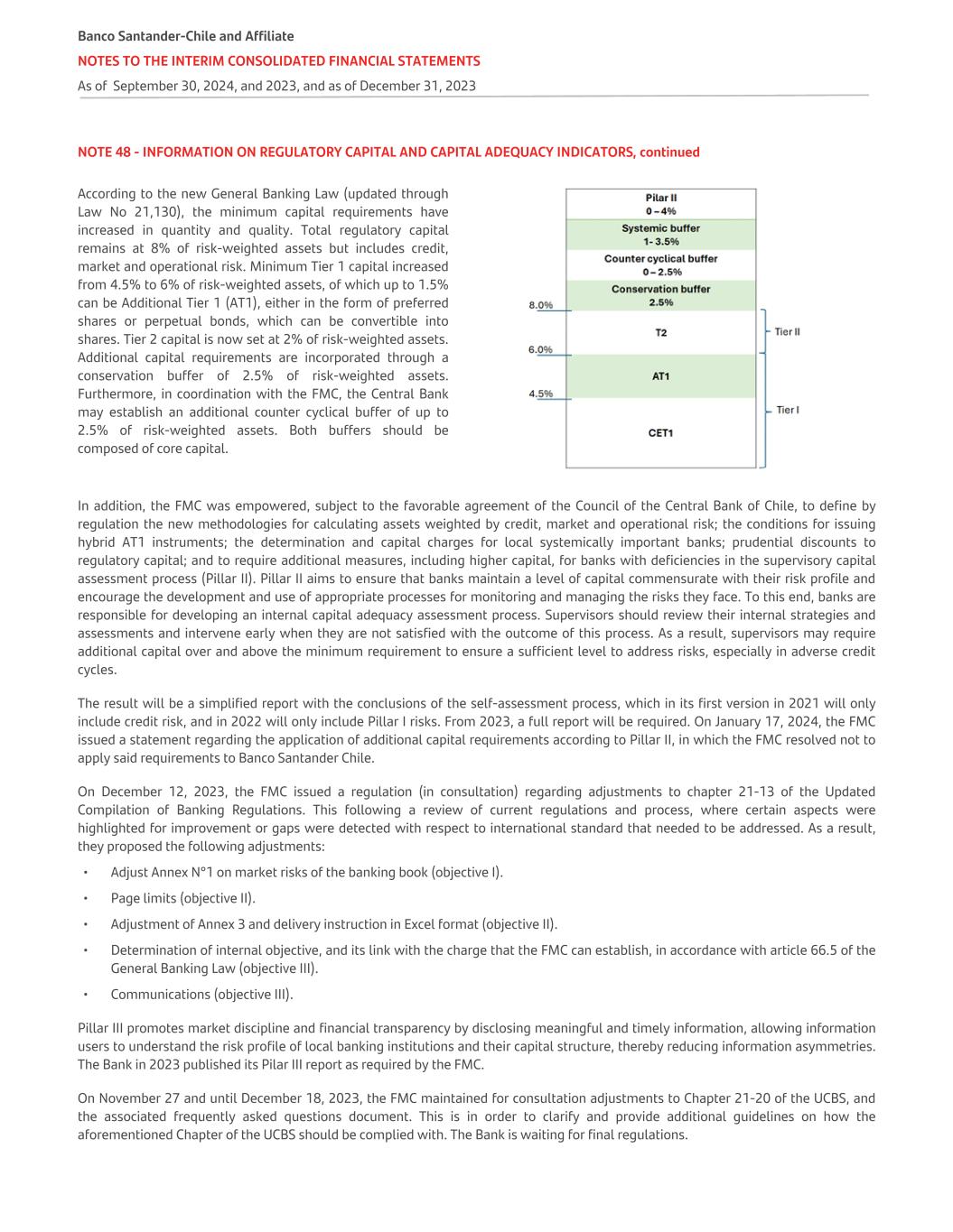 NOTE 48 - INFORMATION ON REGULATORY CAPITAL AND CAPITAL ADEQUACY INDICATORS, continued According to the new General Banking Law (updated through Law No 21,130), the minimum capital requirements have increased in quantity and quality. Total regulatory capital remains at 8% of risk-weighted assets but includes credit, market and operational risk. Minimum Tier 1 capital increased from 4.5% to 6% of risk-weighted assets, of which up to 1.5% can be Additional Tier 1 (AT1), either in the form of preferred shares or perpetual bonds, which can be convertible into shares. Tier 2 capital is now set at 2% of risk-weighted assets. Additional capital requirements are incorporated through a conservation buffer of 2.5% of risk-weighted assets. Furthermore, in coordination with the FMC, the Central Bank may establish an additional counter cyclical buffer of up to 2.5% of risk-weighted assets. Both buffers should be composed of core capital. In addition, the FMC was empowered, subject to the favorable agreement of the Council of the Central Bank of Chile, to define by regulation the new methodologies for calculating assets weighted by credit, market and operational risk; the conditions for issuing hybrid AT1 instruments; the determination and capital charges for local systemically important banks; prudential discounts to regulatory capital; and to require additional measures, including higher capital, for banks with deficiencies in the supervisory capital assessment process (Pillar II). Pillar II aims to ensure that banks maintain a level of capital commensurate with their risk profile and encourage the development and use of appropriate processes for monitoring and managing the risks they face. To this end, banks are responsible for developing an internal capital adequacy assessment process. Supervisors should review their internal strategies and assessments and intervene early when they are not satisfied with the outcome of this process. As a result, supervisors may require additional capital over and above the minimum requirement to ensure a sufficient level to address risks, especially in adverse credit cycles. The result will be a simplified report with the conclusions of the self-assessment process, which in its first version in 2021 will only include credit risk, and in 2022 will only include Pillar I risks. From 2023, a full report will be required. On January 17, 2024, the FMC issued a statement regarding the application of additional capital requirements according to Pillar II, in which the FMC resolved not to apply said requirements to Banco Santander Chile. On December 12, 2023, the FMC issued a regulation (in consultation) regarding adjustments to chapter 21-13 of the Updated Compilation of Banking Regulations. This following a review of current regulations and process, where certain aspects were highlighted for improvement or gaps were detected with respect to international standard that needed to be addressed. As a result, they proposed the following adjustments: • Adjust Annex N°1 on market risks of the banking book (objective I). • Page limits (objective II). • Adjustment of Annex 3 and delivery instruction in Excel format (objective II). • Determination of internal objective, and its link with the charge that the FMC can establish, in accordance with article 66.5 of the General Banking Law (objective III). • Communications (objective III). Pillar III promotes market discipline and financial transparency by disclosing meaningful and timely information, allowing information users to understand the risk profile of local banking institutions and their capital structure, thereby reducing information asymmetries. The Bank in 2023 published its Pilar III report as required by the FMC. On November 27 and until December 18, 2023, the FMC maintained for consultation adjustments to Chapter 21-20 of the UCBS, and the associated frequently asked questions document. This is in order to clarify and provide additional guidelines on how the aforementioned Chapter of the UCBS should be complied with. The Bank is waiting for final regulations. Banco Santander-Chile and Affiliate NOTES TO THE INTERIM CONSOLIDATED FINANCIAL STATEMENTS As of September 30, 2024, and 2023, and as of December 31, 2023