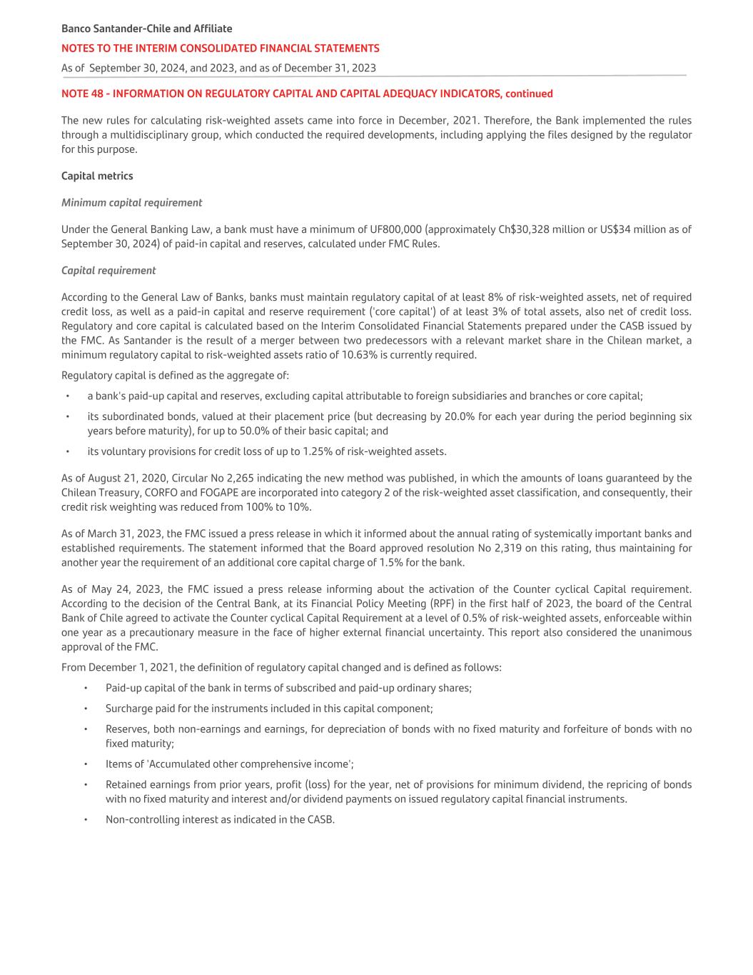 NOTE 48 - INFORMATION ON REGULATORY CAPITAL AND CAPITAL ADEQUACY INDICATORS, continued The new rules for calculating risk-weighted assets came into force in December, 2021. Therefore, the Bank implemented the rules through a multidisciplinary group, which conducted the required developments, including applying the files designed by the regulator for this purpose. Capital metrics Minimum capital requirement Under the General Banking Law, a bank must have a minimum of UF800,000 (approximately Ch$30,328 million or US$34 million as of September 30, 2024) of paid-in capital and reserves, calculated under FMC Rules. Capital requirement According to the General Law of Banks, banks must maintain regulatory capital of at least 8% of risk-weighted assets, net of required credit loss, as well as a paid-in capital and reserve requirement ('core capital') of at least 3% of total assets, also net of credit loss. Regulatory and core capital is calculated based on the Interim Consolidated Financial Statements prepared under the CASB issued by the FMC. As Santander is the result of a merger between two predecessors with a relevant market share in the Chilean market, a minimum regulatory capital to risk-weighted assets ratio of 10.63% is currently required. Regulatory capital is defined as the aggregate of: • a bank's paid-up capital and reserves, excluding capital attributable to foreign subsidiaries and branches or core capital; • its subordinated bonds, valued at their placement price (but decreasing by 20.0% for each year during the period beginning six years before maturity), for up to 50.0% of their basic capital; and • its voluntary provisions for credit loss of up to 1.25% of risk-weighted assets. As of August 21, 2020, Circular No 2,265 indicating the new method was published, in which the amounts of loans guaranteed by the Chilean Treasury, CORFO and FOGAPE are incorporated into category 2 of the risk-weighted asset classification, and consequently, their credit risk weighting was reduced from 100% to 10%. As of March 31, 2023, the FMC issued a press release in which it informed about the annual rating of systemically important banks and established requirements. The statement informed that the Board approved resolution No 2,319 on this rating, thus maintaining for another year the requirement of an additional core capital charge of 1.5% for the bank. As of May 24, 2023, the FMC issued a press release informing about the activation of the Counter cyclical Capital requirement. According to the decision of the Central Bank, at its Financial Policy Meeting (RPF) in the first half of 2023, the board of the Central Bank of Chile agreed to activate the Counter cyclical Capital Requirement at a level of 0.5% of risk-weighted assets, enforceable within one year as a precautionary measure in the face of higher external financial uncertainty. This report also considered the unanimous approval of the FMC. From December 1, 2021, the definition of regulatory capital changed and is defined as follows: • Paid-up capital of the bank in terms of subscribed and paid-up ordinary shares; • Surcharge paid for the instruments included in this capital component; • Reserves, both non-earnings and earnings, for depreciation of bonds with no fixed maturity and forfeiture of bonds with no fixed maturity; • Items of 'Accumulated other comprehensive income'; • Retained earnings from prior years, profit (loss) for the year, net of provisions for minimum dividend, the repricing of bonds with no fixed maturity and interest and/or dividend payments on issued regulatory capital financial instruments. • Non-controlling interest as indicated in the CASB. Banco Santander-Chile and Affiliate NOTES TO THE INTERIM CONSOLIDATED FINANCIAL STATEMENTS As of September 30, 2024, and 2023, and as of December 31, 2023