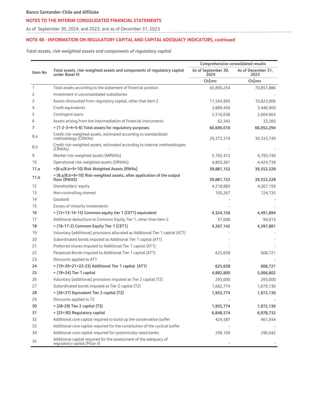 NOTE 48 - INFORMATION ON REGULATORY CAPITAL AND CAPITAL ADEQUACY INDICATORS, continued Total assets, risk-weighted assets and components of regulatory capital Item No Total assets, risk-weighted assets and components of regulatory capital under Basel III Comprehensive consolidated results As of September 30, 2024 As of December 31, 2023 Ch$mn Ch$mn 1 Total assets according to the statement of financial position 65,890,254 70,857,886 2 Investment in unconsolidated subsidiaries - 3 Assets discounted from regulatory capital, other that item 2 11,543,995 10,823,906 4 Credit equivalents 3,889,456 3,446,909 5 Contingent loans 2,516,638 2,604,665 6 Assets arising from the intermediation of financial instruments 62,343 33,260 7 = (1-2-3+4+5-6) Total assets for regulatory purposes 60,690,010 66,052,294 8.a Credit risk-weighted assets, estimated according to standardized methodology (CRWAs) 29,372,319 30,333,749 8.b Credit risk-weighted assets, estimated according to internal methodologies (CRWAs) - - 9 Market risk-weighted assets (MRWAs) 5,705,472 4,793,740 10 Operational risk-weighted assets (ORWAs) 4,803,361 4,424,739 11.a =(8.a/8.b+9+10) Risk Weighted Assets (RWAs) 39,881,152 39,552,228 11.b = (8.a/8.b+9+10) Risk-weighted assets, after application of the output floor (RWAS) 39,881,152 39,552,228 12 Shareholders' equity 4,218,883 4,367,159 13 Non-controlling interest 105,267 124,735 14 Goodwill - - 15 Excess of minority investments - - 16 = (12+13-14-15) Common equity tier 1 (CET1) equivalent 4,324,150 4,491,894 17 Additional deductions to Common Equity Tier 1, other than item 2 57,008 94,013 18 = (16-17-2) Common Equity Tier 1 (CET1) 4,267,142 4,397,881 19 Voluntary (additional) provisions allocated as Additional Tier 1 capital (AT1) - - 20 Subordinated bonds imputed as Additional Tier 1 capital (AT1) - - 21 Preferred shares imputed to Additional Tier 1 capital (AT1) - - 22 Perpetual Bonds imputed to Additional Tier 1 capital (AT1) 625,658 608,721 23 Discounts applied to AT1 - - 24 = (19+20+21+22-23) Additional Tier 1 capital (AT1) 625,658 608,721 25 = (18+24) Tier 1 capital 4,892,800 5,006,602 26 Voluntary (additional) provisions imputed as Tier 2 capital (T2) 293,000 293,000 27 Subordinated bonds imputed as Tier 2 capital (T2) 1,662,774 1,679,130 28 = (26+27) Equivalent Tier 2 capital (T2) 1,955,774 1,972,130 29 Discounts applied to T2 - - 30 = (28-29) Tier 2 capital (T2) 1,955,774 1,972,130 31 = (25+30) Regulatory capital 6,848,574 6,978,732 32 Additional core capital required to build up the conservation buffer 424,587 461,934 33 Additional core capital required for the constitution of the cyclical buffer - - 34 Additional core capital required for systemically rated banks 299,109 296,642 35 Additional capital required for the assessment of the adequacy of regulatory capital (Pillar II) - - Banco Santander-Chile and Affiliate NOTES TO THE INTERIM CONSOLIDATED FINANCIAL STATEMENTS As of September 30, 2024, and 2023, and as of December 31, 2023