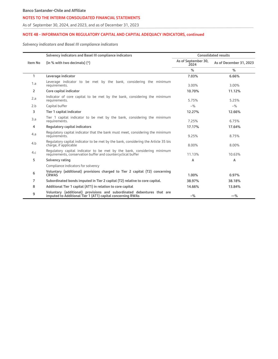 NOTE 48 - INFORMATION ON REGULATORY CAPITAL AND CAPITAL ADEQUACY INDICATORS, continued Solvency indicators and Basel III compliance indicators Item No Solvency indicators and Basel III compliance indicators Consolidated results (in % with two decimals) (*) As of September 30, 2024 As of December 31, 2023 % % 1 Leverage indicator 7.03% 6.66% 1.a Leverage indicator to be met by the bank, considering the minimum requirements. 3.00% 3.00% 2 Core capital indicator 10.70% 11.12% 2.a Indicator of core capital to be met by the bank, considering the minimum requirements. 5.75% 5.25% 2.b Capital buffer –% –% 3 Tier 1 capital indicator 12.27% 12.66% 3.a Tier 1 capital indicator to be met by the bank, considering the minimum requirements. 7.25% 6.75% 4 Regulatory capital indicators 17.17% 17.64% 4.a Regulatory capital indicator that the bank must meet, considering the minimum requirements. 9.25% 8.75% 4.b Regulatory capital indicator to be met by the bank, considering the Article 35 bis charge, if applicable 8.00% 8.00% 4.c Regulatory capital indicator to be met by the bank, considering minimum requirements, conservation buffer and countercyclical buffer 11.13% 10.63% 5 Solvency rating A A Compliance indicators for solvency 6 Voluntary (additional) provisions charged to Tier 2 capital (T2) concerning CRWAS 1.00% 0.97% 7 Subordinated bonds imputed in Tier 2 capital (T2) relative to core capital. 38.97% 38.18% 8 Additional Tier 1 capital (AT1) in relation to core capital 14.66% 13.84% 9 Voluntary (additional) provisions and subordinated debentures that are imputed to Additional Tier 1 (AT1) capital concerning RWAs –% —% Banco Santander-Chile and Affiliate NOTES TO THE INTERIM CONSOLIDATED FINANCIAL STATEMENTS As of September 30, 2024, and 2023, and as of December 31, 2023