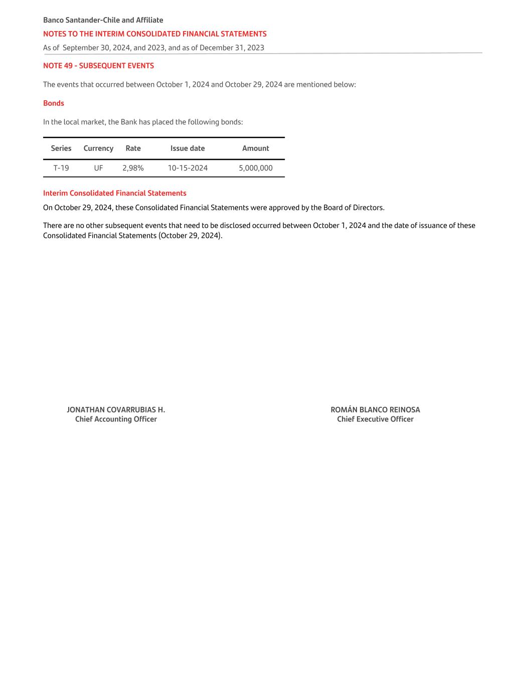 NOTE 49 - SUBSEQUENT EVENTS The events that occurred between October 1, 2024 and October 29, 2024 are mentioned below: Bonds In the local market, the Bank has placed the following bonds: Series Currency Rate Issue date Amount T-19 UF 2,98% 10-15-2024 5,000,000 Interim Consolidated Financial Statements On October 29, 2024, these Consolidated Financial Statements were approved by the Board of Directors. There are no other subsequent events that need to be disclosed occurred between October 1, 2024 and the date of issuance of these Consolidated Financial Statements (October 29, 2024). JONATHAN COVARRUBIAS H. Chief Accounting Officer ROMÁN BLANCO REINOSA Chief Executive Officer Banco Santander-Chile and Affiliate NOTES TO THE INTERIM CONSOLIDATED FINANCIAL STATEMENTS As of September 30, 2024, and 2023, and as of December 31, 2023