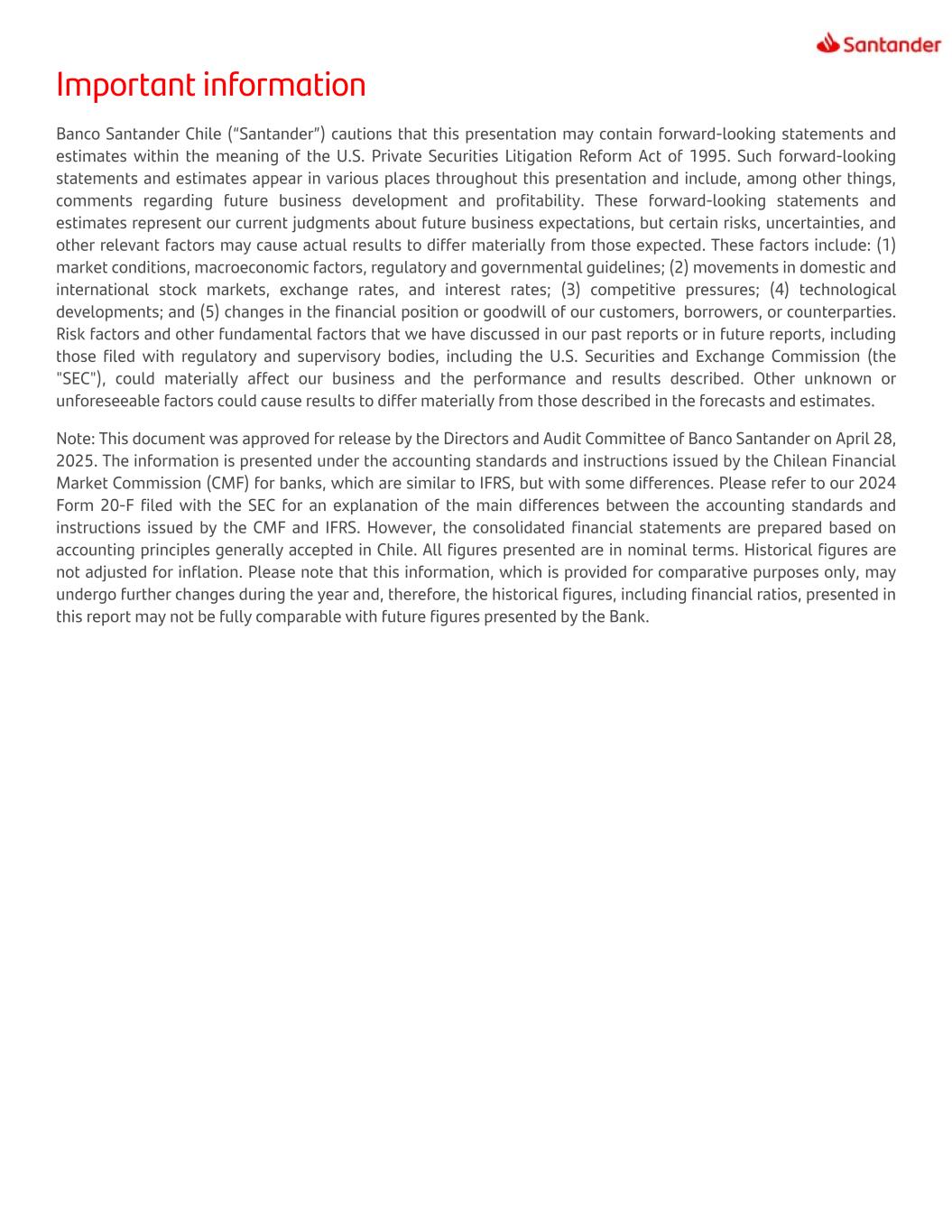 Important information Banco Santander Chile (“Santander”) cautions that this presentation may contain forward-looking statements and estimates within the meaning of the U.S. Private Securities Litigation Reform Act of 1995. Such forward-looking statements and estimates appear in various places throughout this presentation and include, among other things, comments regarding future business development and profitability. These forward-looking statements and estimates represent our current judgments about future business expectations, but certain risks, uncertainties, and other relevant factors may cause actual results to differ materially from those expected. These factors include: (1) market conditions, macroeconomic factors, regulatory and governmental guidelines; (2) movements in domestic and international stock markets, exchange rates, and interest rates; (3) competitive pressures; (4) technological developments; and (5) changes in the financial position or goodwill of our customers, borrowers, or counterparties. Risk factors and other fundamental factors that we have discussed in our past reports or in future reports, including those filed with regulatory and supervisory bodies, including the U.S. Securities and Exchange Commission (the "SEC"), could materially affect our business and the performance and results described. Other unknown or unforeseeable factors could cause results to differ materially from those described in the forecasts and estimates. Note: This document was approved for release by the Directors and Audit Committee of Banco Santander on April 28, 2025. The information is presented under the accounting standards and instructions issued by the Chilean Financial Market Commission (CMF) for banks, which are similar to IFRS, but with some differences. Please refer to our 2024 Form 20-F filed with the SEC for an explanation of the main differences between the accounting standards and instructions issued by the CMF and IFRS. However, the consolidated financial statements are prepared based on accounting principles generally accepted in Chile. All figures presented are in nominal terms. Historical figures are not adjusted for inflation. Please note that this information, which is provided for comparative purposes only, may undergo further changes during the year and, therefore, the historical figures, including financial ratios, presented in this report may not be fully comparable with future figures presented by the Bank.