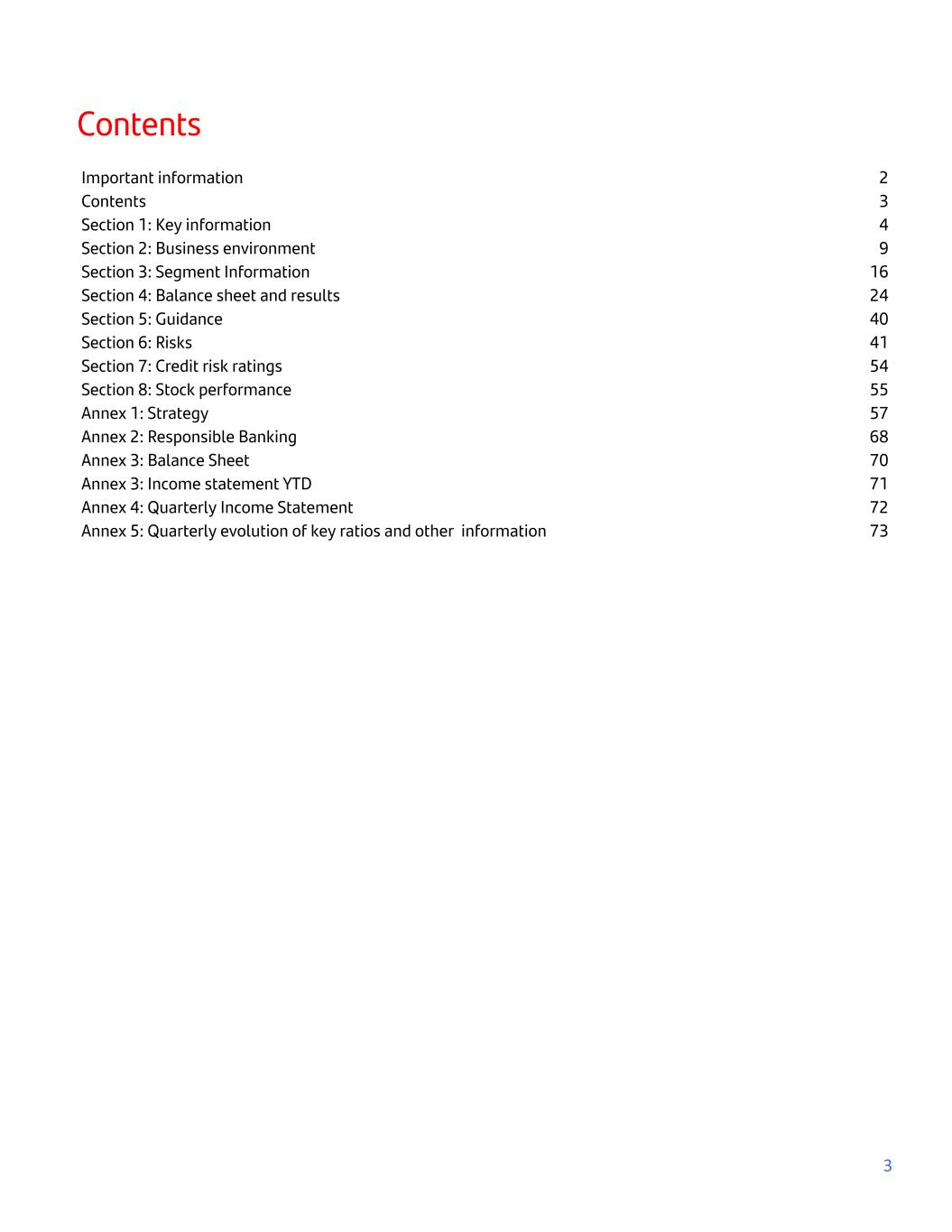 Contents Important information 2 Contents 3 Section 1: Key information 4 Section 2: Business environment 9 Section 3: Segment Information 16 Section 4: Balance sheet and results 24 Section 5: Guidance 40 Section 6: Risks 41 Section 7: Credit risk ratings 54 Section 8: Stock performance 55 Annex 1: Strategy 57 Annex 2: Responsible Banking 68 Annex 3: Balance Sheet 70 Annex 3: Income statement YTD 71 Annex 4: Quarterly Income Statement 72 Annex 5: Quarterly evolution of key ratios and other information 73 3