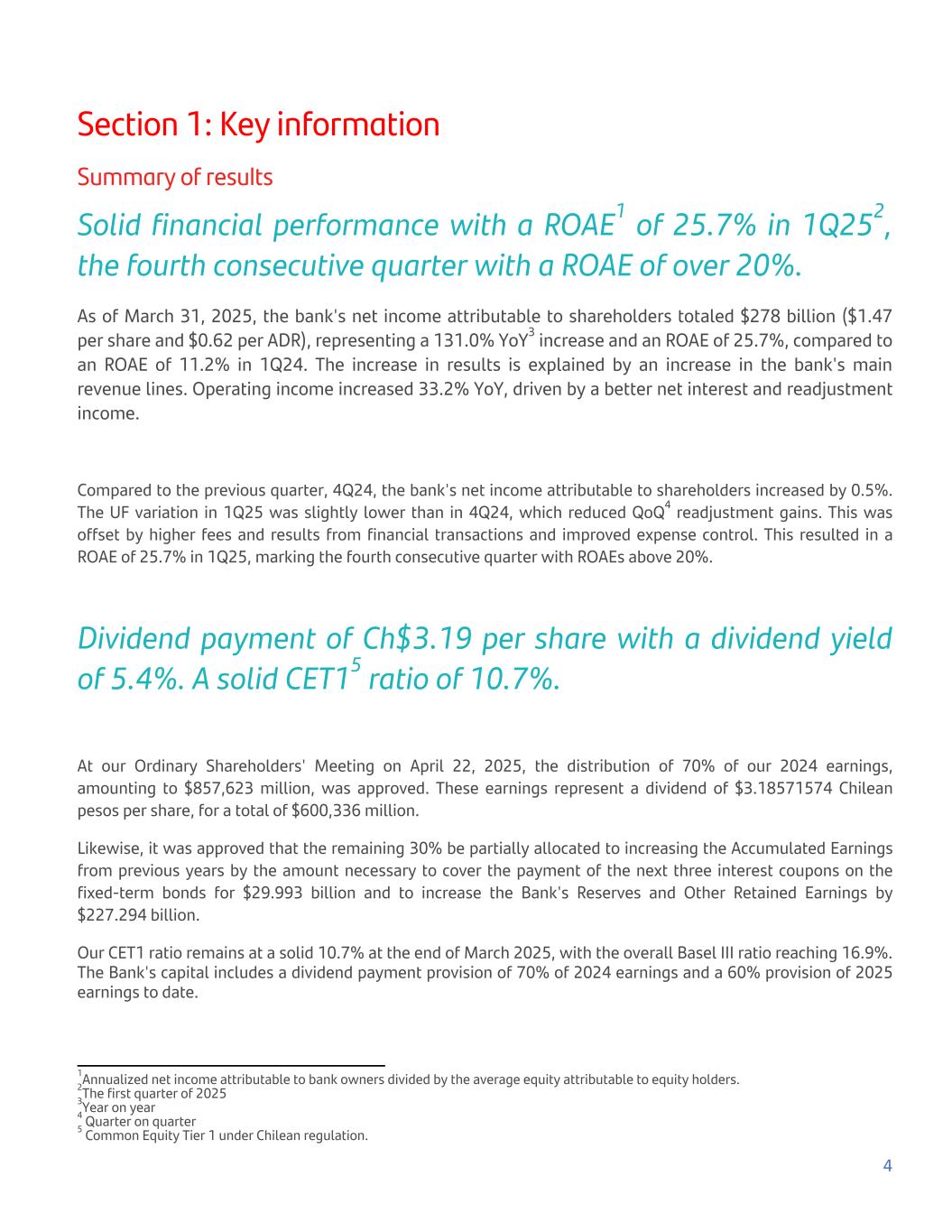 Section 1: Key information Summary of results Solid financial performance with a ROAE1 of 25.7% in 1Q252, the fourth consecutive quarter with a ROAE of over 20%. As of March 31, 2025, the bank's net income attributable to shareholders totaled $278 billion ($1.47 per share and $0.62 per ADR), representing a 131.0% YoY3 increase and an ROAE of 25.7%, compared to an ROAE of 11.2% in 1Q24. The increase in results is explained by an increase in the bank's main revenue lines. Operating income increased 33.2% YoY, driven by a better net interest and readjustment income. Compared to the previous quarter, 4Q24, the bank's net income attributable to shareholders increased by 0.5%. The UF variation in 1Q25 was slightly lower than in 4Q24, which reduced QoQ4 readjustment gains. This was offset by higher fees and results from financial transactions and improved expense control. This resulted in a ROAE of 25.7% in 1Q25, marking the fourth consecutive quarter with ROAEs above 20%. Dividend payment of Ch$3.19 per share with a dividend yield of 5.4%. A solid CET15 ratio of 10.7%. At our Ordinary Shareholders' Meeting on April 22, 2025, the distribution of 70% of our 2024 earnings, amounting to $857,623 million, was approved. These earnings represent a dividend of $3.18571574 Chilean pesos per share, for a total of $600,336 million. Likewise, it was approved that the remaining 30% be partially allocated to increasing the Accumulated Earnings from previous years by the amount necessary to cover the payment of the next three interest coupons on the fixed-term bonds for $29.993 billion and to increase the Bank's Reserves and Other Retained Earnings by $227.294 billion. Our CET1 ratio remains at a solid 10.7% at the end of March 2025, with the overall Basel III ratio reaching 16.9%. The Bank's capital includes a dividend payment provision of 70% of 2024 earnings and a 60% provision of 2025 earnings to date. 4 1Annualized net income attributable to bank owners divided by the average equity attributable to equity holders.2The first quarter of 20253Year on year4 Quarter on quarter5 Common Equity Tier 1 under Chilean regulation.
