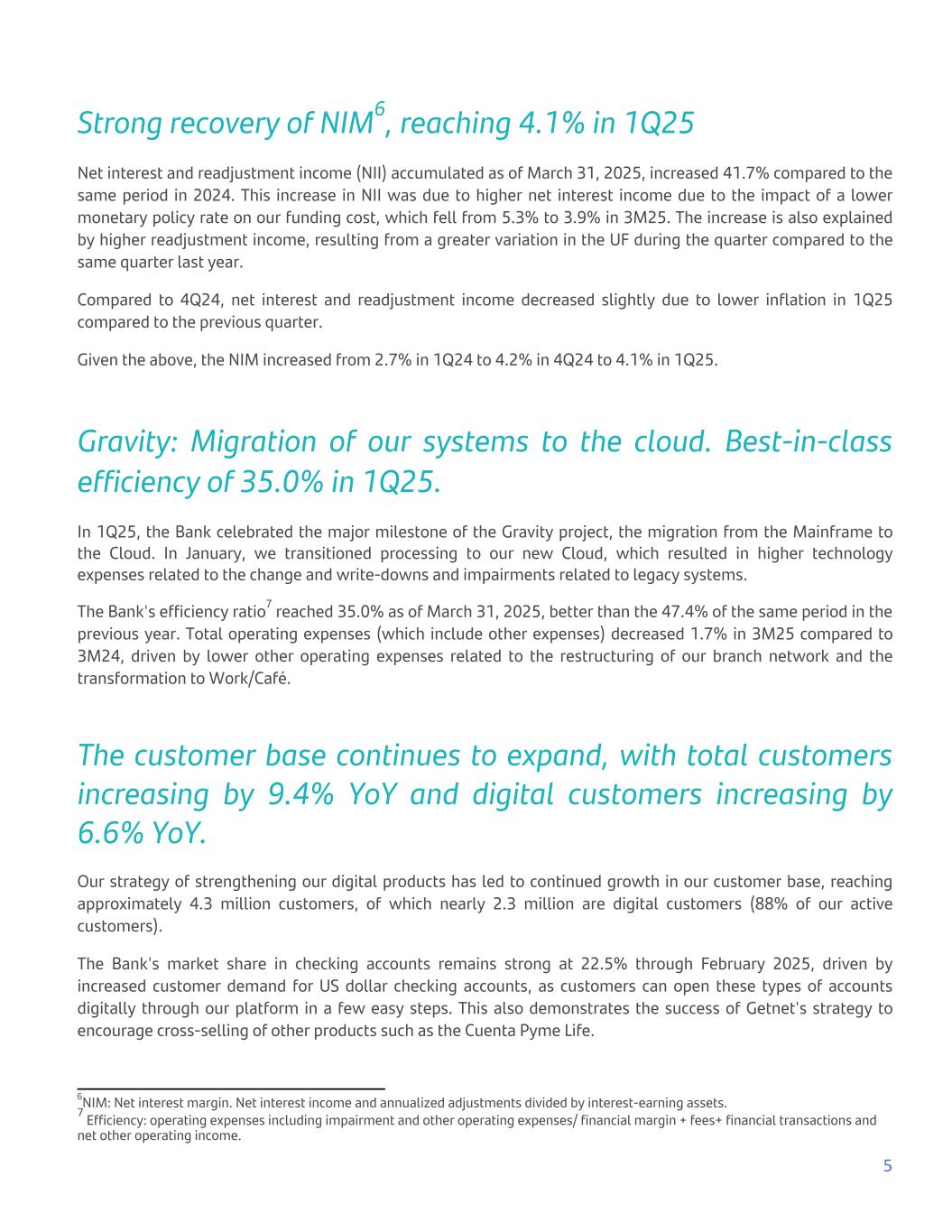 Strong recovery of NIM6, reaching 4.1% in 1Q25 Net interest and readjustment income (NII) accumulated as of March 31, 2025, increased 41.7% compared to the same period in 2024. This increase in NII was due to higher net interest income due to the impact of a lower monetary policy rate on our funding cost, which fell from 5.3% to 3.9% in 3M25. The increase is also explained by higher readjustment income, resulting from a greater variation in the UF during the quarter compared to the same quarter last year. Compared to 4Q24, net interest and readjustment income decreased slightly due to lower inflation in 1Q25 compared to the previous quarter. Given the above, the NIM increased from 2.7% in 1Q24 to 4.2% in 4Q24 to 4.1% in 1Q25. Gravity: Migration of our systems to the cloud. Best-in-class efficiency of 35.0% in 1Q25. In 1Q25, the Bank celebrated the major milestone of the Gravity project, the migration from the Mainframe to the Cloud. In January, we transitioned processing to our new Cloud, which resulted in higher technology expenses related to the change and write-downs and impairments related to legacy systems. The Bank's efficiency ratio7 reached 35.0% as of March 31, 2025, better than the 47.4% of the same period in the previous year. Total operating expenses (which include other expenses) decreased 1.7% in 3M25 compared to 3M24, driven by lower other operating expenses related to the restructuring of our branch network and the transformation to Work/Café. The customer base continues to expand, with total customers increasing by 9.4% YoY and digital customers increasing by 6.6% YoY. Our strategy of strengthening our digital products has led to continued growth in our customer base, reaching approximately 4.3 million customers, of which nearly 2.3 million are digital customers (88% of our active customers). The Bank's market share in checking accounts remains strong at 22.5% through February 2025, driven by increased customer demand for US dollar checking accounts, as customers can open these types of accounts digitally through our platform in a few easy steps. This also demonstrates the success of Getnet's strategy to encourage cross-selling of other products such as the Cuenta Pyme Life. 5 6NIM: Net interest margin. Net interest income and annualized adjustments divided by interest-earning assets. 7 Efficiency: operating expenses including impairment and other operating expenses/ financial margin + fees+ financial transactions and net other operating income.