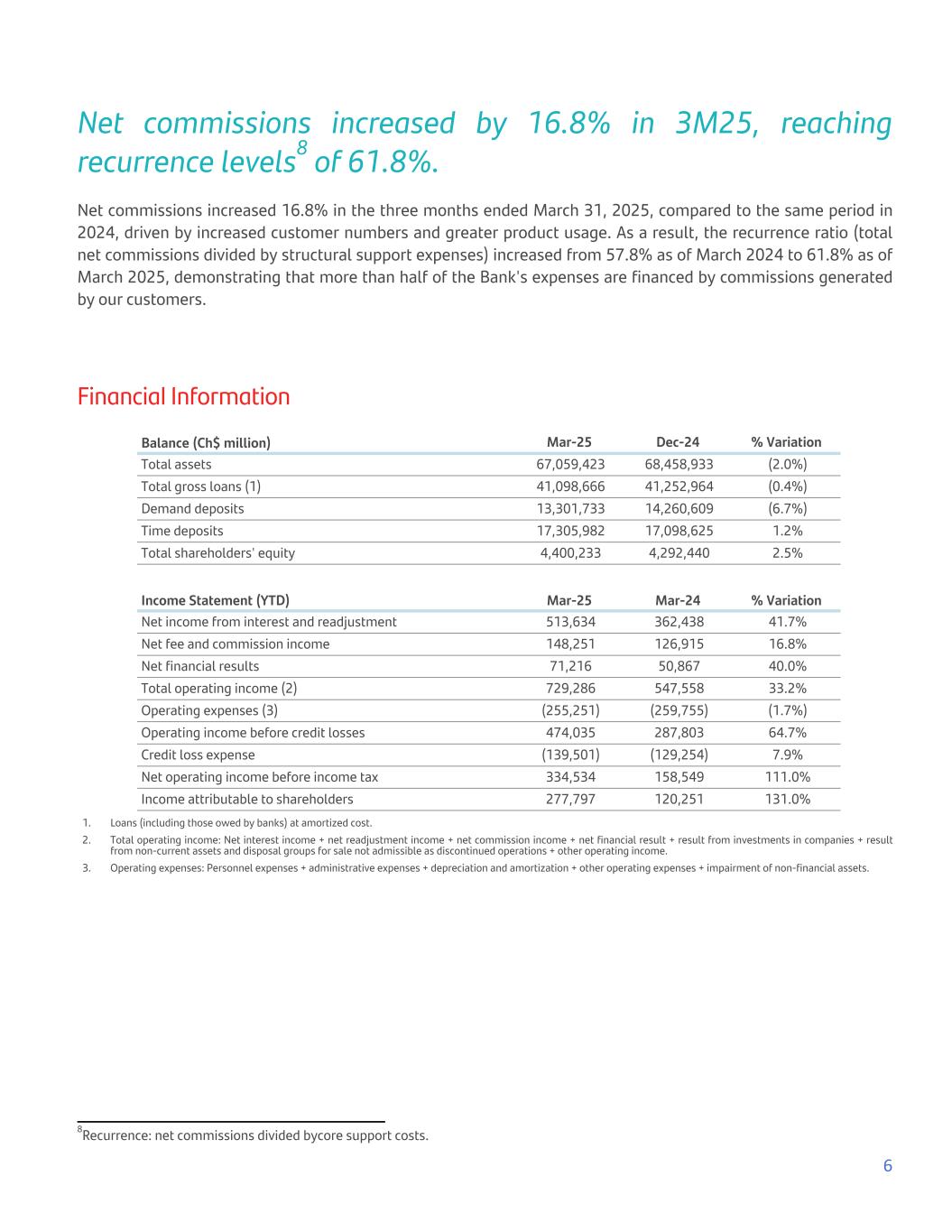 Net commissions increased by 16.8% in 3M25, reaching recurrence levels8 of 61.8%. Net commissions increased 16.8% in the three months ended March 31, 2025, compared to the same period in 2024, driven by increased customer numbers and greater product usage. As a result, the recurrence ratio (total net commissions divided by structural support expenses) increased from 57.8% as of March 2024 to 61.8% as of March 2025, demonstrating that more than half of the Bank's expenses are financed by commissions generated by our customers. Financial Information Balance (Ch$ million) Mar-25 Dec-24 % Variation Total assets 67,059,423 68,458,933 (2.0%) Total gross loans (1) 41,098,666 41,252,964 (0.4%) Demand deposits 13,301,733 14,260,609 (6.7%) Time deposits 17,305,982 17,098,625 1.2% Total shareholders' equity 4,400,233 4,292,440 2.5% Income Statement (YTD) Mar-25 Mar-24 % Variation Net income from interest and readjustment 513,634 362,438 41.7% Net fee and commission income 148,251 126,915 16.8% Net financial results 71,216 50,867 40.0% Total operating income (2) 729,286 547,558 33.2% Operating expenses (3) (255,251) (259,755) (1.7%) Operating income before credit losses 474,035 287,803 64.7% Credit loss expense (139,501) (129,254) 7.9% Net operating income before income tax 334,534 158,549 111.0% Income attributable to shareholders 277,797 120,251 131.0% 1. Loans (including those owed by banks) at amortized cost. 2. Total operating income: Net interest income + net readjustment income + net commission income + net financial result + result from investments in companies + result from non-current assets and disposal groups for sale not admissible as discontinued operations + other operating income. 3. Operating expenses: Personnel expenses + administrative expenses + depreciation and amortization + other operating expenses + impairment of non-financial assets. 6 8Recurrence: net commissions divided bycore support costs.