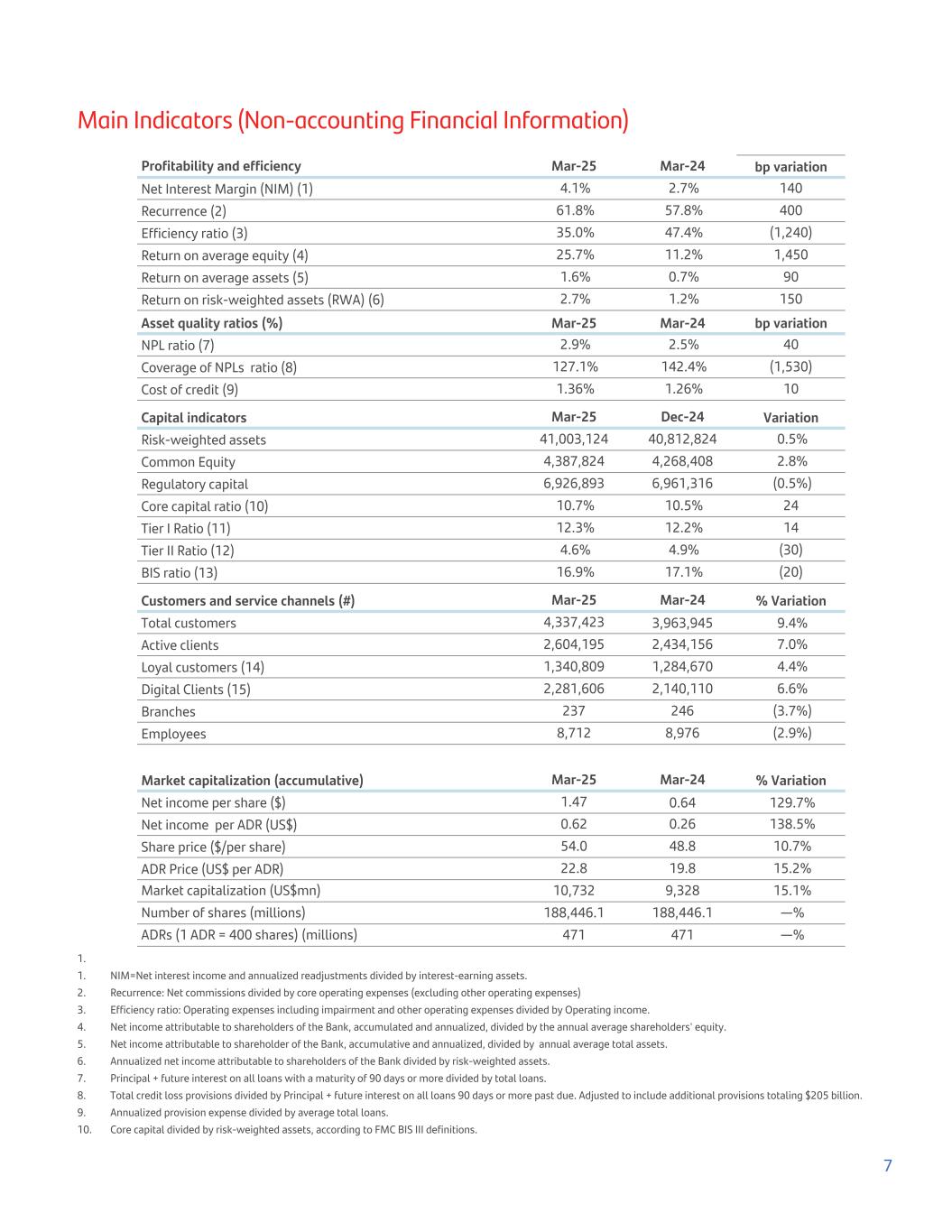 Main Indicators (Non-accounting Financial Information) Profitability and efficiency Mar-25 Mar-24 bp variation Net Interest Margin (NIM) (1) 4.1% 2.7% 140 Recurrence (2) 61.8% 57.8% 400 Efficiency ratio (3) 35.0% 47.4% (1,240) Return on average equity (4) 25.7% 11.2% 1,450 Return on average assets (5) 1.6% 0.7% 90 Return on risk-weighted assets (RWA) (6) 2.7% 1.2% 150 Asset quality ratios (%) Mar-25 Mar-24 bp variation NPL ratio (7) 2.9% 2.5% 40 Coverage of NPLs ratio (8) 127.1% 142.4% (1,530) Cost of credit (9) 1.36% 1.26% 10 Capital indicators Mar-25 Dec-24 Variation Risk-weighted assets 41,003,124 40,812,824 0.5% Common Equity 4,387,824 4,268,408 2.8% Regulatory capital 6,926,893 6,961,316 (0.5%) Core capital ratio (10) 10.7% 10.5% 24 Tier I Ratio (11) 12.3% 12.2% 14 Tier II Ratio (12) 4.6% 4.9% (30) BIS ratio (13) 16.9% 17.1% (20) Customers and service channels (#) Mar-25 Mar-24 % Variation Total customers 4,337,423 3,963,945 9.4% Active clients 2,604,195 2,434,156 7.0% Loyal customers (14) 1,340,809 1,284,670 4.4% Digital Clients (15) 2,281,606 2,140,110 6.6% Branches 237 246 (3.7%) Employees 8,712 8,976 (2.9%) Market capitalization (accumulative) Mar-25 Mar-24 % Variation Net income per share ($) 1.47 0.64 129.7% Net income per ADR (US$) 0.62 0.26 138.5% Share price ($/per share) 54.0 48.8 10.7% ADR Price (US$ per ADR) 22.8 19.8 15.2% Market capitalization (US$mn) 10,732 9,328 15.1% Number of shares (millions) 188,446.1 188,446.1 —% ADRs (1 ADR = 400 shares) (millions) 471 471 —% 1. 1. NIM=Net interest income and annualized readjustments divided by interest-earning assets. 2. Recurrence: Net commissions divided by core operating expenses (excluding other operating expenses) 3. Efficiency ratio: Operating expenses including impairment and other operating expenses divided by Operating income. 4. Net income attributable to shareholders of the Bank, accumulated and annualized, divided by the annual average shareholders' equity. 5. Net income attributable to shareholder of the Bank, accumulative and annualized, divided by annual average total assets. 6. Annualized net income attributable to shareholders of the Bank divided by risk-weighted assets. 7. Principal + future interest on all loans with a maturity of 90 days or more divided by total loans. 8. Total credit loss provisions divided by Principal + future interest on all loans 90 days or more past due. Adjusted to include additional provisions totaling $205 billion. 9. Annualized provision expense divided by average total loans. 10. Core capital divided by risk-weighted assets, according to FMC BIS III definitions. 7