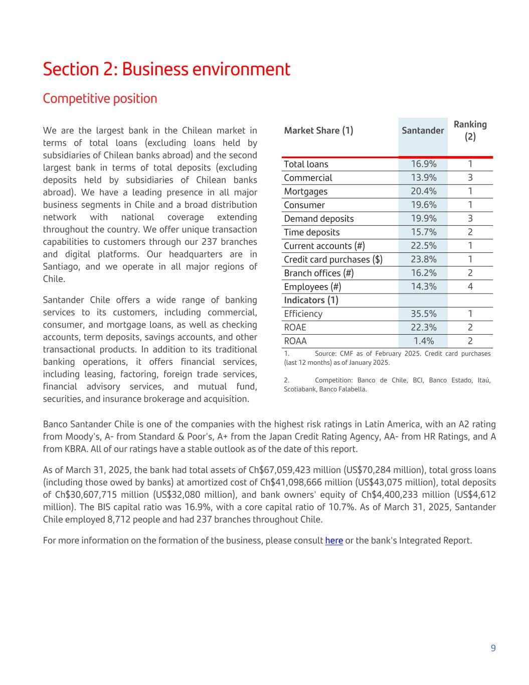 Section 2: Business environment Competitive position We are the largest bank in the Chilean market in terms of total loans (excluding loans held by subsidiaries of Chilean banks abroad) and the second largest bank in terms of total deposits (excluding deposits held by subsidiaries of Chilean banks abroad). We have a leading presence in all major business segments in Chile and a broad distribution network with national coverage extending throughout the country. We offer unique transaction capabilities to customers through our 237 branches and digital platforms. Our headquarters are in Santiago, and we operate in all major regions of Chile. Santander Chile offers a wide range of banking services to its customers, including commercial, consumer, and mortgage loans, as well as checking accounts, term deposits, savings accounts, and other transactional products. In addition to its traditional banking operations, it offers financial services, including leasing, factoring, foreign trade services, financial advisory services, and mutual fund, securities, and insurance brokerage and acquisition. Market Share (1) Santander Ranking (2) Total loans 16.9% 1 Commercial 13.9% 3 Mortgages 20.4% 1 Consumer 19.6% 1 Demand deposits 19.9% 3 Time deposits 15.7% 2 Current accounts (#) 22.5% 1 Credit card purchases ($) 23.8% 1 Branch offices (#) 16.2% 2 Employees (#) 14.3% 4 Indicators (1) Efficiency 35.5% 1 ROAE 22.3% 2 ROAA 1.4% 2 1. Source: CMF as of February 2025. Credit card purchases (last 12 months) as of January 2025. 2. Competition: Banco de Chile, BCI, Banco Estado, Itaú, Scotiabank, Banco Falabella. Banco Santander Chile is one of the companies with the highest risk ratings in Latin America, with an A2 rating from Moody's, A- from Standard & Poor's, A+ from the Japan Credit Rating Agency, AA- from HR Ratings, and A from KBRA. All of our ratings have a stable outlook as of the date of this report. As of March 31, 2025, the bank had total assets of Ch$67,059,423 million (US$70,284 million), total gross loans (including those owed by banks) at amortized cost of Ch$41,098,666 million (US$43,075 million), total deposits of Ch$30,607,715 million (US$32,080 million), and bank owners' equity of Ch$4,400,233 million (US$4,612 million). The BIS capital ratio was 16.9%, with a core capital ratio of 10.7%. As of March 31, 2025, Santander Chile employed 8,712 people and had 237 branches throughout Chile. For more information on the formation of the business, please consult here or the bank's Integrated Report. 9