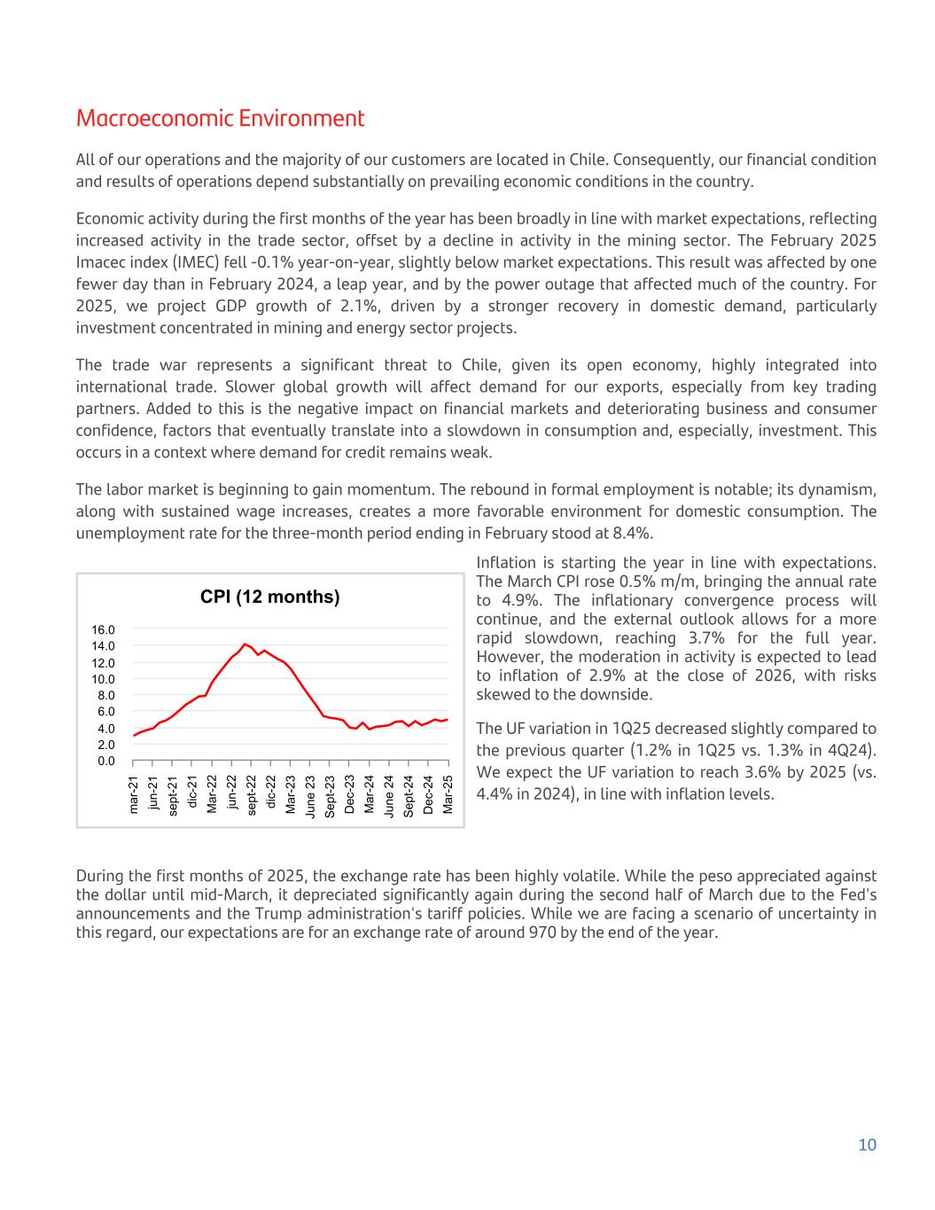 Macroeconomic Environment All of our operations and the majority of our customers are located in Chile. Consequently, our financial condition and results of operations depend substantially on prevailing economic conditions in the country. Economic activity during the first months of the year has been broadly in line with market expectations, reflecting increased activity in the trade sector, offset by a decline in activity in the mining sector. The February 2025 Imacec index (IMEC) fell -0.1% year-on-year, slightly below market expectations. This result was affected by one fewer day than in February 2024, a leap year, and by the power outage that affected much of the country. For 2025, we project GDP growth of 2.1%, driven by a stronger recovery in domestic demand, particularly investment concentrated in mining and energy sector projects. The trade war represents a significant threat to Chile, given its open economy, highly integrated into international trade. Slower global growth will affect demand for our exports, especially from key trading partners. Added to this is the negative impact on financial markets and deteriorating business and consumer confidence, factors that eventually translate into a slowdown in consumption and, especially, investment. This occurs in a context where demand for credit remains weak. The labor market is beginning to gain momentum. The rebound in formal employment is notable; its dynamism, along with sustained wage increases, creates a more favorable environment for domestic consumption. The unemployment rate for the three-month period ending in February stood at 8.4%. CPI (12 months) m ar -2 1 ju n- 21 se pt -2 1 di c- 21 M ar -2 2 ju n- 22 se pt -2 2 di c- 22 M ar -2 3 Ju ne 2 3 S ep t-2 3 D ec -2 3 M ar -2 4 Ju ne 2 4 S ep t-2 4 D ec -2 4 M ar -2 5 0.0 2.0 4.0 6.0 8.0 10.0 12.0 14.0 16.0 Inflation is starting the year in line with expectations. The March CPI rose 0.5% m/m, bringing the annual rate to 4.9%. The inflationary convergence process will continue, and the external outlook allows for a more rapid slowdown, reaching 3.7% for the full year. However, the moderation in activity is expected to lead to inflation of 2.9% at the close of 2026, with risks skewed to the downside. The UF variation in 1Q25 decreased slightly compared to the previous quarter (1.2% in 1Q25 vs. 1.3% in 4Q24). We expect the UF variation to reach 3.6% by 2025 (vs. 4.4% in 2024), in line with inflation levels. During the first months of 2025, the exchange rate has been highly volatile. While the peso appreciated against the dollar until mid-March, it depreciated significantly again during the second half of March due to the Fed's announcements and the Trump administration's tariff policies. While we are facing a scenario of uncertainty in this regard, our expectations are for an exchange rate of around 970 by the end of the year. 10