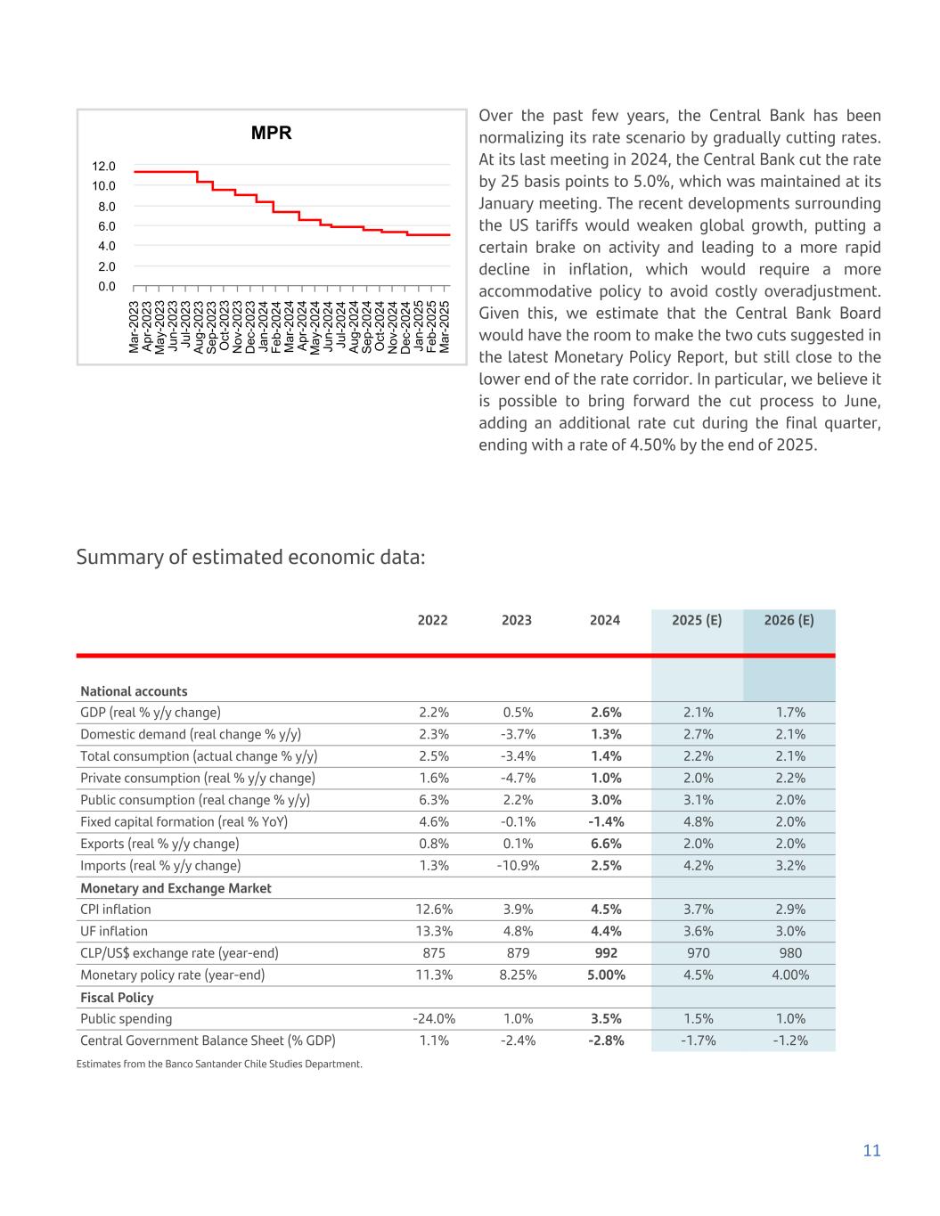 MPR M ar -2 02 3 A pr -2 02 3 M ay -2 02 3 Ju n- 20 23 Ju l-2 02 3 A ug -2 02 3 S ep -2 02 3 O ct -2 02 3 N ov -2 02 3 D ec -2 02 3 Ja n- 20 24 Fe b- 20 24 M ar -2 02 4 A pr -2 02 4 M ay -2 02 4 Ju n- 20 24 Ju l-2 02 4 A ug -2 02 4 S ep -2 02 4 O ct -2 02 4 N ov -2 02 4 D ec -2 02 4 Ja n- 20 25 Fe b- 20 25 M ar -2 02 5 0.0 2.0 4.0 6.0 8.0 10.0 12.0 Over the past few years, the Central Bank has been normalizing its rate scenario by gradually cutting rates. At its last meeting in 2024, the Central Bank cut the rate by 25 basis points to 5.0%, which was maintained at its January meeting. The recent developments surrounding the US tariffs would weaken global growth, putting a certain brake on activity and leading to a more rapid decline in inflation, which would require a more accommodative policy to avoid costly overadjustment. Given this, we estimate that the Central Bank Board would have the room to make the two cuts suggested in the latest Monetary Policy Report, but still close to the lower end of the rate corridor. In particular, we believe it is possible to bring forward the cut process to June, adding an additional rate cut during the final quarter, ending with a rate of 4.50% by the end of 2025. Summary of estimated economic data: 2022 2023 2024 2025 (E) 2026 (E) National accounts GDP (real % y/y change) 2.2% 0.5% 2.6% 2.1% 1.7% Domestic demand (real change % y/y) 2.3% -3.7% 1.3% 2.7% 2.1% Total consumption (actual change % y/y) 2.5% -3.4% 1.4% 2.2% 2.1% Private consumption (real % y/y change) 1.6% -4.7% 1.0% 2.0% 2.2% Public consumption (real change % y/y) 6.3% 2.2% 3.0% 3.1% 2.0% Fixed capital formation (real % YoY) 4.6% -0.1% -1.4% 4.8% 2.0% Exports (real % y/y change) 0.8% 0.1% 6.6% 2.0% 2.0% Imports (real % y/y change) 1.3% -10.9% 2.5% 4.2% 3.2% Monetary and Exchange Market CPI inflation 12.6% 3.9% 4.5% 3.7% 2.9% UF inflation 13.3% 4.8% 4.4% 3.6% 3.0% CLP/US$ exchange rate (year-end) 875 879 992 970 980 Monetary policy rate (year-end) 11.3% 8.25% 5.00% 4.5% 4.00% Fiscal Policy Public spending -24.0% 1.0% 3.5% 1.5% 1.0% Central Government Balance Sheet (% GDP) 1.1% -2.4% -2.8% -1.7% -1.2% Estimates from the Banco Santander Chile Studies Department. 11