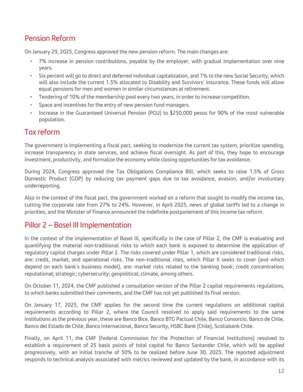 Pension Reform On January 29, 2025, Congress approved the new pension reform. The main changes are: • 7% increase in pension contributions, payable by the employer, with gradual implementation over nine years. • Six percent will go to direct and deferred individual capitalization, and 1% to the new Social Security, which will also include the current 1.5% allocated to Disability and Survivors' Insurance. These funds will allow equal pensions for men and women in similar circumstances at retirement. • Tendering of 10% of the membership pool every two years, in order to increase competition. • Space and incentives for the entry of new pension fund managers. • Increase in the Guaranteed Universal Pension (PGU) to $250,000 pesos for 90% of the most vulnerable population. Tax reform The government is implementing a fiscal pact, seeking to modernize the current tax system, prioritize spending, increase transparency in state services, and achieve fiscal oversight. As part of this, they hope to encourage investment, productivity, and formalize the economy while closing opportunities for tax avoidance. During 2024, Congress approved the Tax Obligations Compliance Bill, which seeks to raise 1.5% of Gross Domestic Product (GDP) by reducing tax payment gaps due to tax avoidance, evasion, and/or involuntary underreporting. Also in the context of the fiscal pact, the government worked on a reform that sought to modify the income tax, cutting the corporate rate from 27% to 24%. However, in April 2025, news of global tariffs led to a change in priorities, and the Minister of Finance announced the indefinite postponement of this income tax reform. Pillar 2 – Basel III Implementation In the context of the implementation of Basel III, specifically in the case of Pillar 2, the CMF is evaluating and quantifying the material non-traditional risks to which each bank is exposed to determine the application of regulatory capital charges under Pillar 2. The risks covered under Pillar 1, which are considered traditional risks, are: credit, market, and operational risks. The non-traditional risks, which Pillar II seeks to cover (and which depend on each bank's business model), are: market risks related to the banking book; credit concentration; reputational; strategic; cybersecurity; geopolitical; climate, among others. On October 11, 2024, the CMF published a consultation version of the Pillar 2 capital requirements regulations, to which banks submitted their comments, and the CMF has not yet published its final version. On January 17, 2025, the CMF applies for the second time the current regulations on additional capital requirements according to Pillar 2, where the Council resolved to apply said requirements to the same institutions as the previous year, these are Banco Bice, Banco BTG Pactual Chile, Banco Consorcio, Banco de Chile, Banco del Estado de Chile, Banco Internacional, Banco Security, HSBC Bank (Chile), Scotiabank Chile. Finally, on April 11, the CMF (Federal Commission for the Protection of Financial Institutions) resolved to establish a requirement of 25 basis points of total capital for Banco Santander Chile, which will be applied progressively, with an initial tranche of 50% to be realized before June 30, 2025. The reported adjustment responds to technical analysis associated with metrics reviewed and updated by the bank, in accordance with its 12