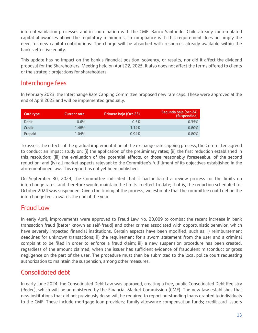 internal validation processes and in coordination with the CMF. Banco Santander Chile already contemplated capital allowances above the regulatory minimums, so compliance with this requirement does not imply the need for new capital contributions. The charge will be absorbed with resources already available within the bank's effective equity. This update has no impact on the bank's financial position, solvency, or results, nor did it affect the dividend proposal for the Shareholders' Meeting held on April 22, 2025. It also does not affect the terms offered to clients or the strategic projections for shareholders. Interchange fees In February 2023, the Interchange Rate Capping Committee proposed new rate caps. These were approved at the end of April 2023 and will be implemented gradually. Card type Current rate Primera baja (Oct-23) Segunda baja (oct-24) (Suspendida) Debit 0.6% 0.5% 0.35% Credit 1.48% 1.14% 0.80% Prepaid 1.04% 0.94% 0.80% To assess the effects of the gradual implementation of the exchange rate capping process, the Committee agreed to conduct an impact study on: (i) the application of the preliminary rates; (ii) the first reduction established in this resolution; (iii) the evaluation of the potential effects, or those reasonably foreseeable, of the second reduction; and (iv) all market aspects relevant to the Committee's fulfillment of its objectives established in the aforementioned law. This report has not yet been published. On September 30, 2024, the Committee indicated that it had initiated a review process for the limits on interchange rates, and therefore would maintain the limits in effect to date; that is, the reduction scheduled for October 2024 was suspended. Given the timing of the process, we estimate that the committee could define the interchange fees towards the end of the year. Fraud Law In early April, improvements were approved to Fraud Law No. 20,009 to combat the recent increase in bank transaction fraud (better known as self-fraud) and other crimes associated with opportunistic behavior, which have severely impacted financial institutions. Certain aspects have been modified, such as: i) reimbursement deadlines for unknown transactions; ii) the requirement for a sworn statement from the user and a criminal complaint to be filed in order to enforce a fraud claim; iii) a new suspension procedure has been created, regardless of the amount claimed, when the issuer has sufficient evidence of fraudulent misconduct or gross negligence on the part of the user. The procedure must then be submitted to the local police court requesting authorization to maintain the suspension, among other measures. Consolidated debt In early June 2024, the Consolidated Debt Law was approved, creating a free, public Consolidated Debt Registry (Redec), which will be administered by the Financial Market Commission (CMF). The new law establishes that new institutions that did not previously do so will be required to report outstanding loans granted to individuals to the CMF. These include mortgage loan providers; family allowance compensation funds; credit card issuers 13
